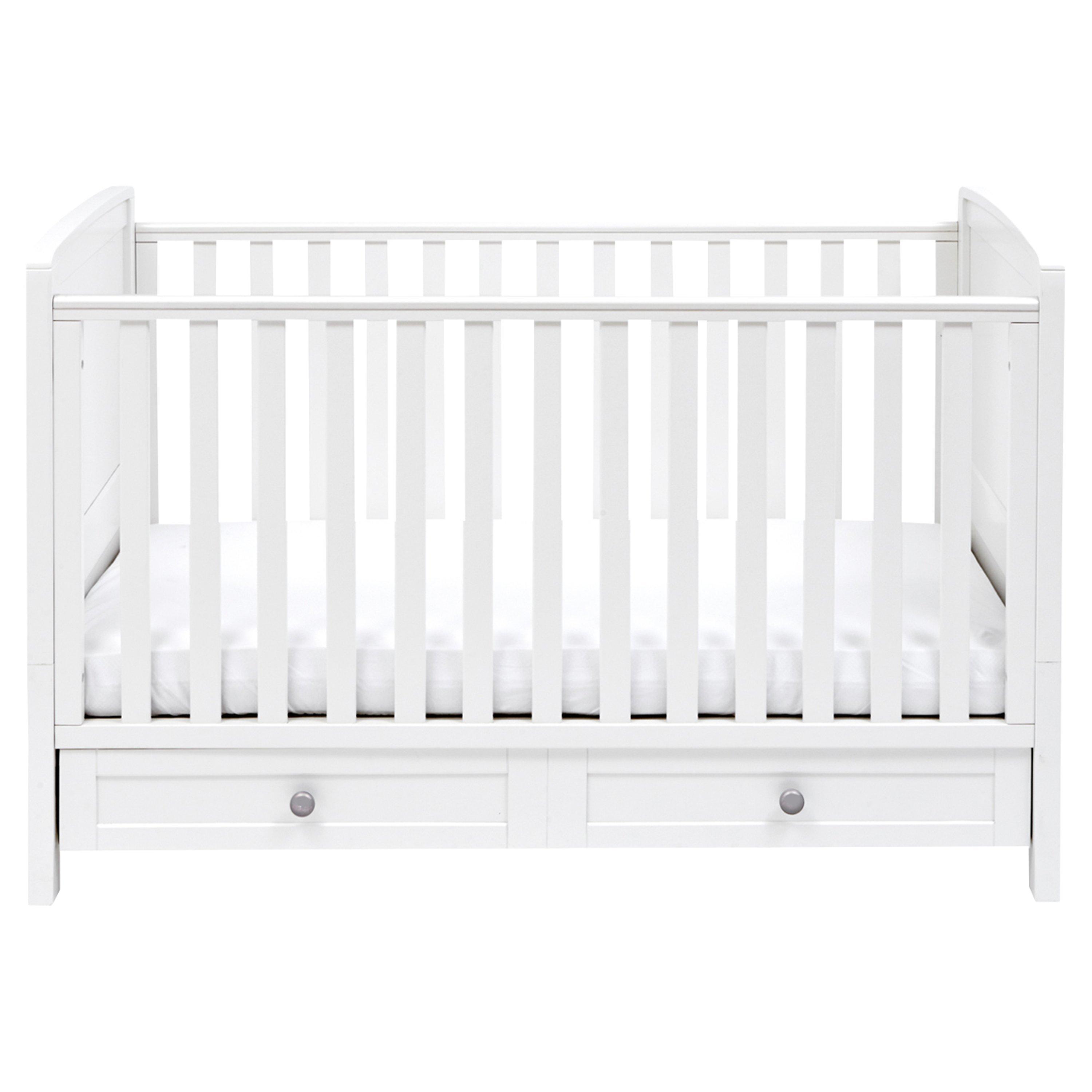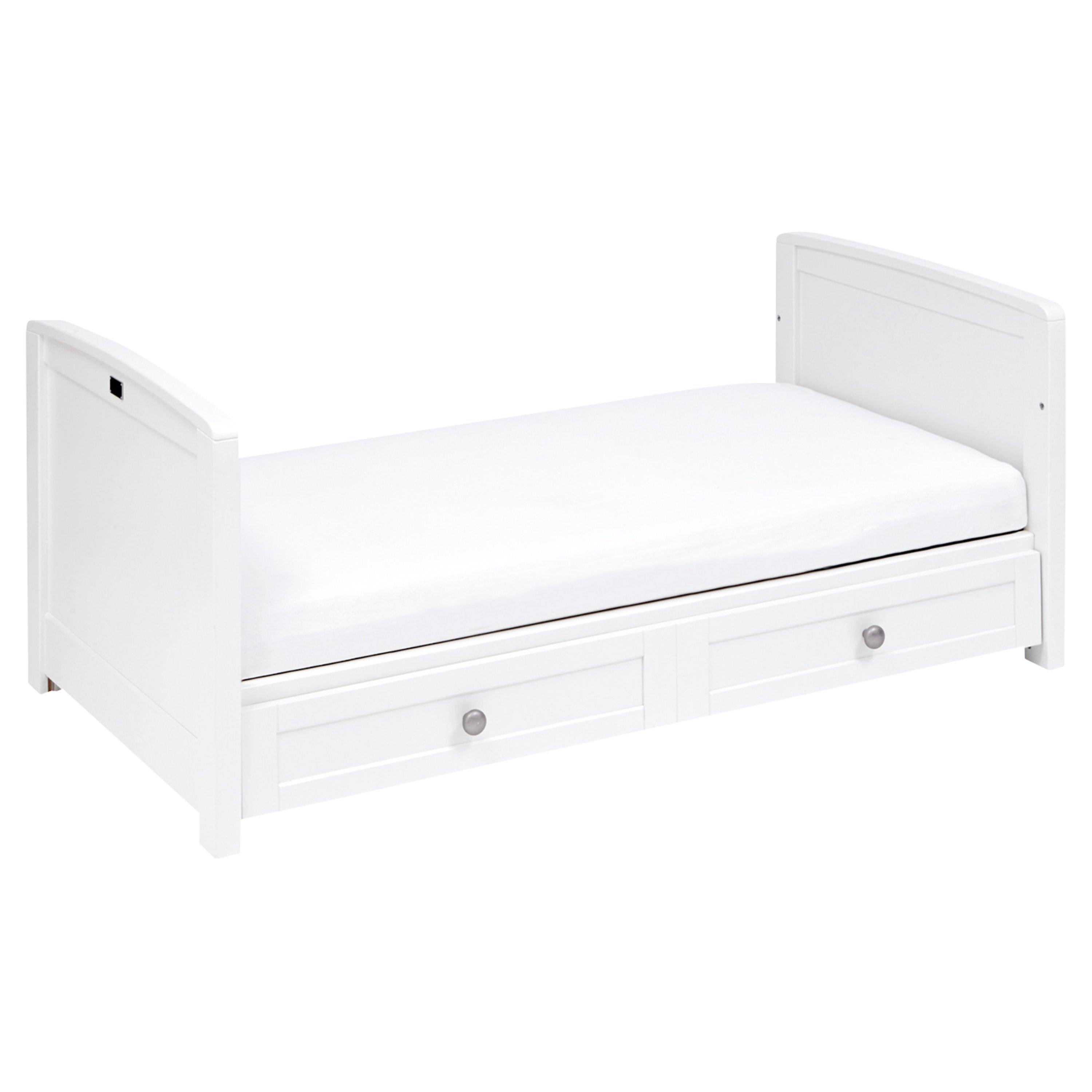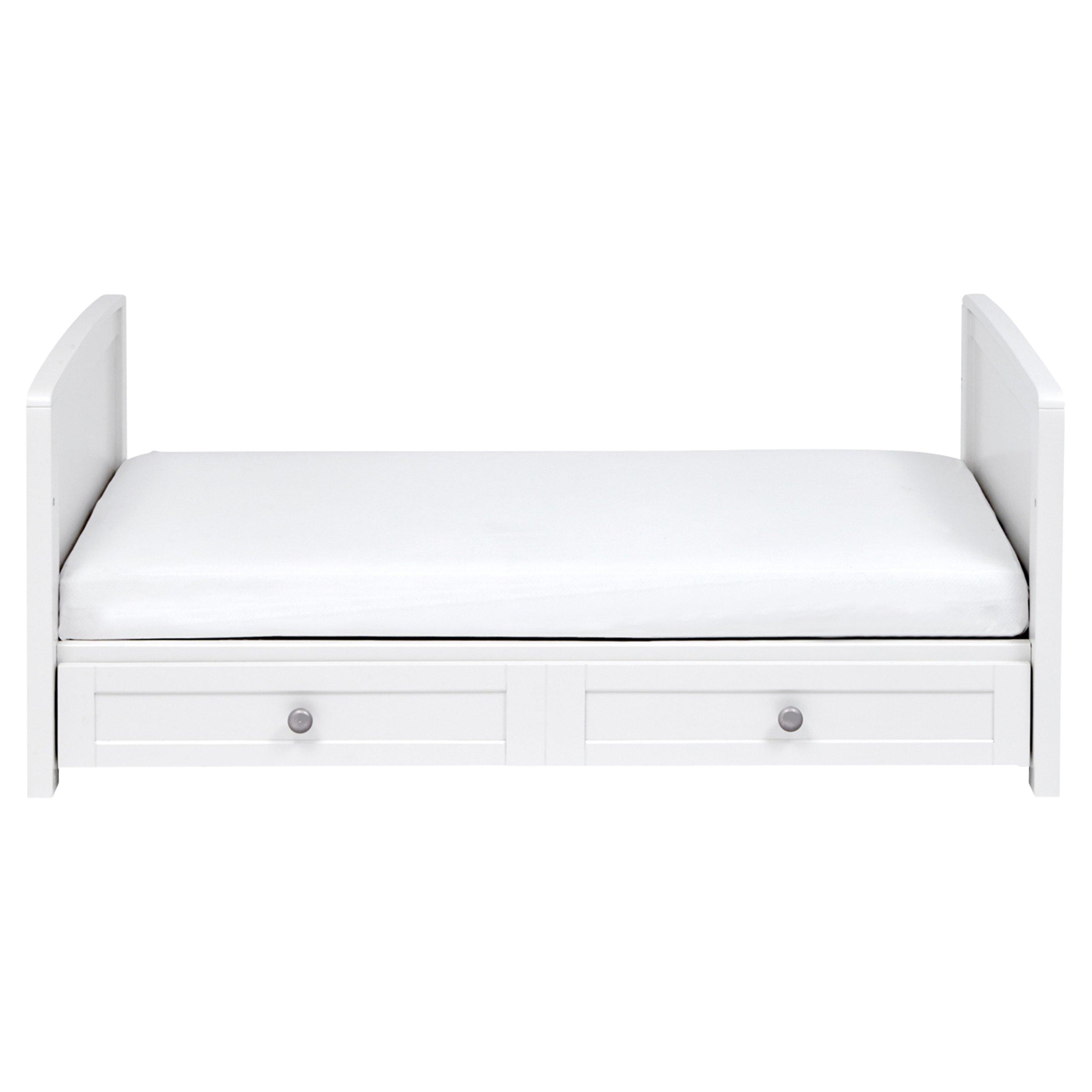 This cotbed easily converts into a comfortable junior bed, so it grows with your child. It features a generous full-length under bed drawer with two compartments for storage and baby-safe teething rails. This is for use with both the cot and junior bed modes.