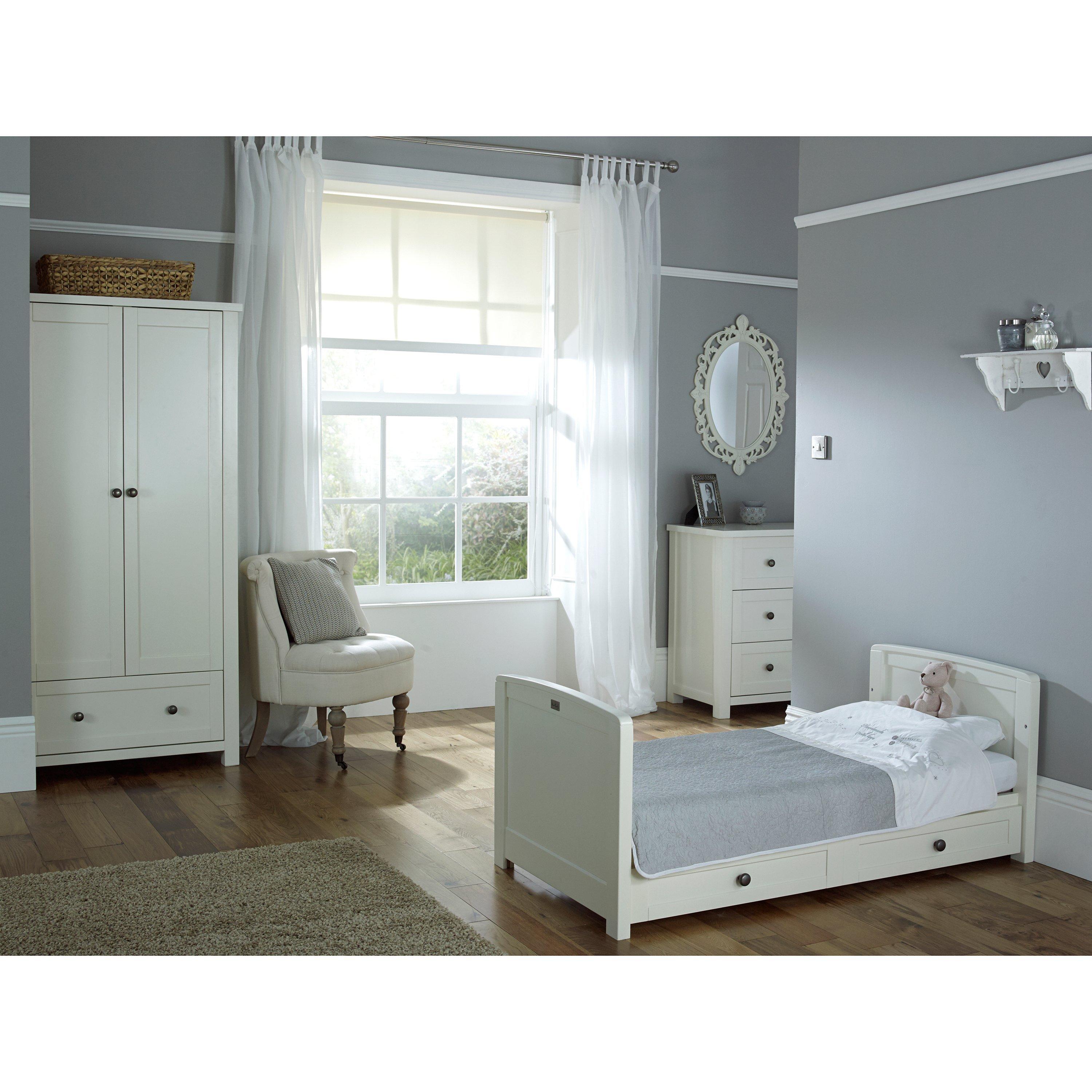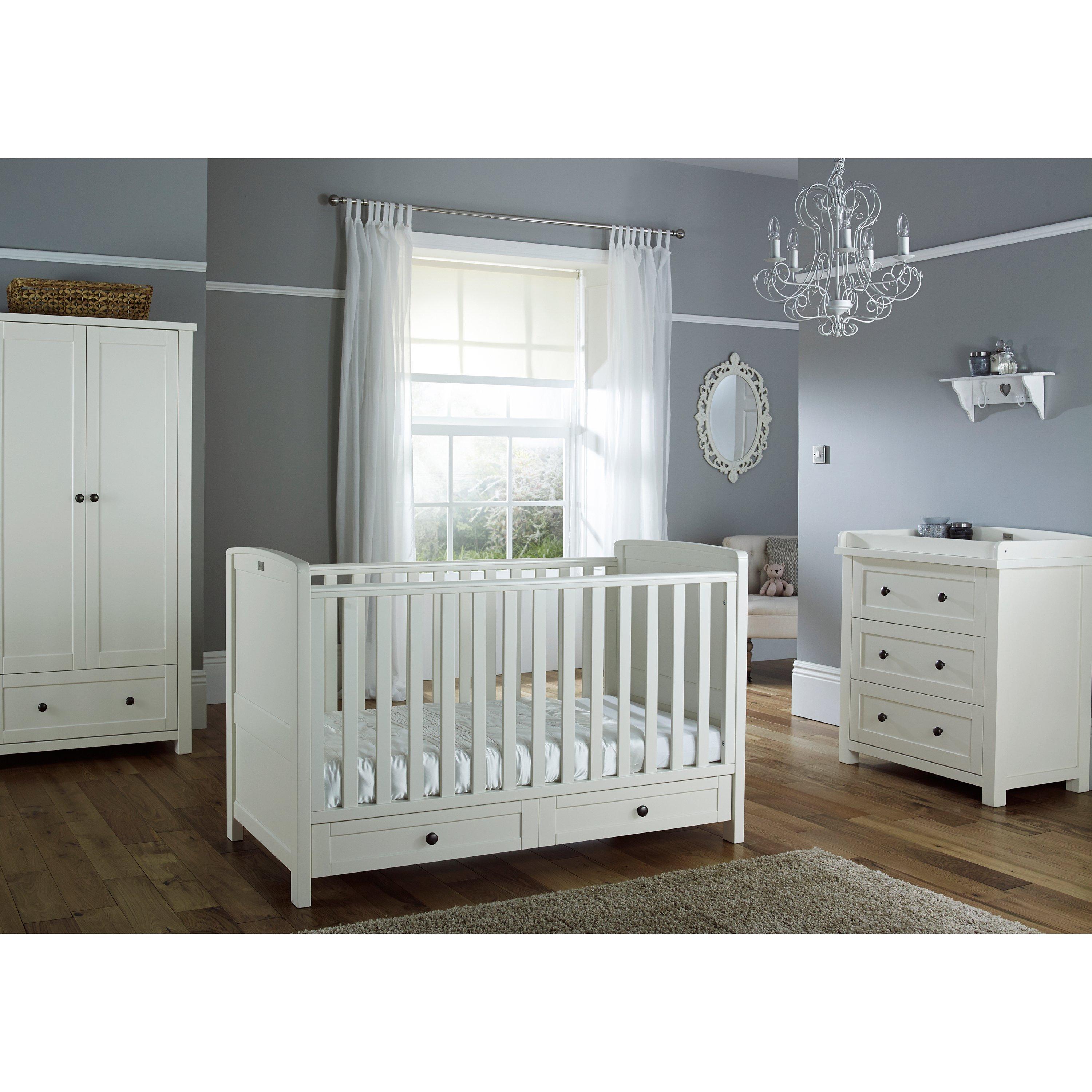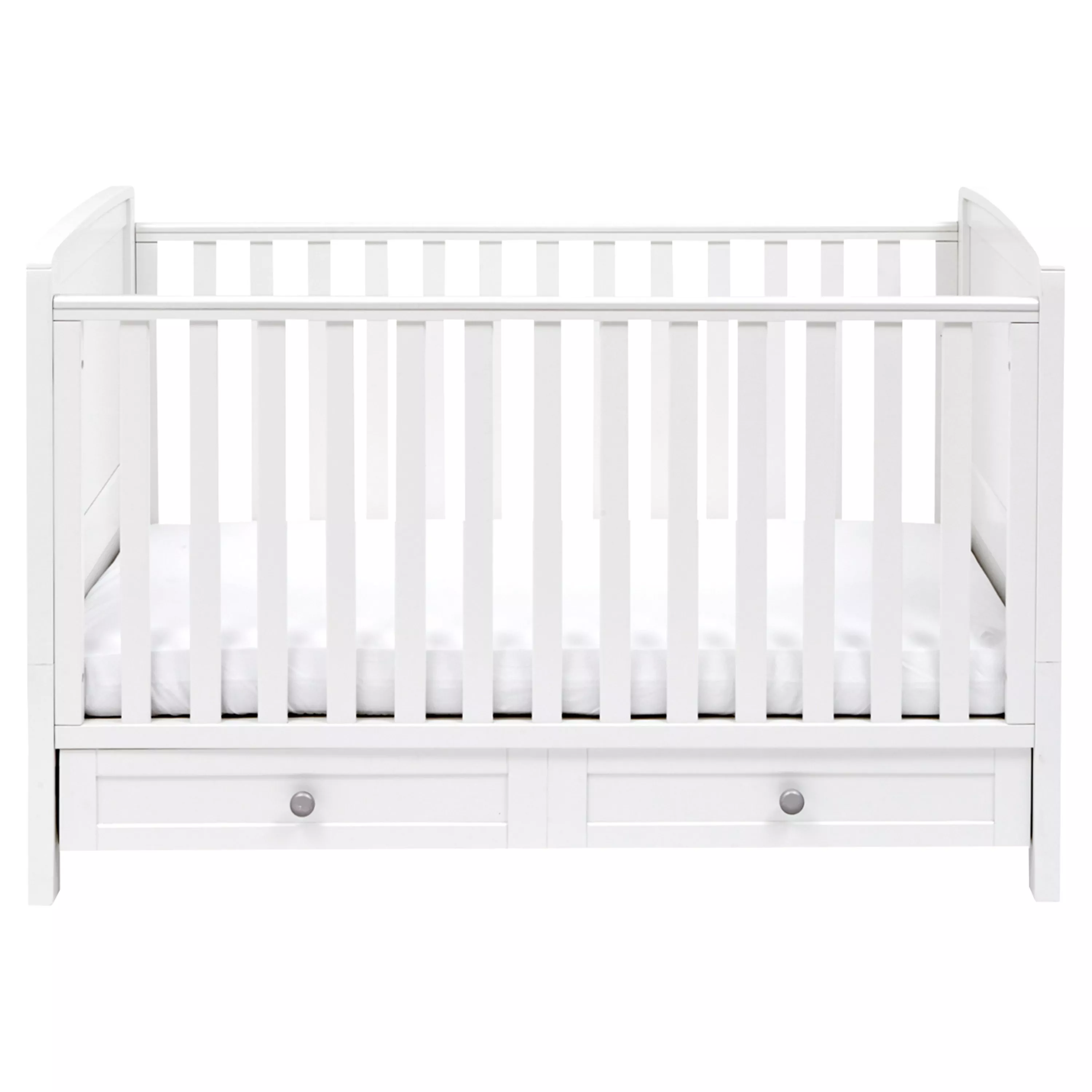 This cotbed easily converts into a comfortable junior bed, so it grows with your child. It features a generous full-length under bed drawer with two compartments for storage and baby-safe teething rails. This is for use with both the cot and junior bed modes.