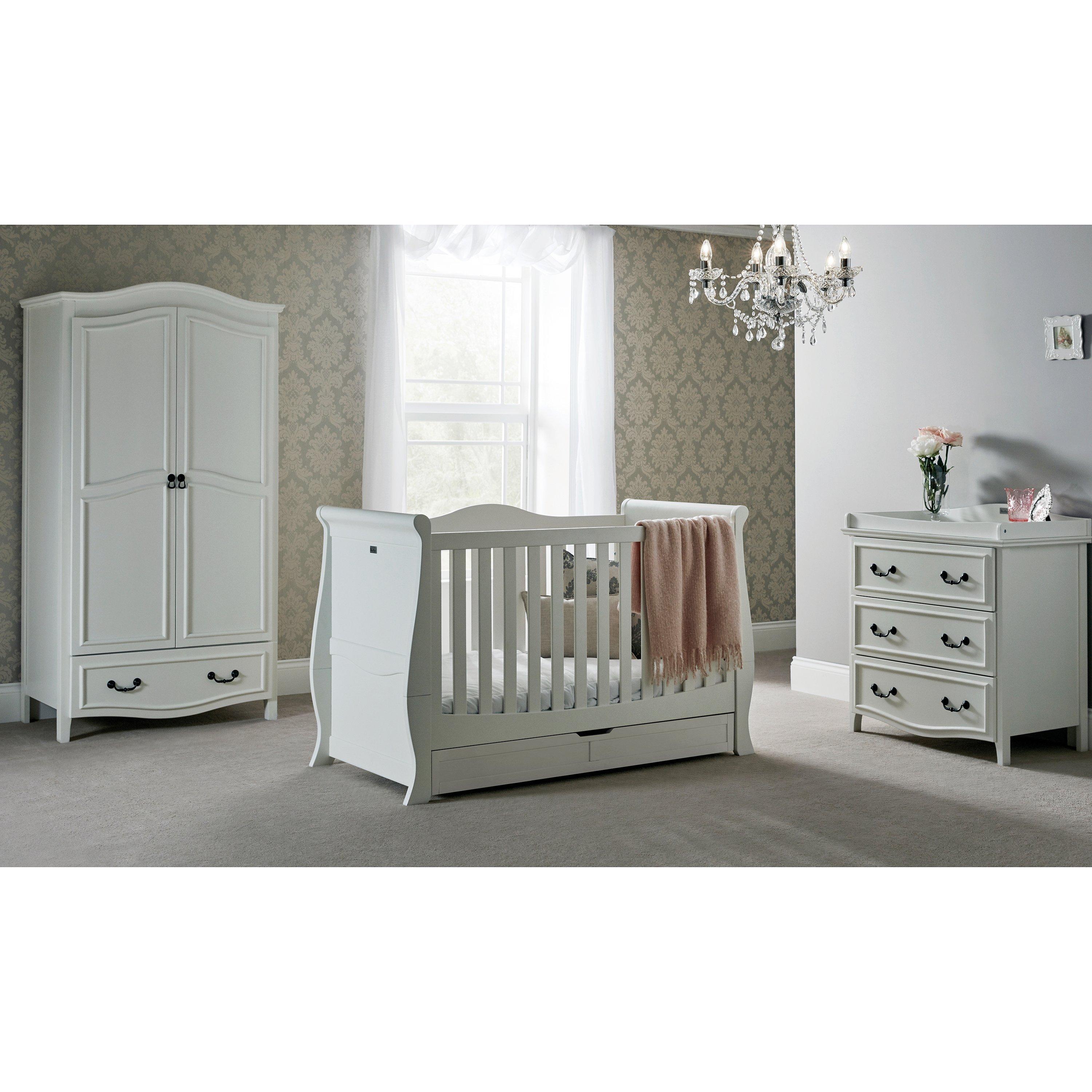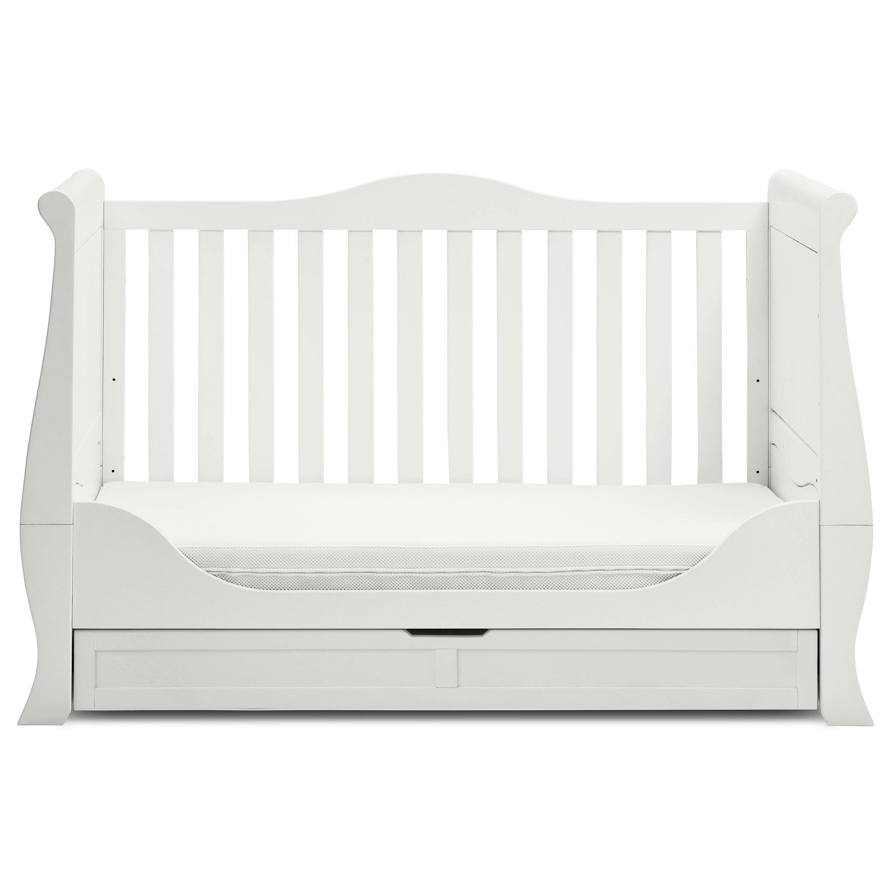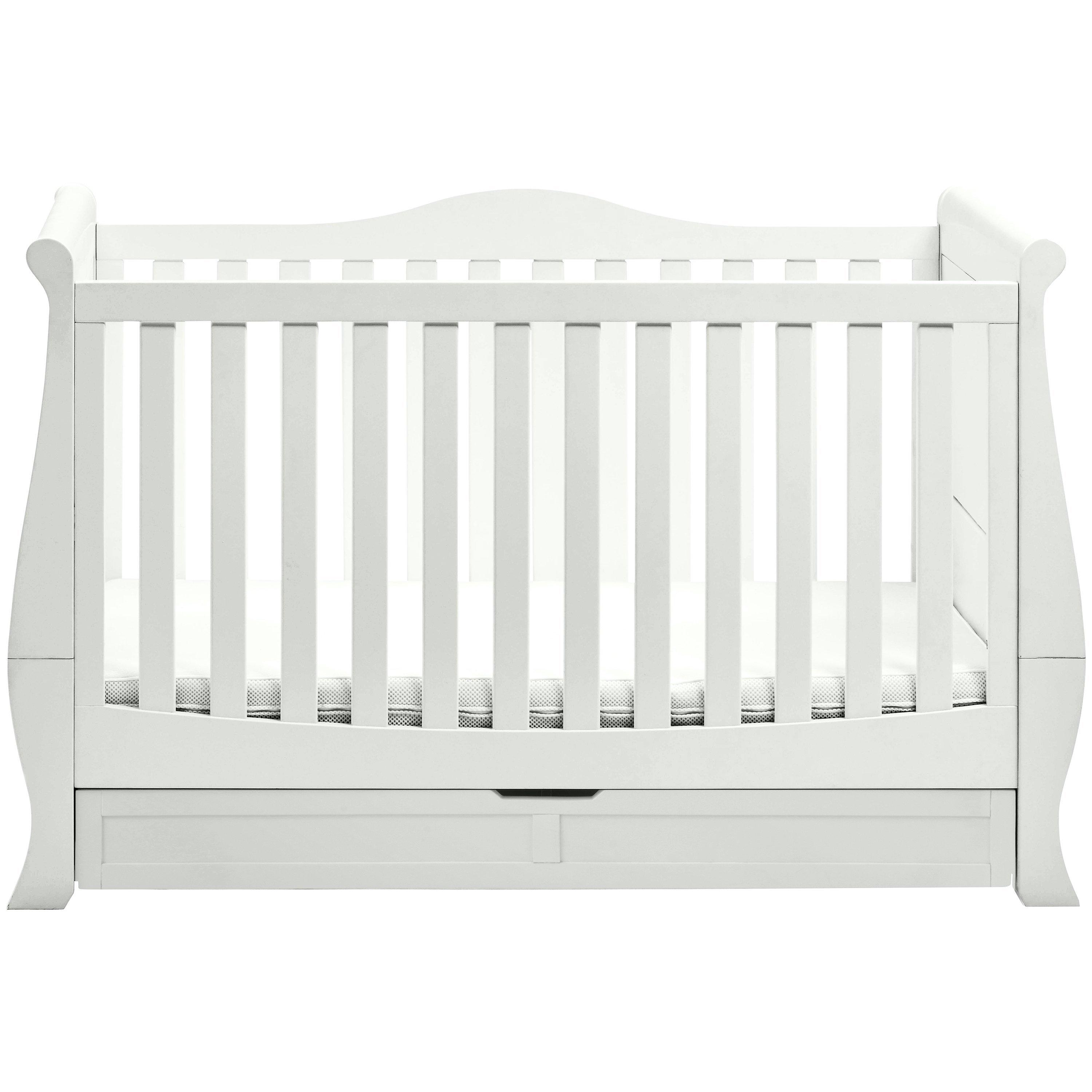 The sleigh cotbed features a deep drawer for under-bed storage in all 3 modes, and 3 adjustable base height positions to grow with your child. This cotbed can also sit with the Nostalgia range.