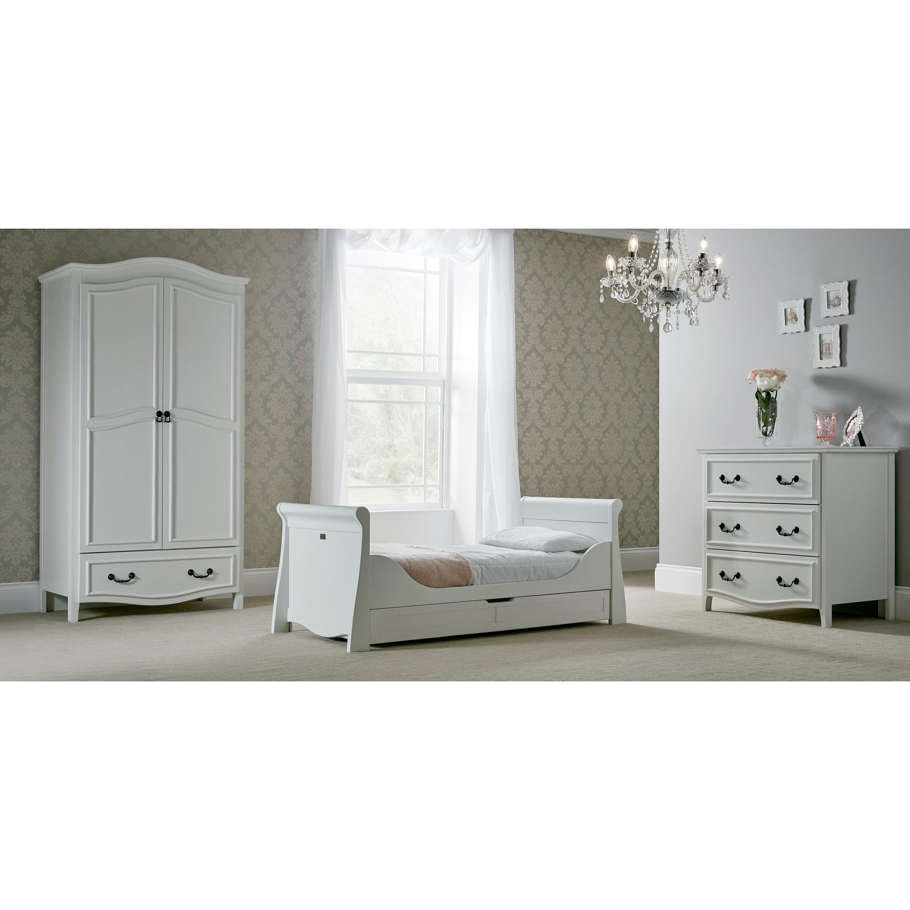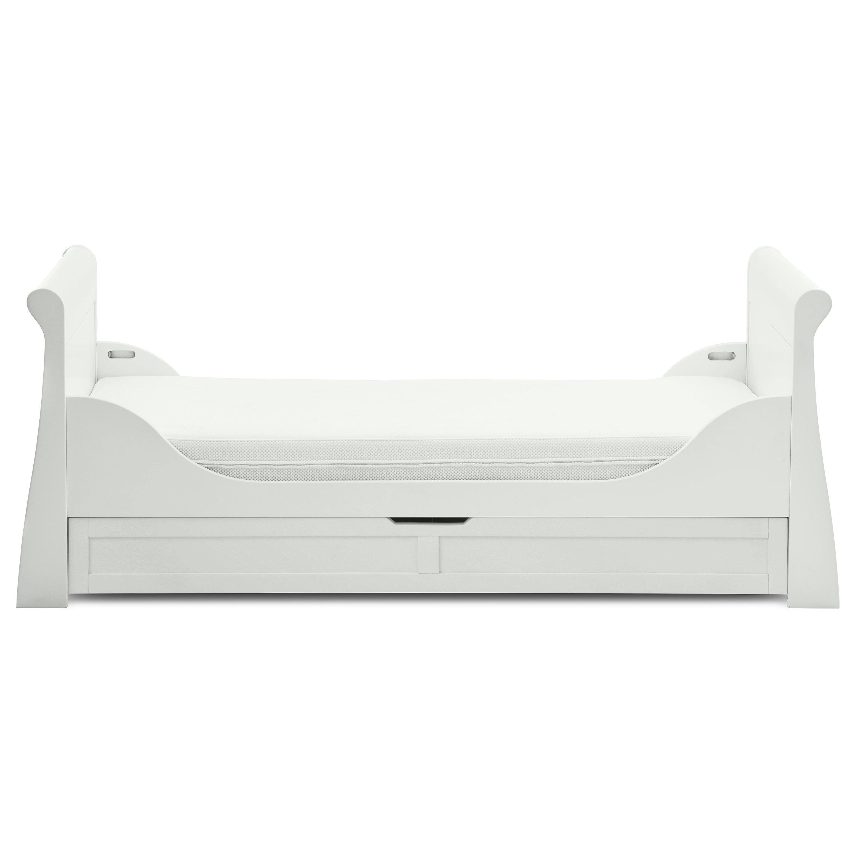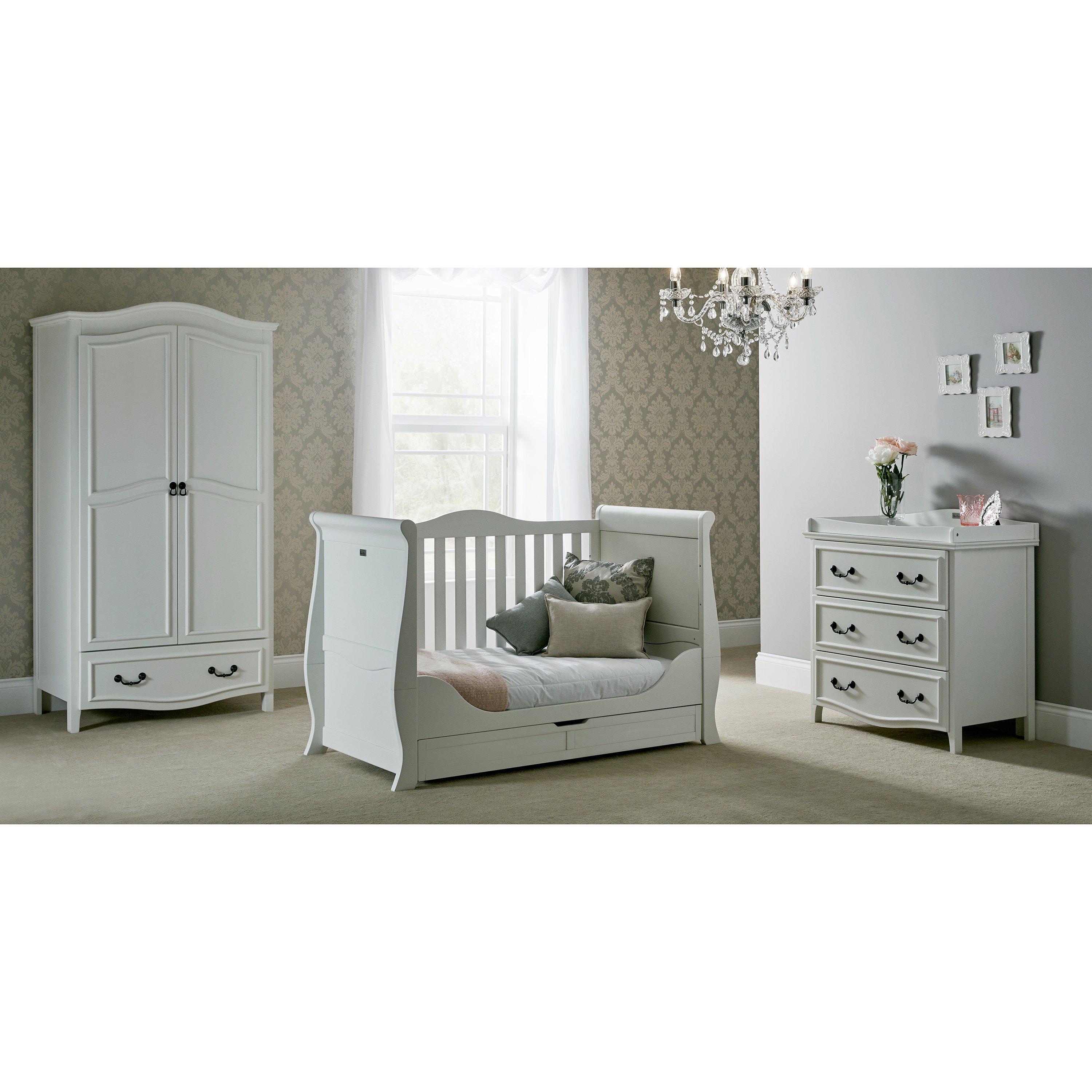 The sleigh cotbed features a deep drawer for under-bed storage in all 3 modes, and 3 adjustable base height positions to grow with your child. This cotbed can also sit with the Nostalgia range.