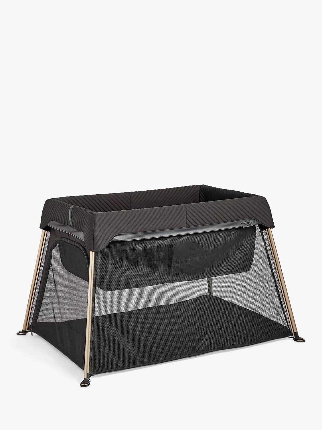 Combining seamless style with diligent functionality - the Rise Travel Cot makes sleep easy from birth to 3 years. Tactile touchpoints of matte black ribbing and subtle hints of dynamic green elevate brushed colour titanium legs and unique emblem-printed details.