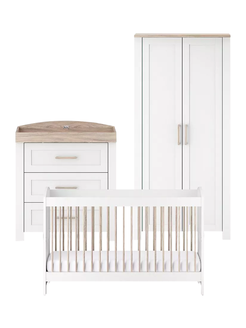 Featuring a timeless white finish and natural ash accents, the Valencia set creates a calming, fresh canvas for your nursery. This versatile, two-tone collection includes a cotbed that easily converts to a toddler bed, a dresser with a removable changer top for added longevity, and a spacious wardrobe, all crafted for durability over the years.