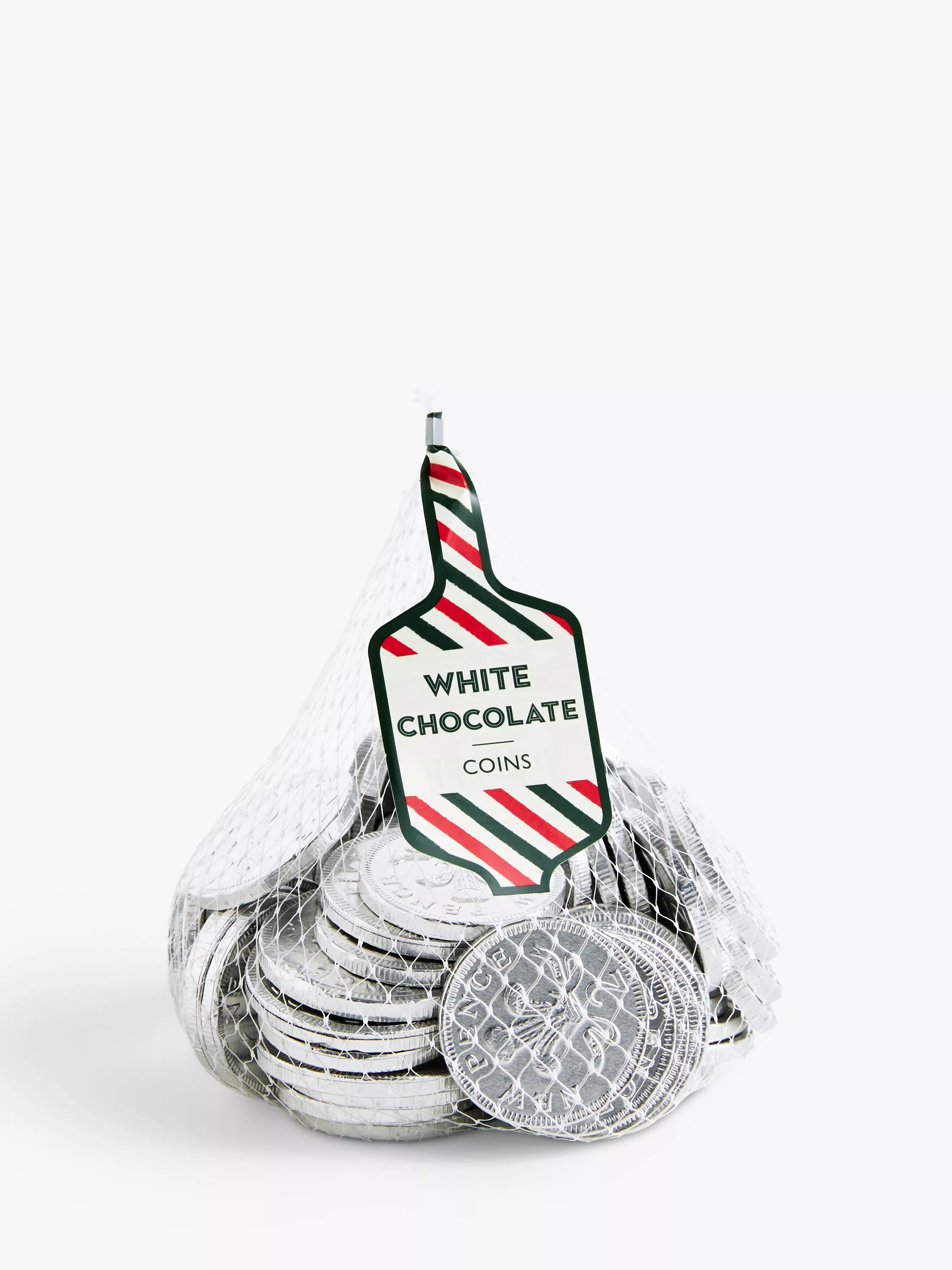 A net of foiled white chocolate coins.