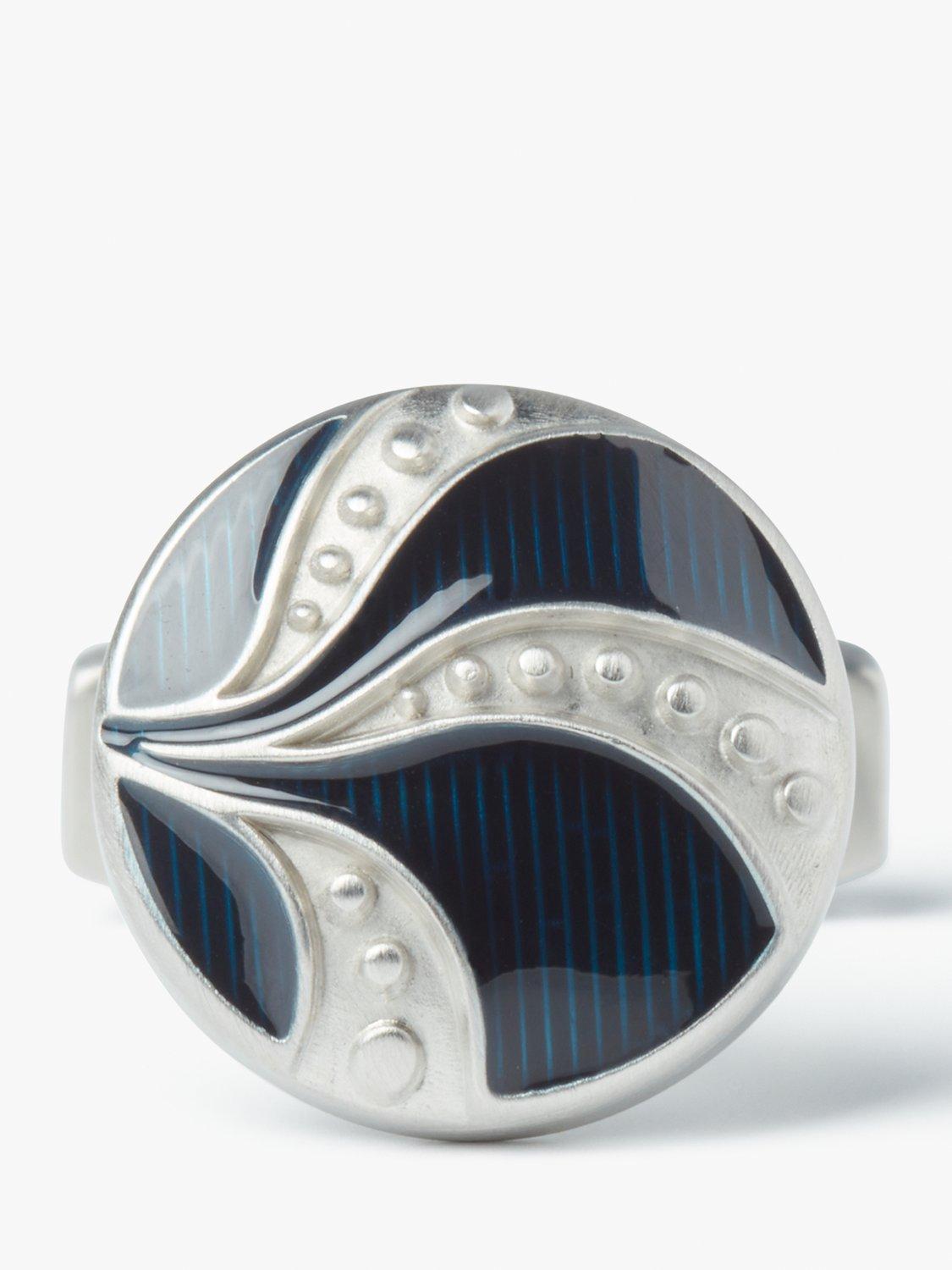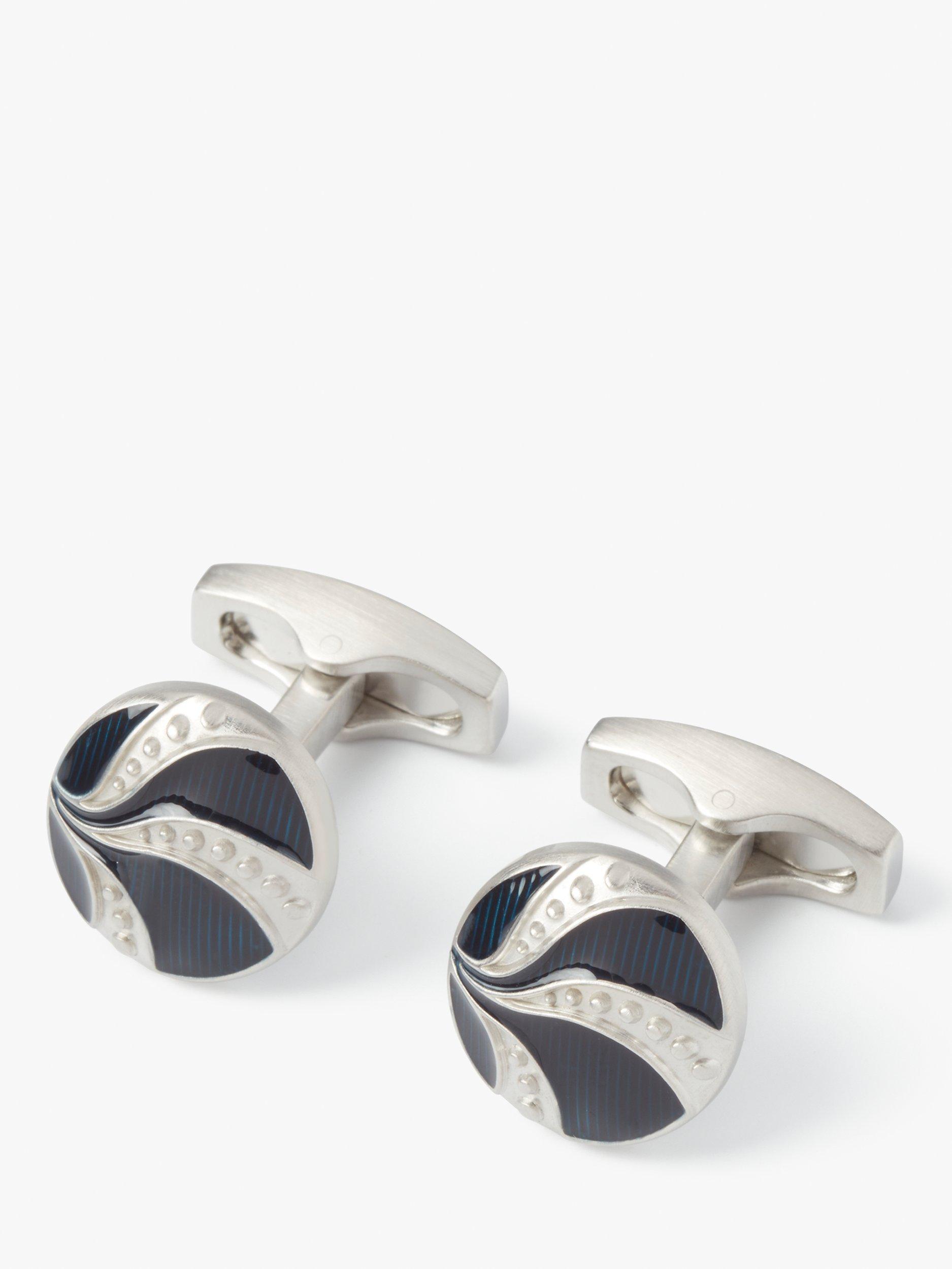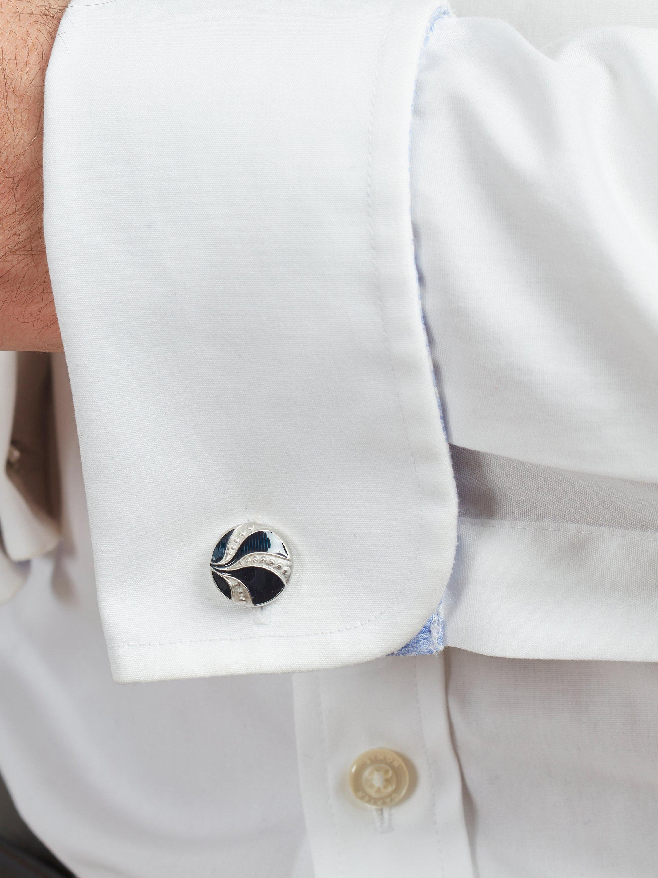 Guilloché enamel design inspired by an Art Deco button. Translucent blue enamel is laid by hand over a gently ridged ground to give the simple, but very beautiful effect. An elegant, tasteful cufflink.
