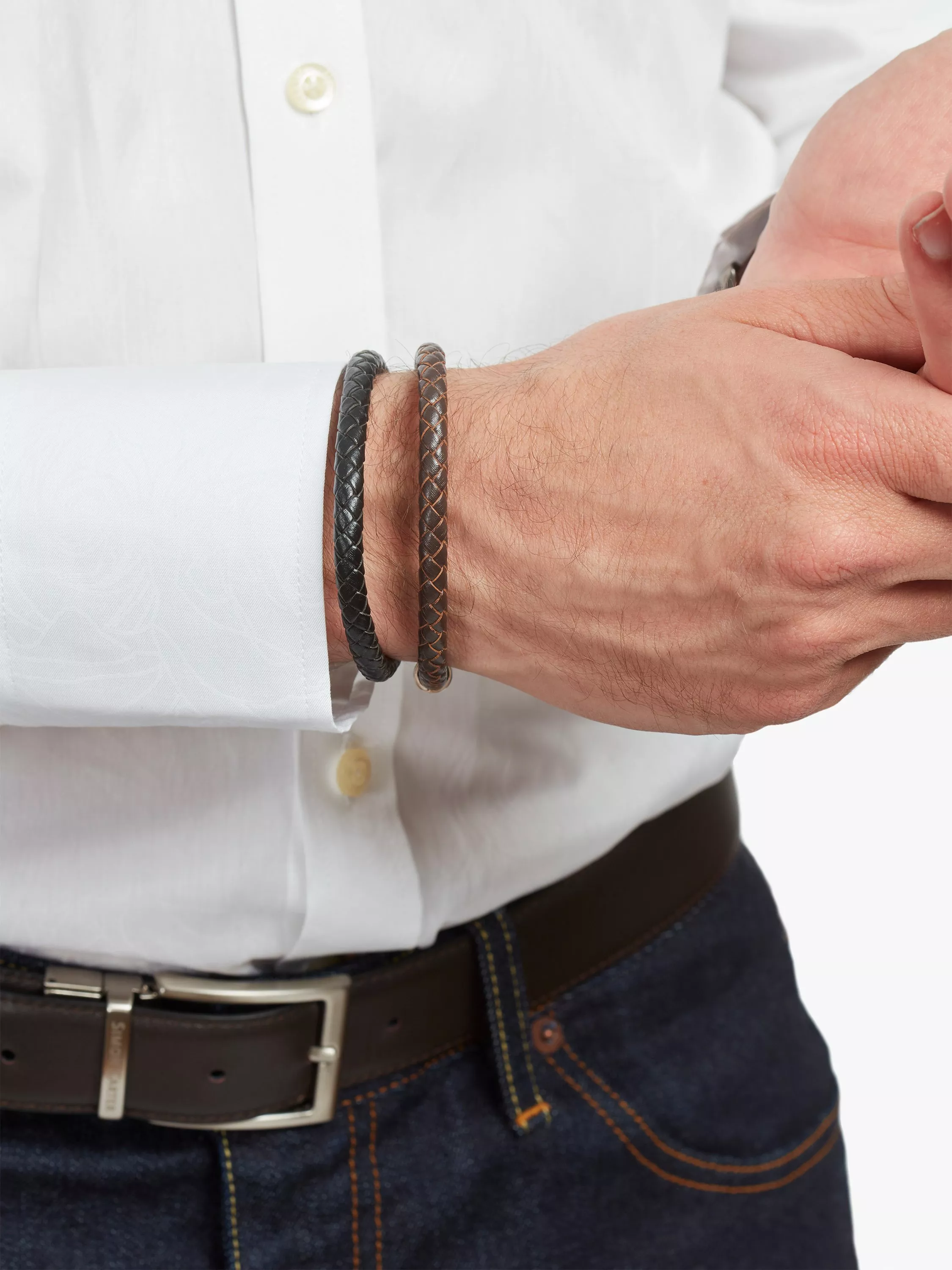 A set of two slim woven leather bracelets that feature lobster claw clasps and a small tag with SC engraved. One bracelet is black leather with a gunmetal plated clasp, and the other is brown leather with an imitation rhodium plated clasp. They are packed in a smart black box, perfect for gifting, or keep one for yourself and give the other one away.