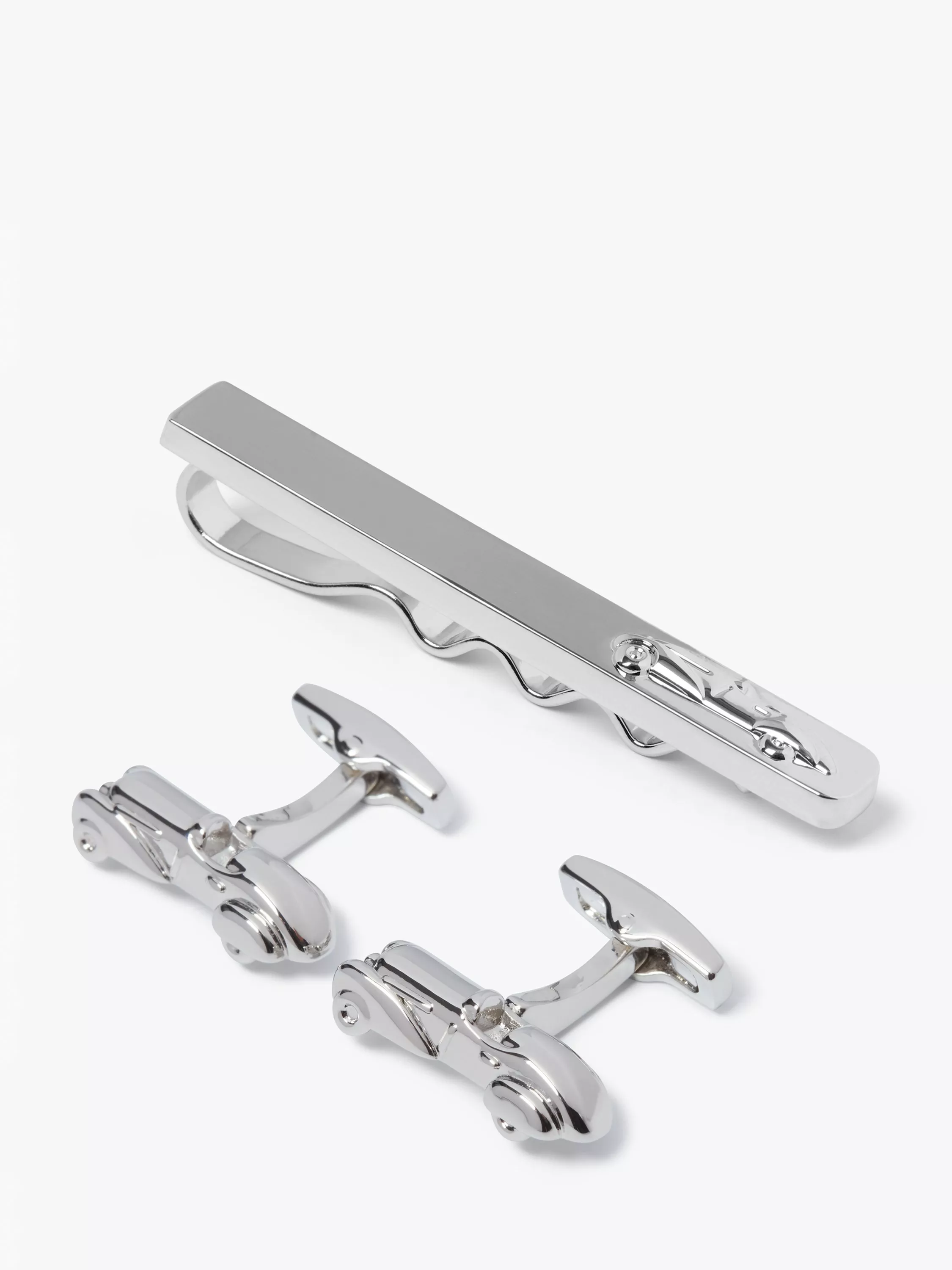 The vintage car set from Simon Carter includes a pair of 3D 30's style racing car cufflinks, with a matching embossed car on a plain Rhodium plated metal tie slide.