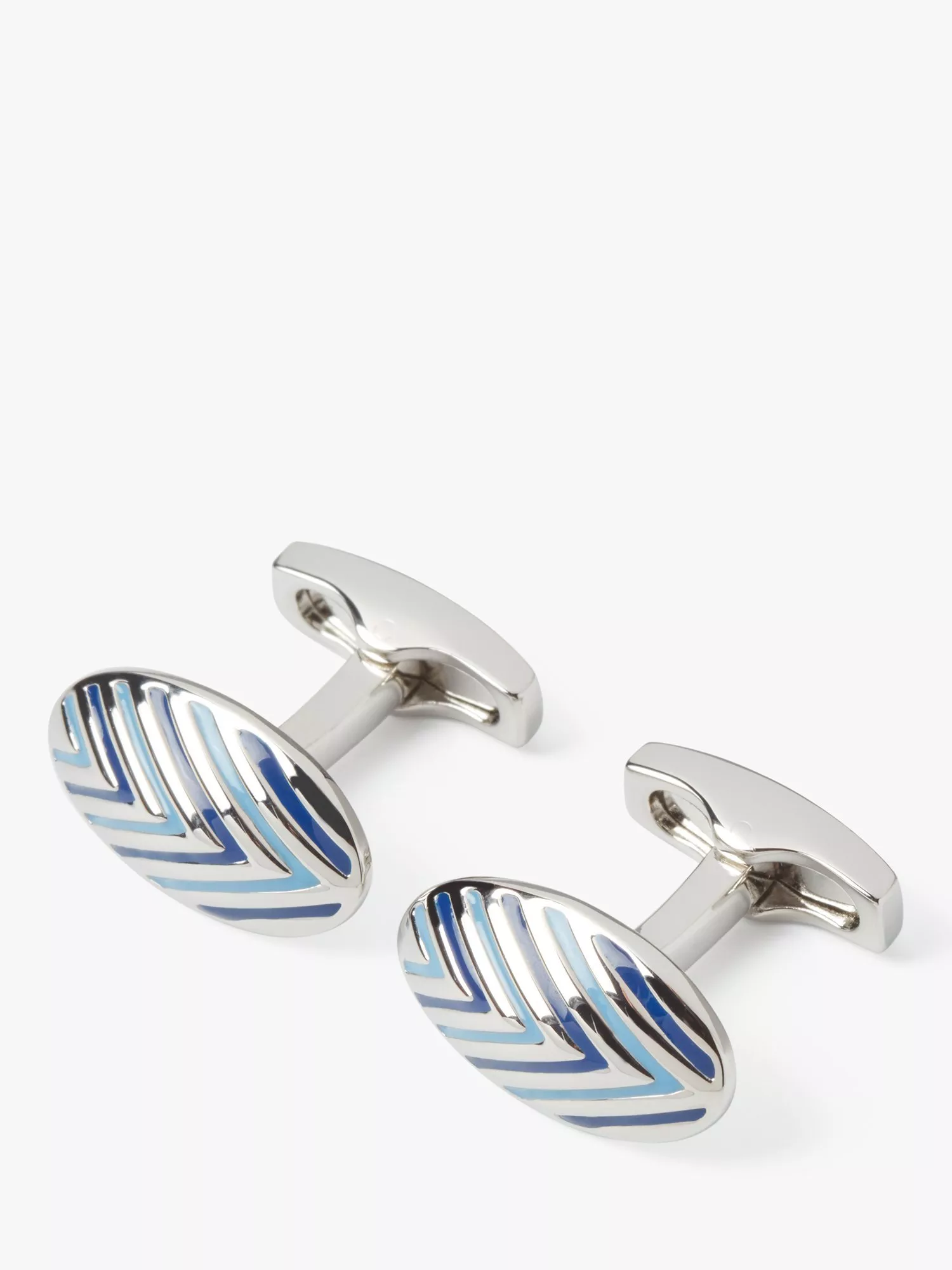 A domed oval shaped cufflink with chervons in two shades of blue enamel.