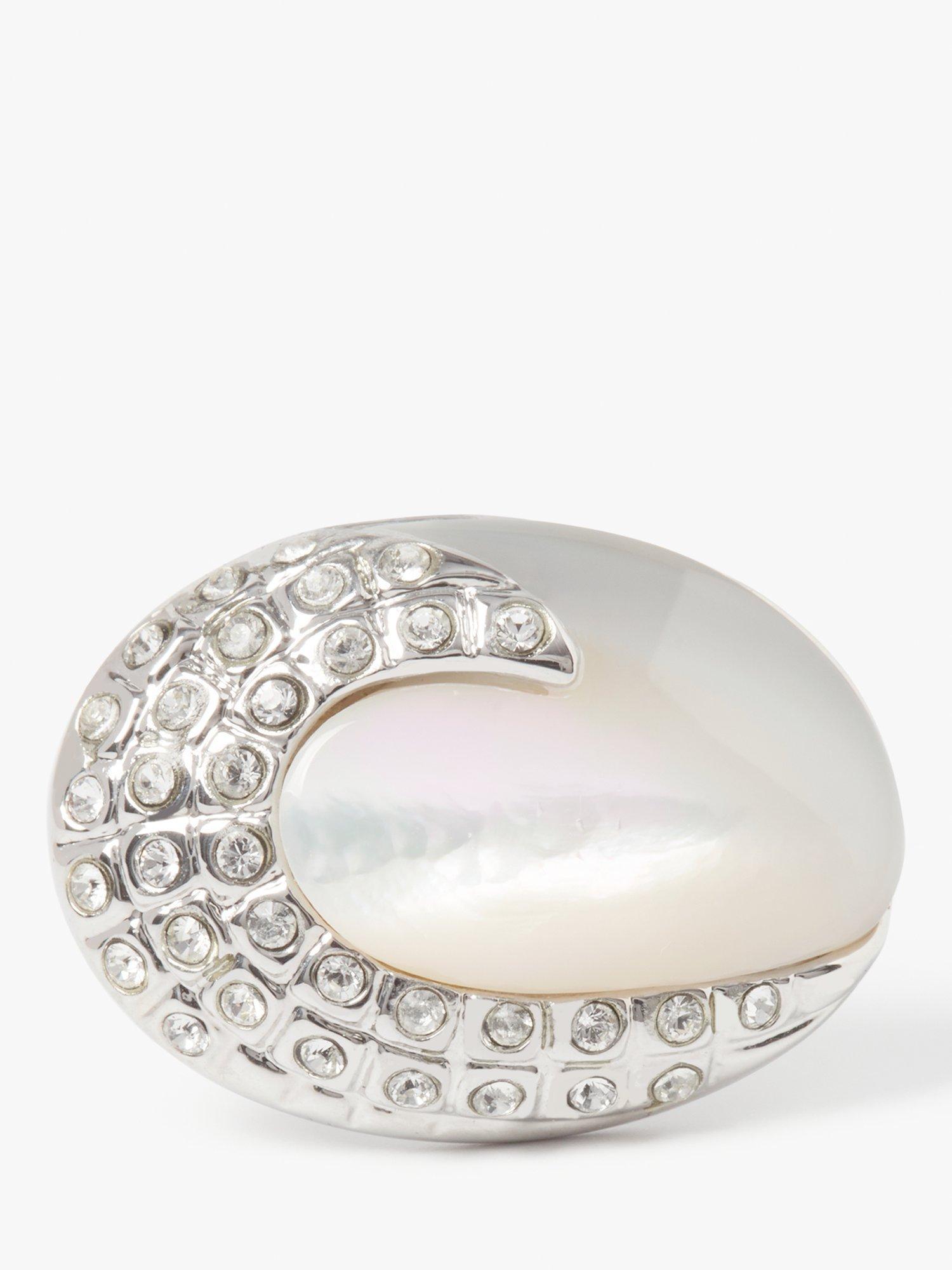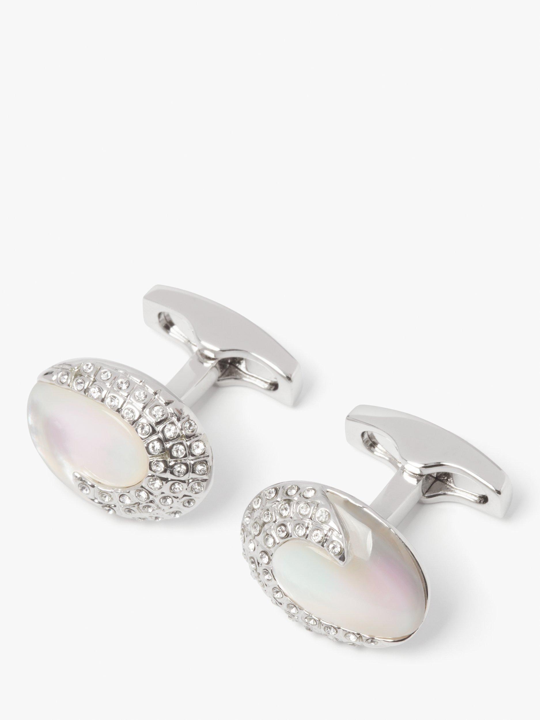 An elegant domed oval cufflink, which has been inlaid with iridescent Mother of Pearl, with a wave of pave set Elements of Swarovski crystals.