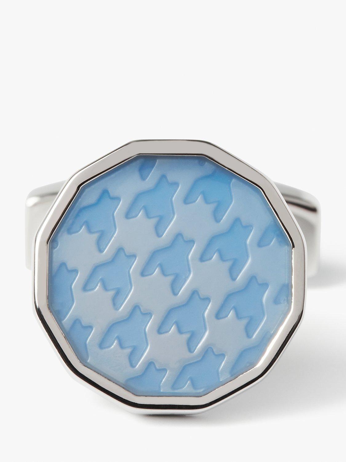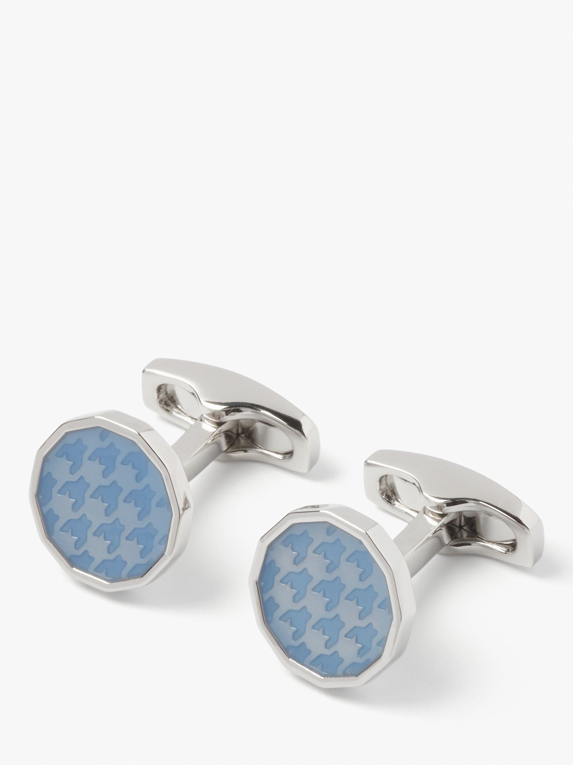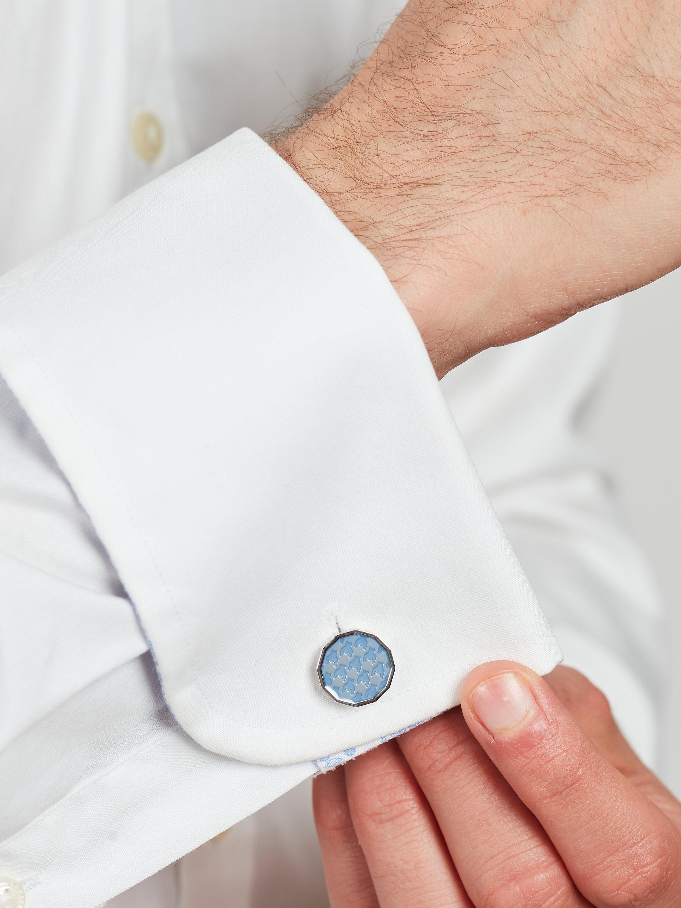 Add a smart finishing touch to your outfit with these sophisticated cufflinks from Simon Carter. On these delicate 12-sided cufflinks, a dogtooth pattern shows through a light blue enamel finish.