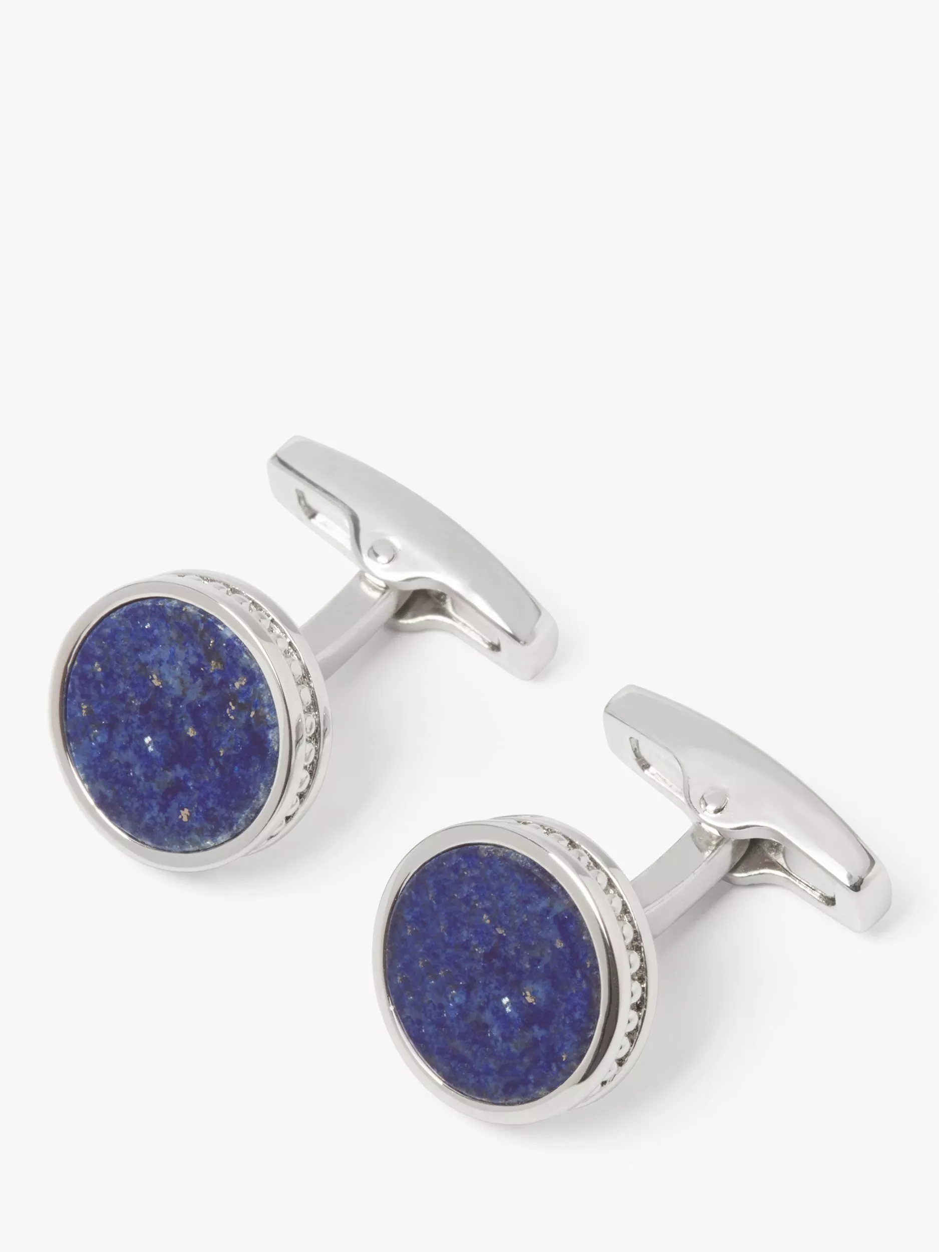 The fine cased roundel of these Edwardian inspired cufflinks has a detailed beaded edge which helps to highlight and showcase the semi-precious stone. The Lapis Lazuli has been hand cut and set and has a lustrous, three-dimensional effect. Perfect against a crisp white shirt for a more formal occasion, and truly classic. Rhodium plated for a brilliant finish.