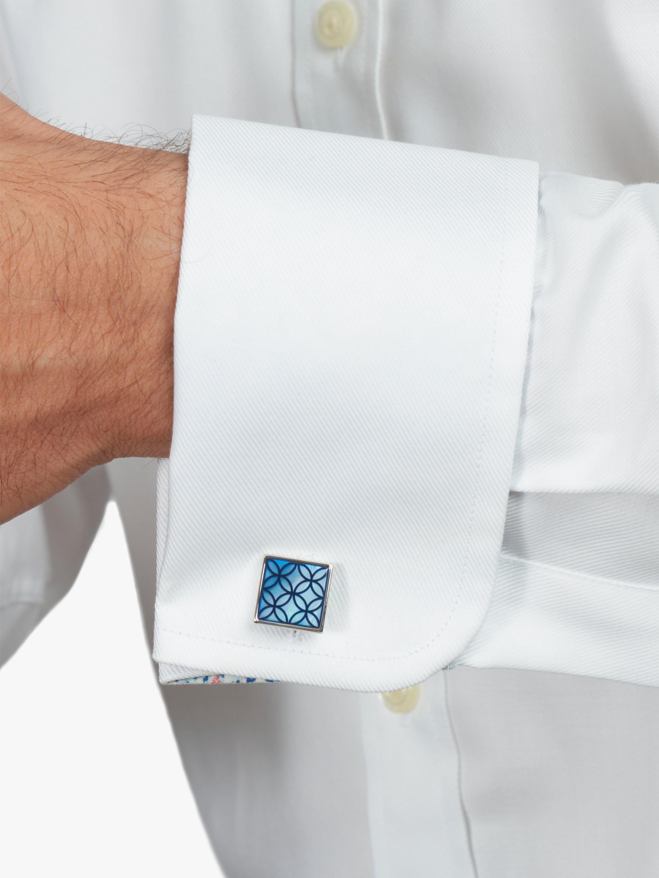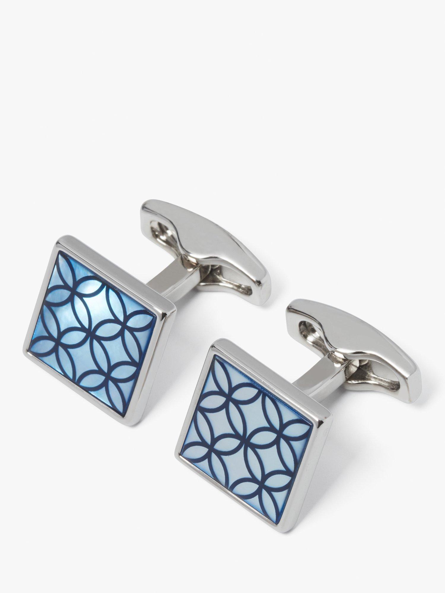 Sometimes you'll see petals, other times you'll notice circles in the simple, yet intriguing geometric pattern that's screen-printed on to these cufflinks. They're made from blue mother of pearl and the square case is made from rhodium-plated brass.