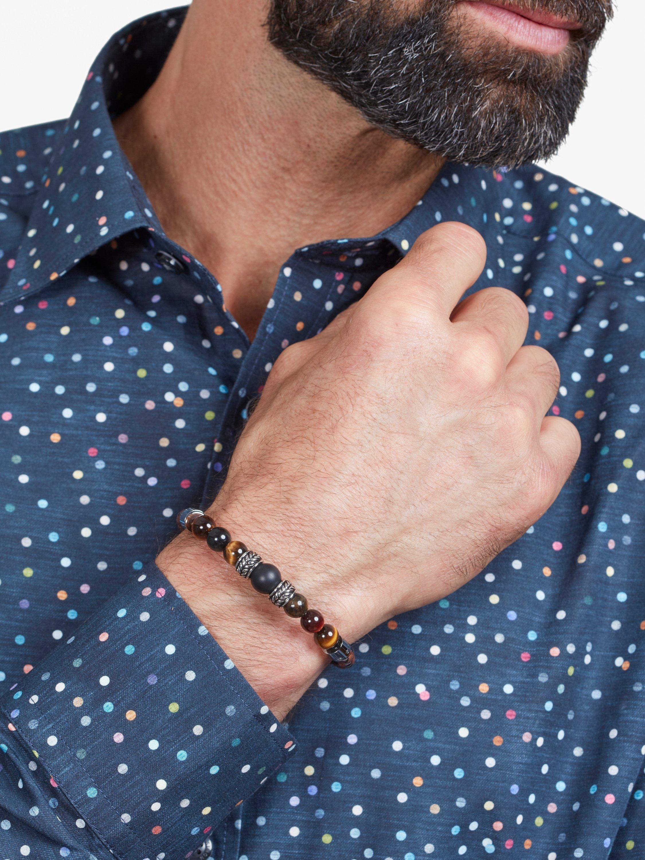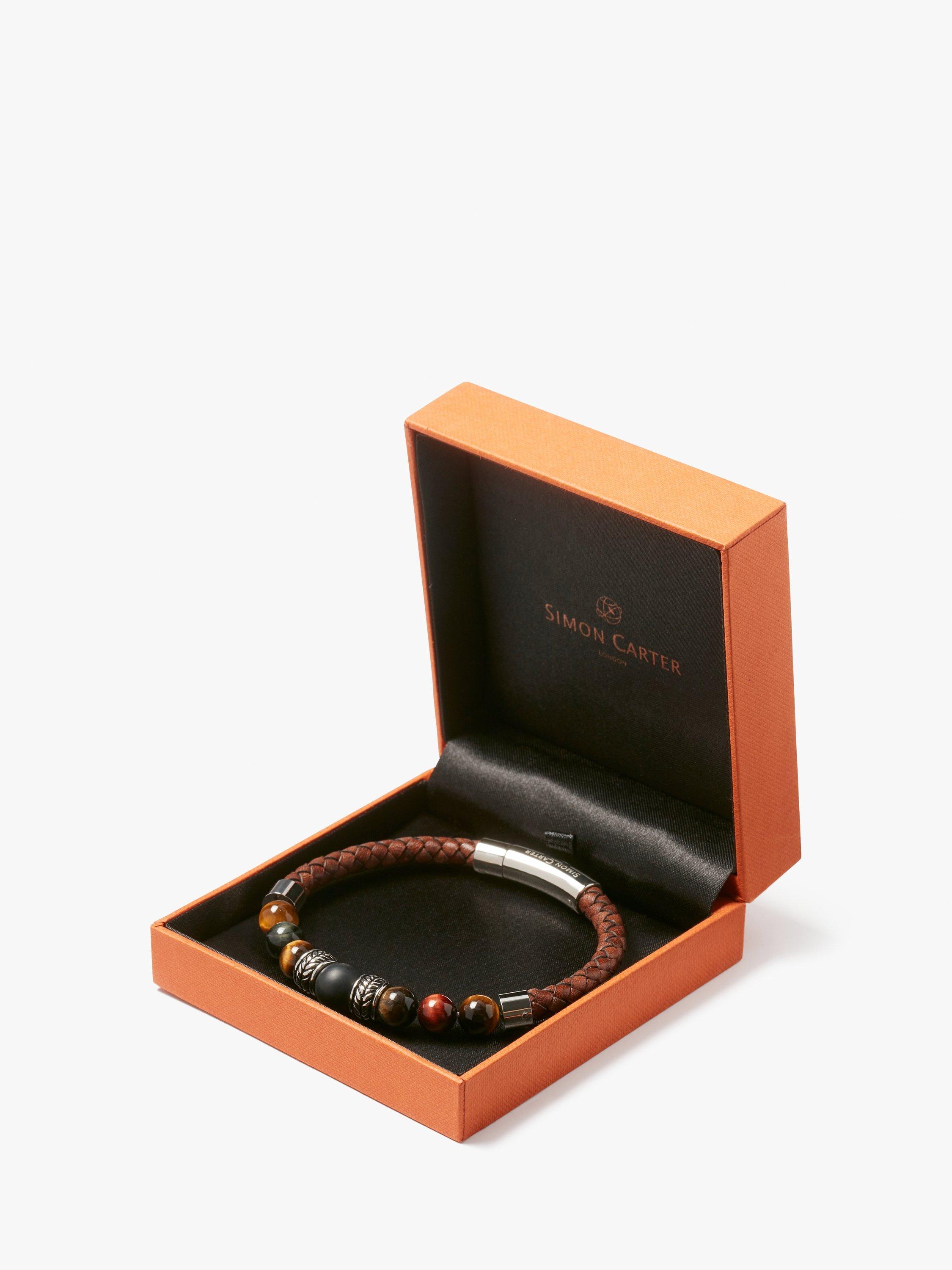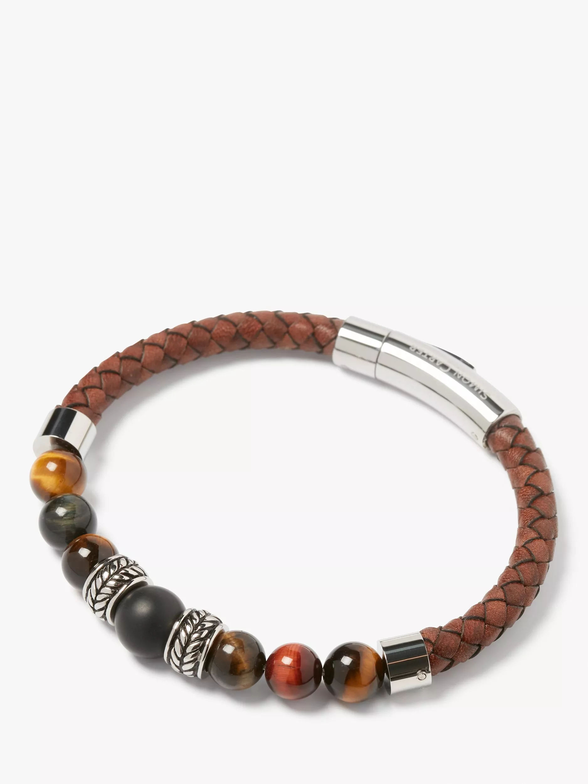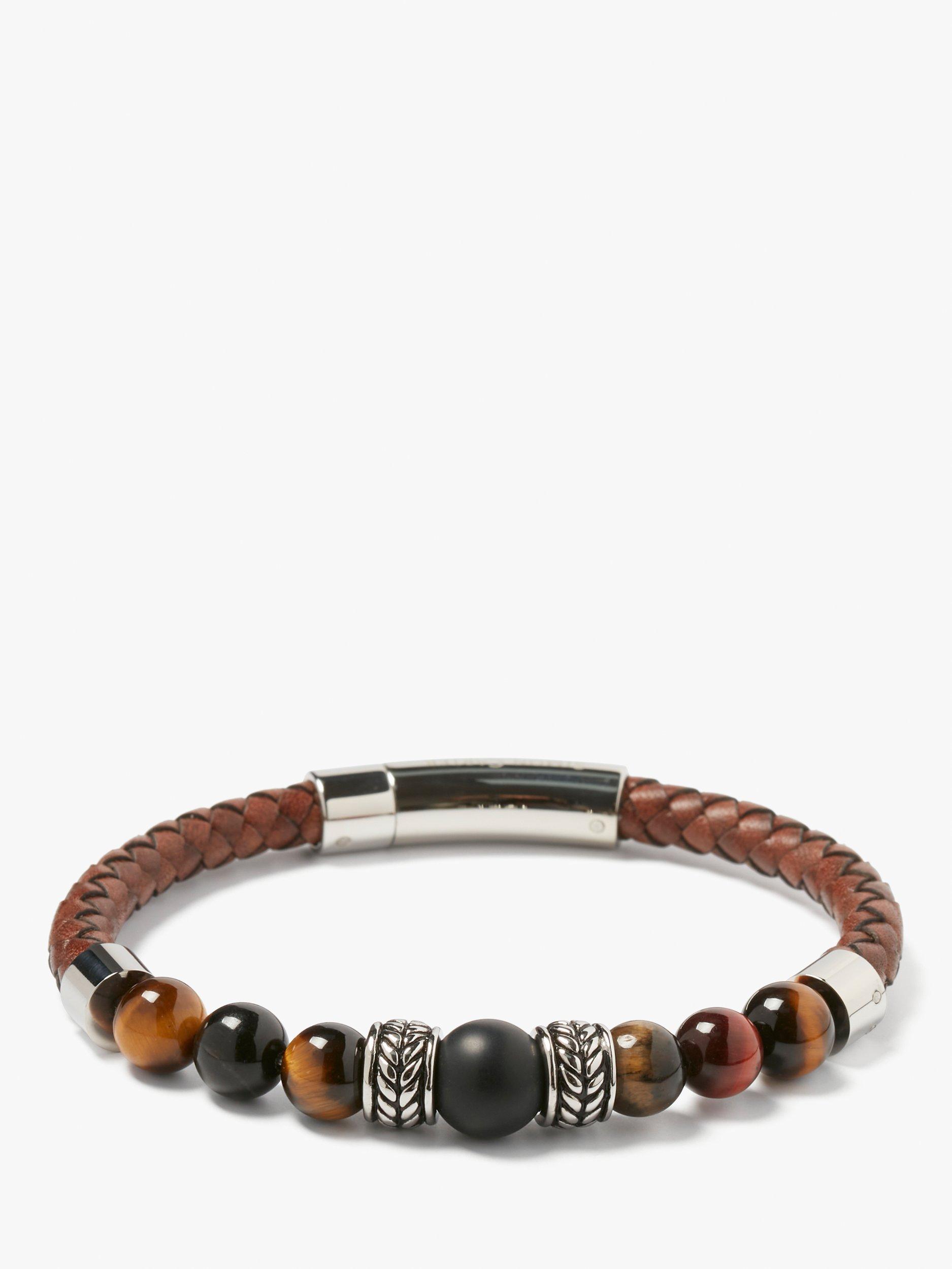 Jacob is a robust woven leather bracelet with a section of Tiger Eye beads of different sizes, with the largest at the centre. Between the beads are decorated barrel-like sculptural forms in metal, filled in black for definition.
