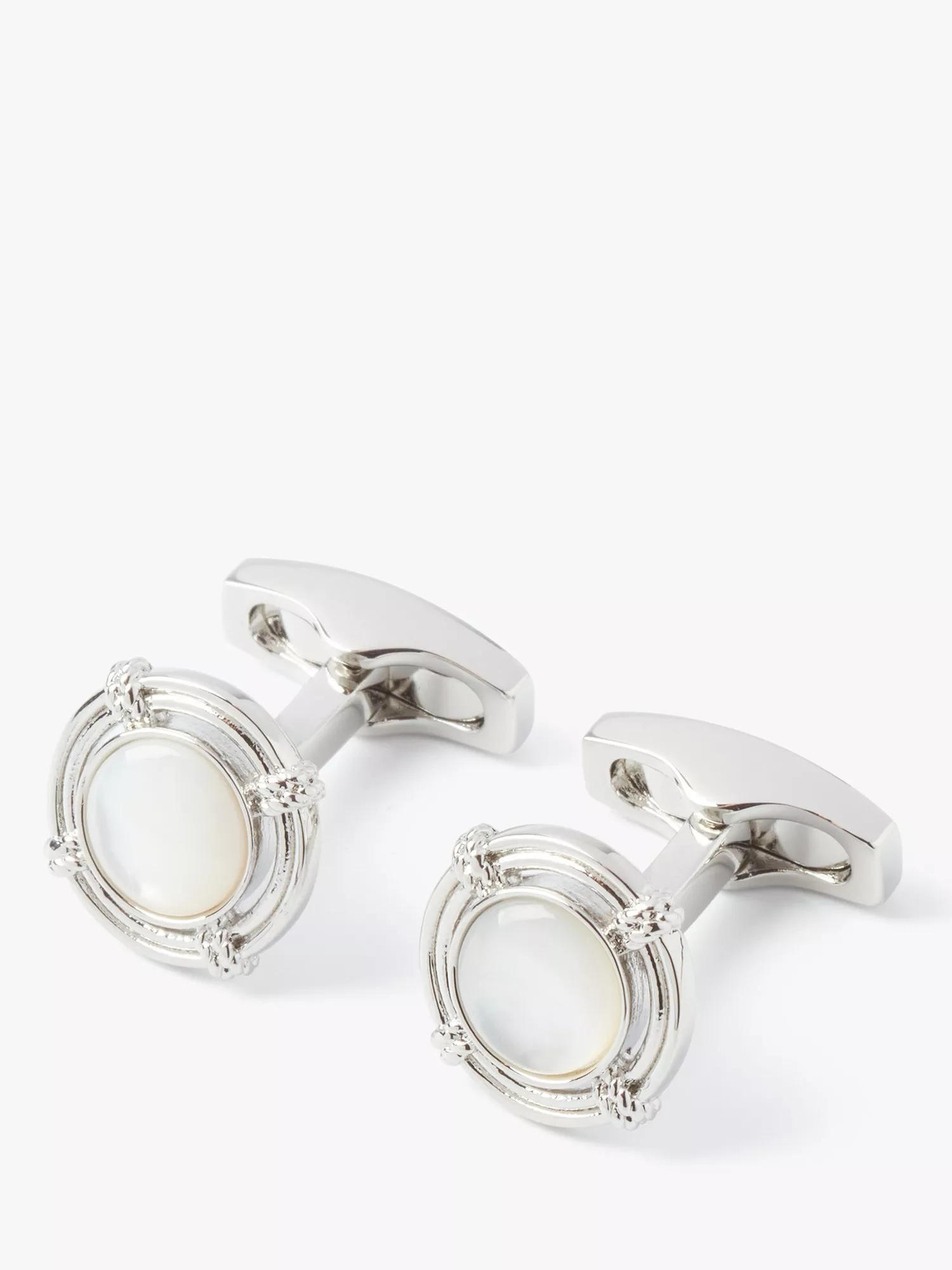 A classic design inlaid with white Mother of Pearl. The edges of the cufflinks are delicately detailed and the overall effect has a hint of 1930s Art Deco.