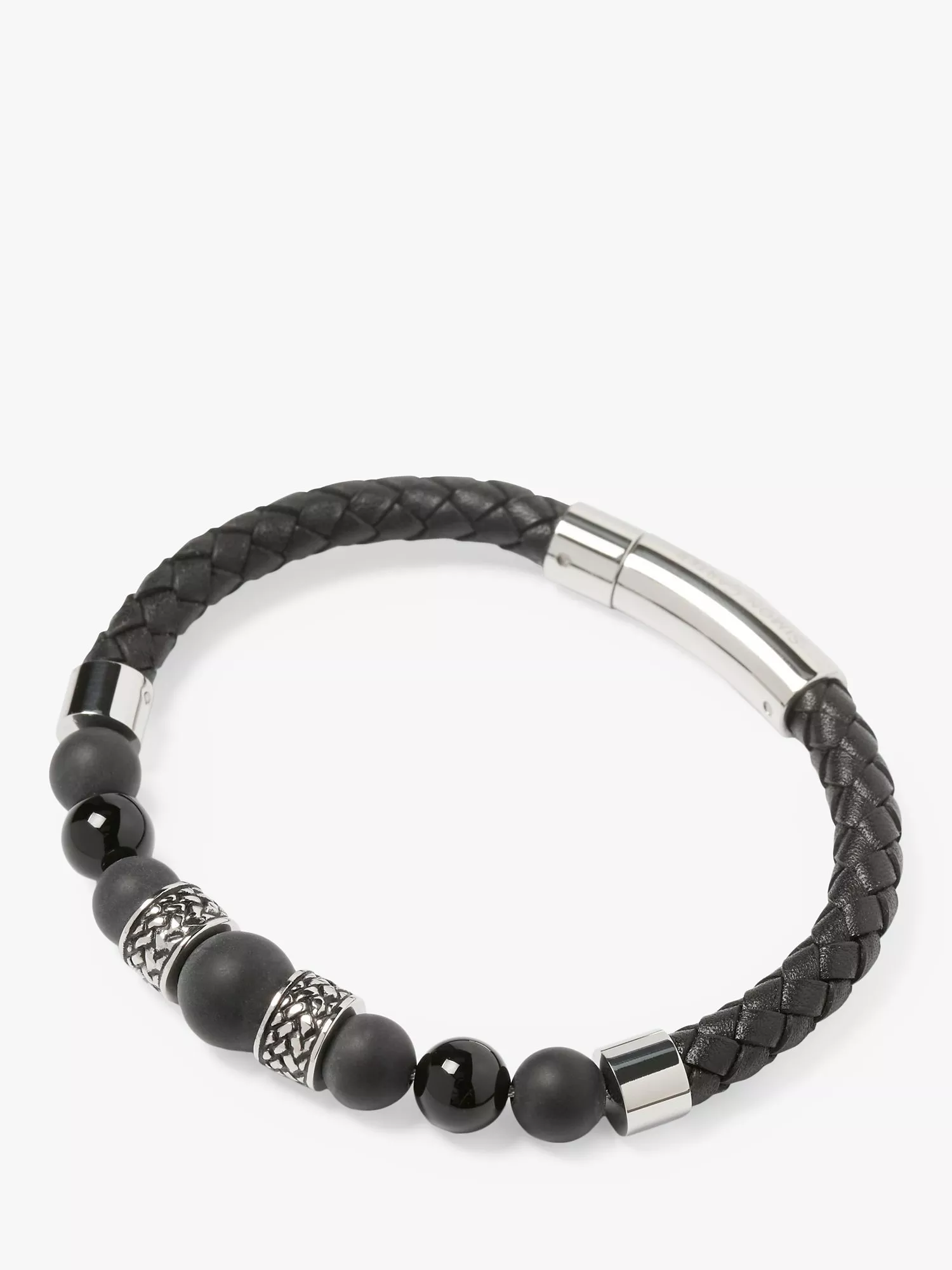 from Simon Carter, this robust woven leather bracelet features a section of matt and polished onyx beads of different sizes with the largest at the centre.