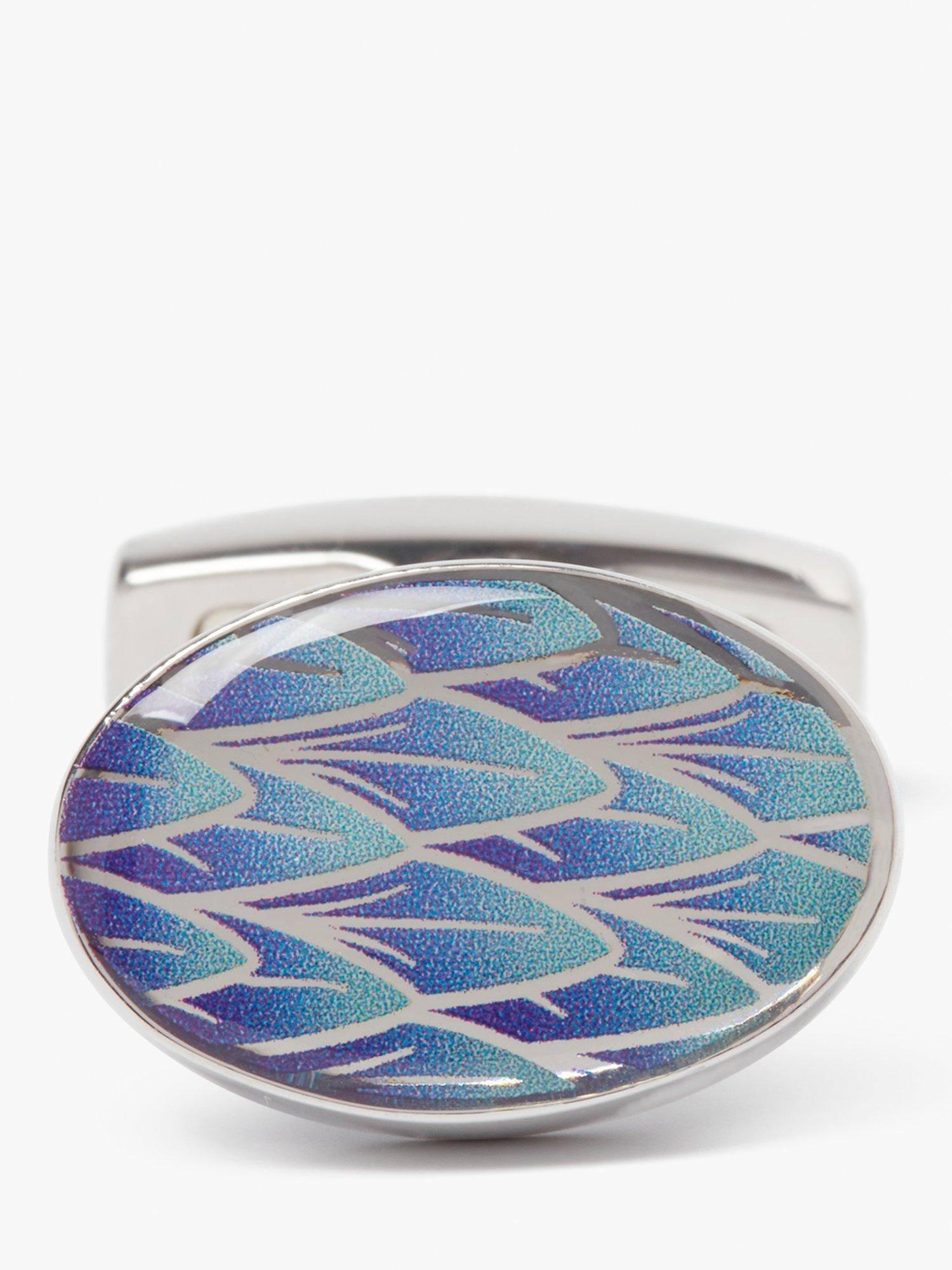 Advances in screen print technology has helped to produce this delicate ombre enamel effect, which has been based on the feathers of an exotic bird. The different shades of blue means that these cufflinks will work well with so many different colours of shirts.