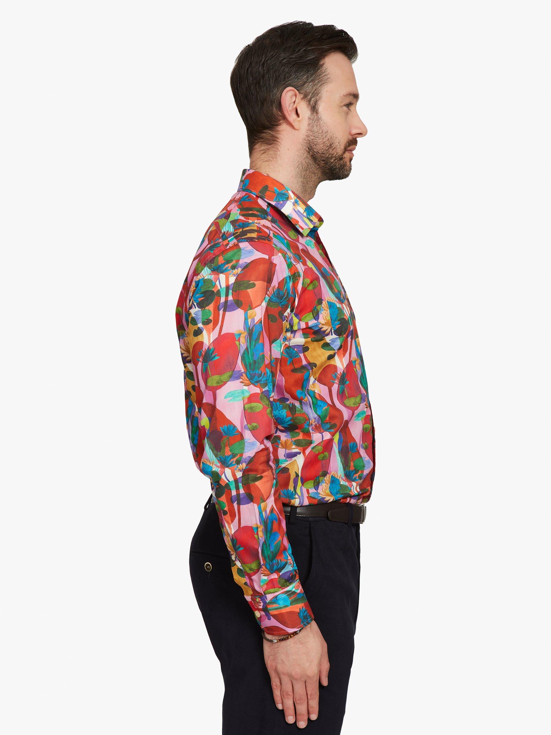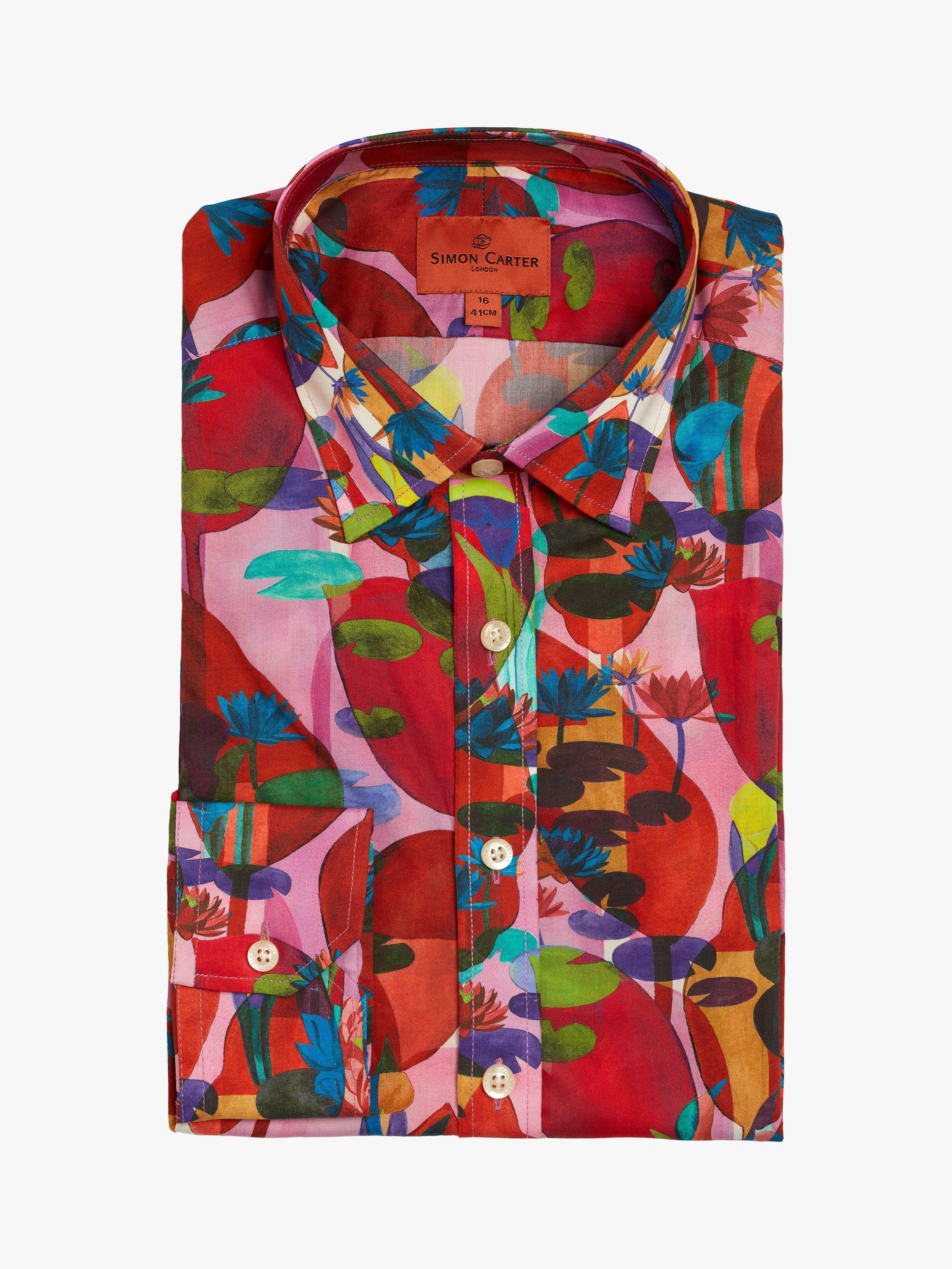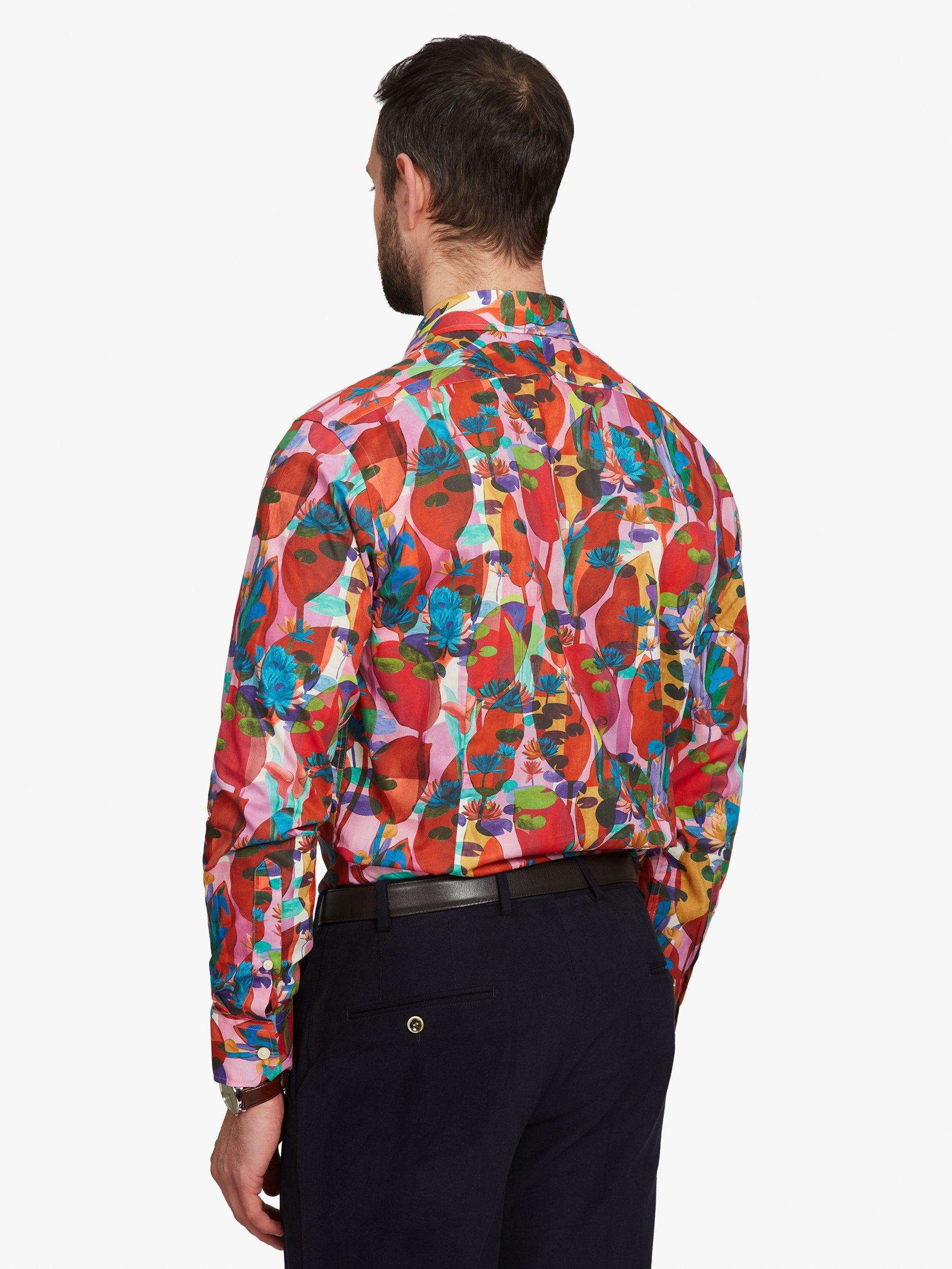 Trust Liberty Fabrics to come up with such a bold, imaginative design as this. The abstract quality gives it such nuance that you never quite know what you're looking at. All sense of proportion is gone as small lily pads vie with giant, slightly menacing seed pods and all in a glorious technicolour dream world of colour. The perfect statement shirt for the party season.