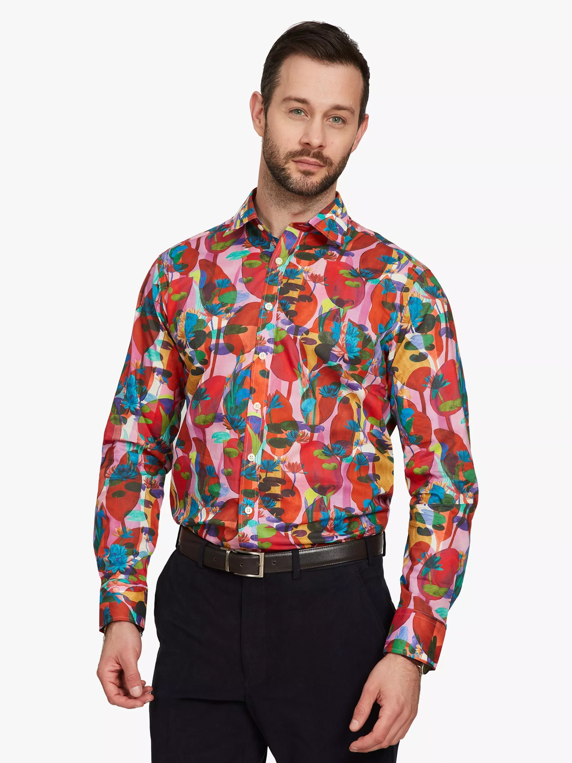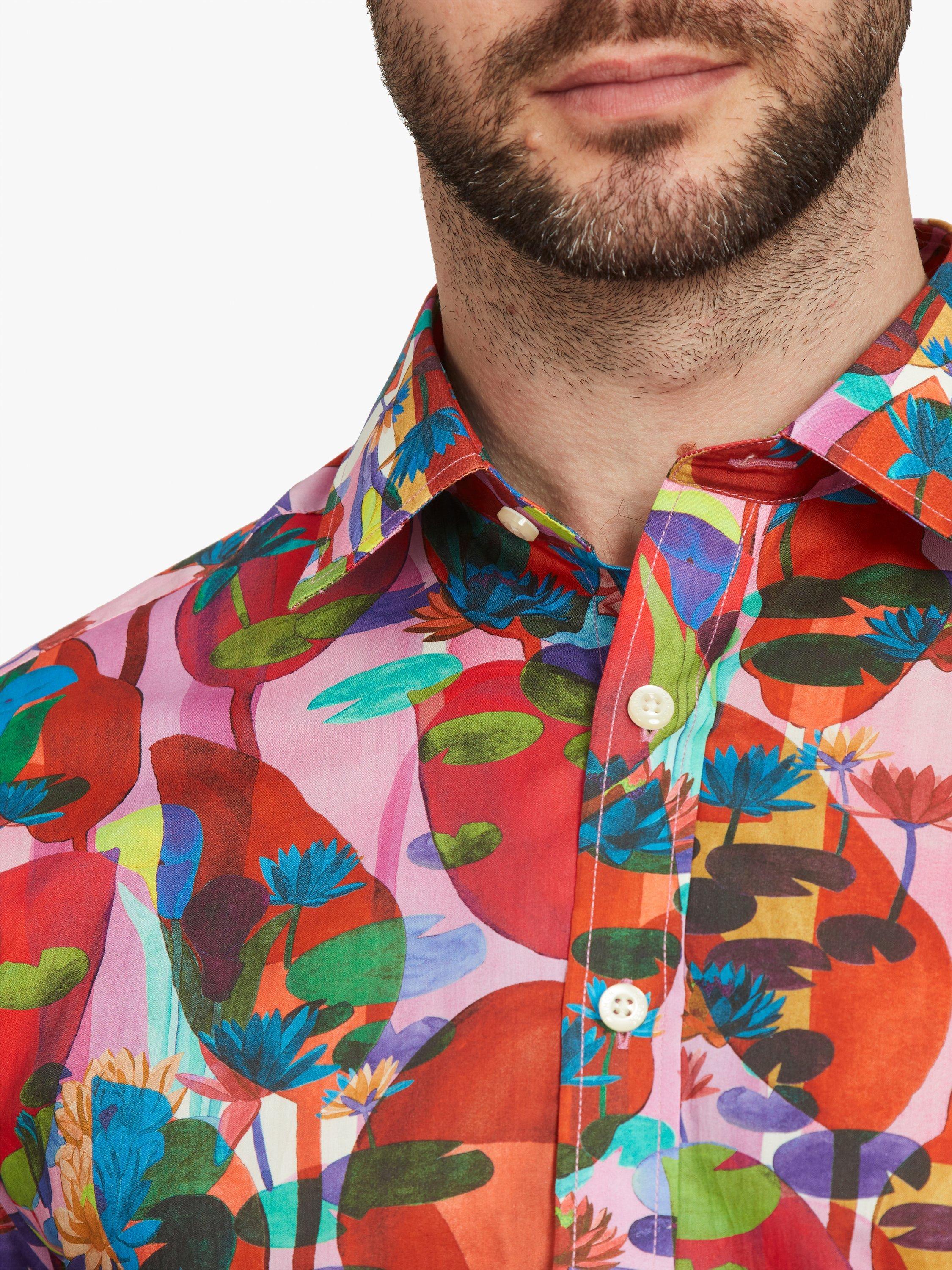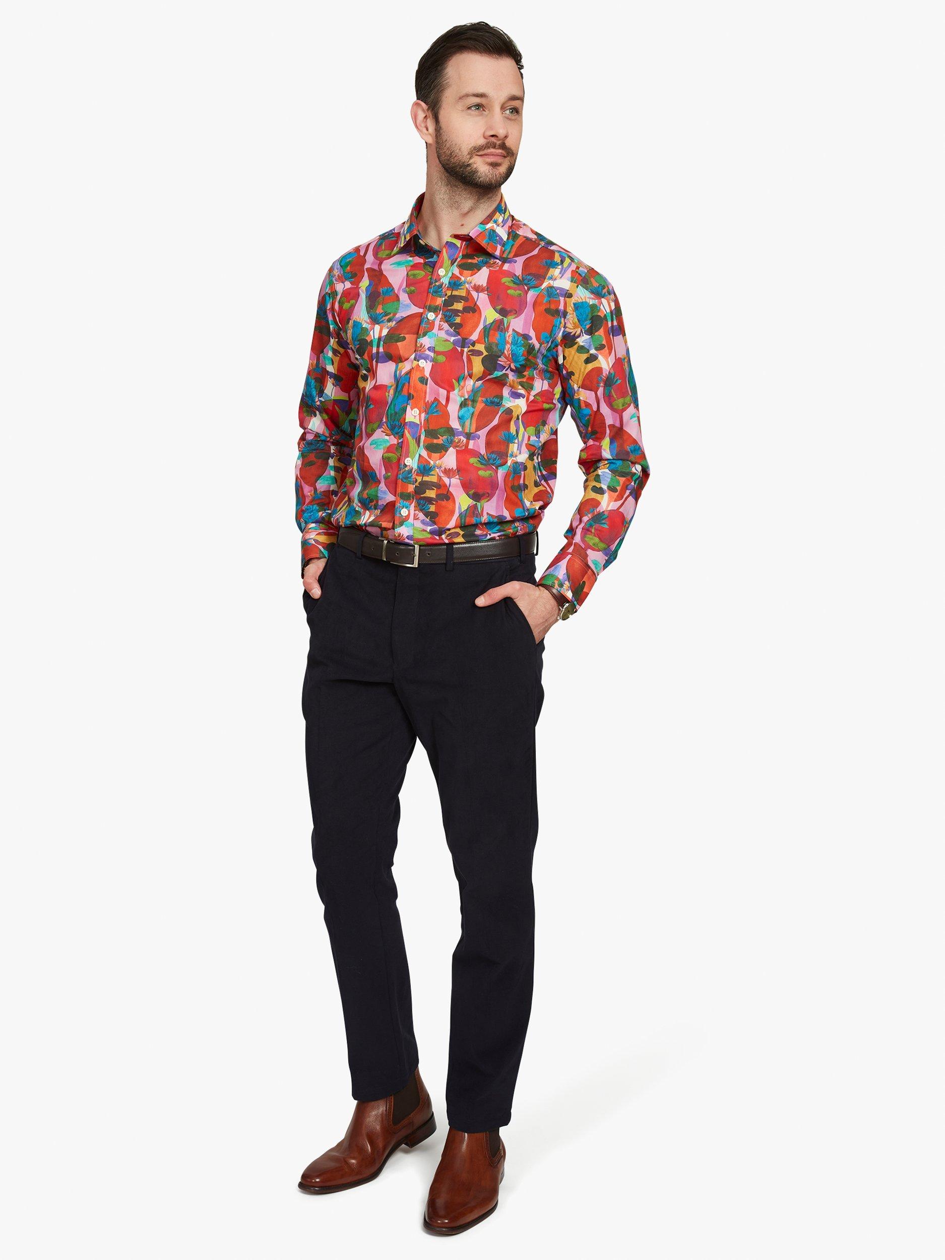 Trust Liberty Fabrics to come up with such a bold, imaginative design as this. The abstract quality gives it such nuance that you never quite know what you're looking at. All sense of proportion is gone as small lily pads vie with giant, slightly menacing seed pods and all in a glorious technicolour dream world of colour. The perfect statement shirt for the party season.