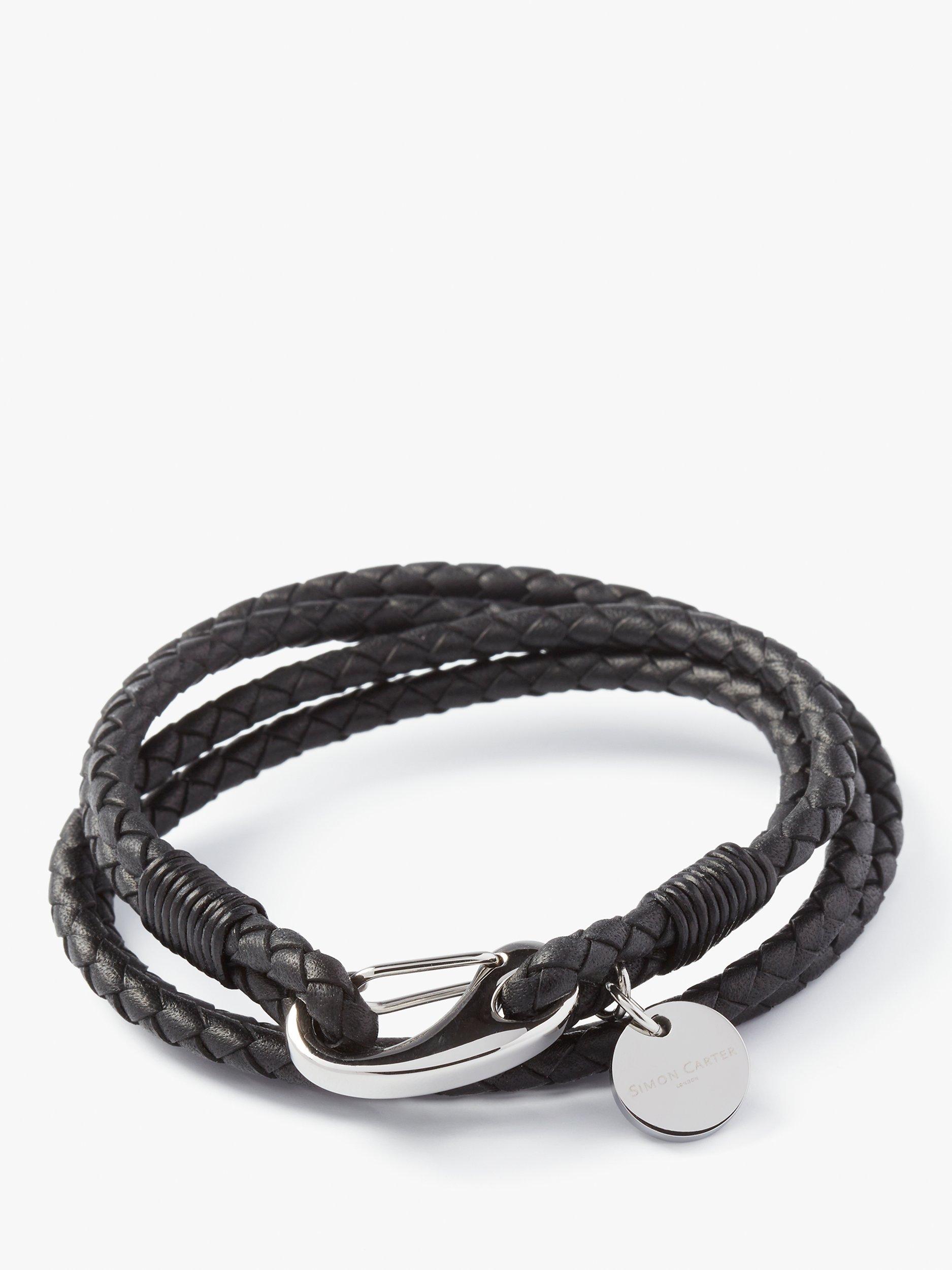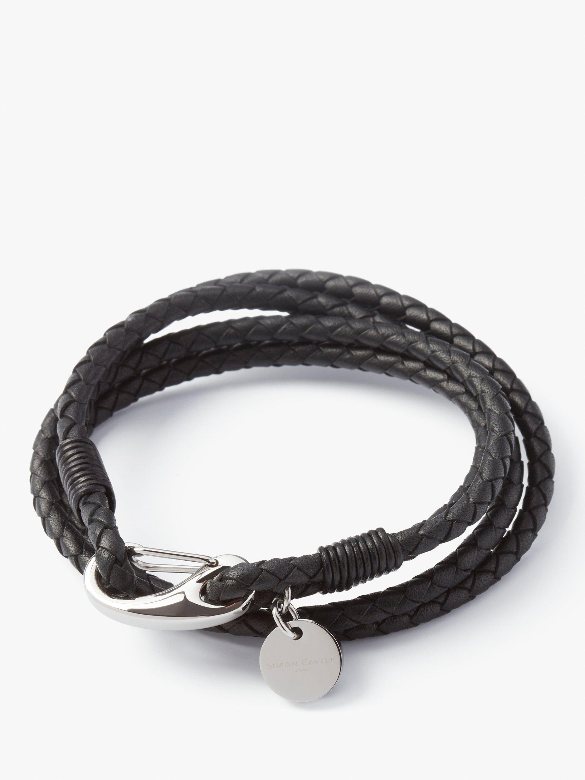 From Simon Carter, this robust woven black leather bracelet is a modern accessory that's sure to add interest to everyday edits.
