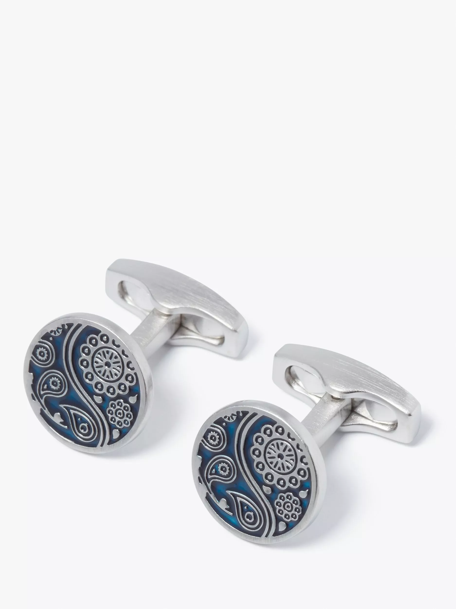 A classic Paisley pattern rendered as a guilloche design on these cufflinks. Cast in metal and overfilled with translucent navy enamel, producing a soft jewel-like, decorative effect.