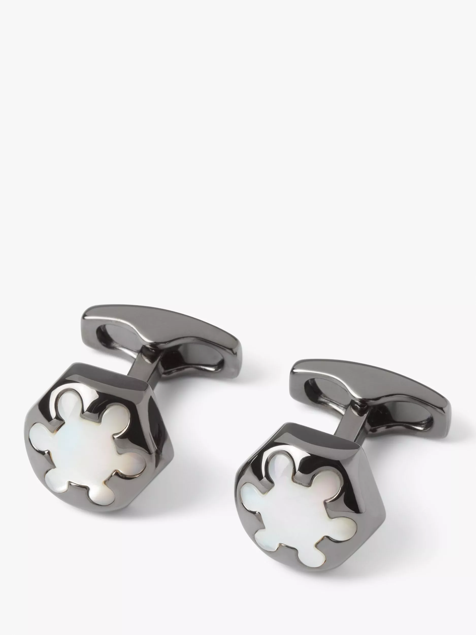 A tactile hexagonal shaped cufflink in gunmetal finish, with a stylised flower cut out that contrasts with the iridescent Mother of Pearl underneath, offering an interesting and stylish design.