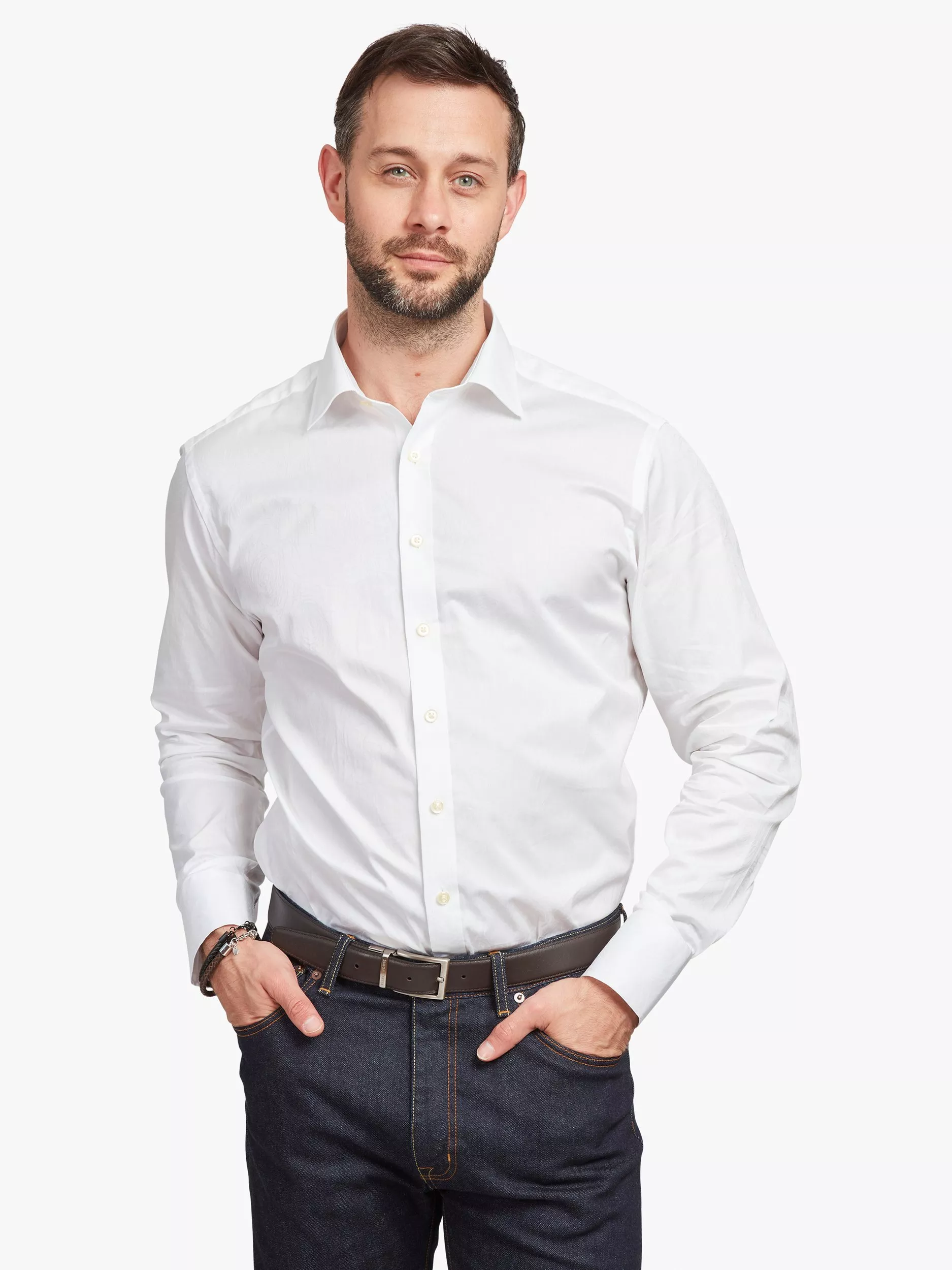 A jacquard shirt from Simon Carter featuring stylised, deconstructed roses that form a delicate all-over pattern. It's only when it catches the light that the subtlety comes alive. Made in Portugal from 100% cotton, with a gently tailored block featuring a three-button cuff.