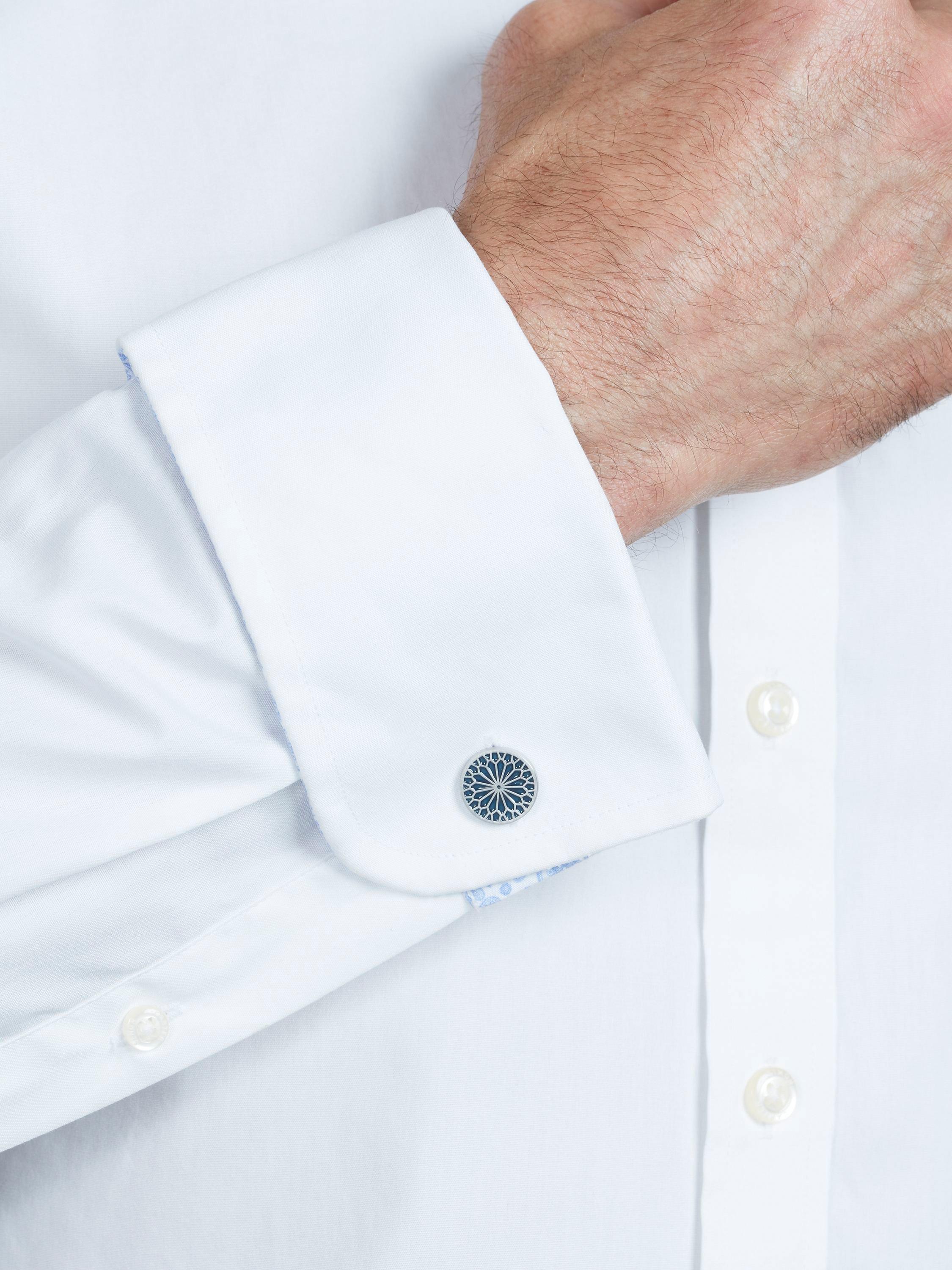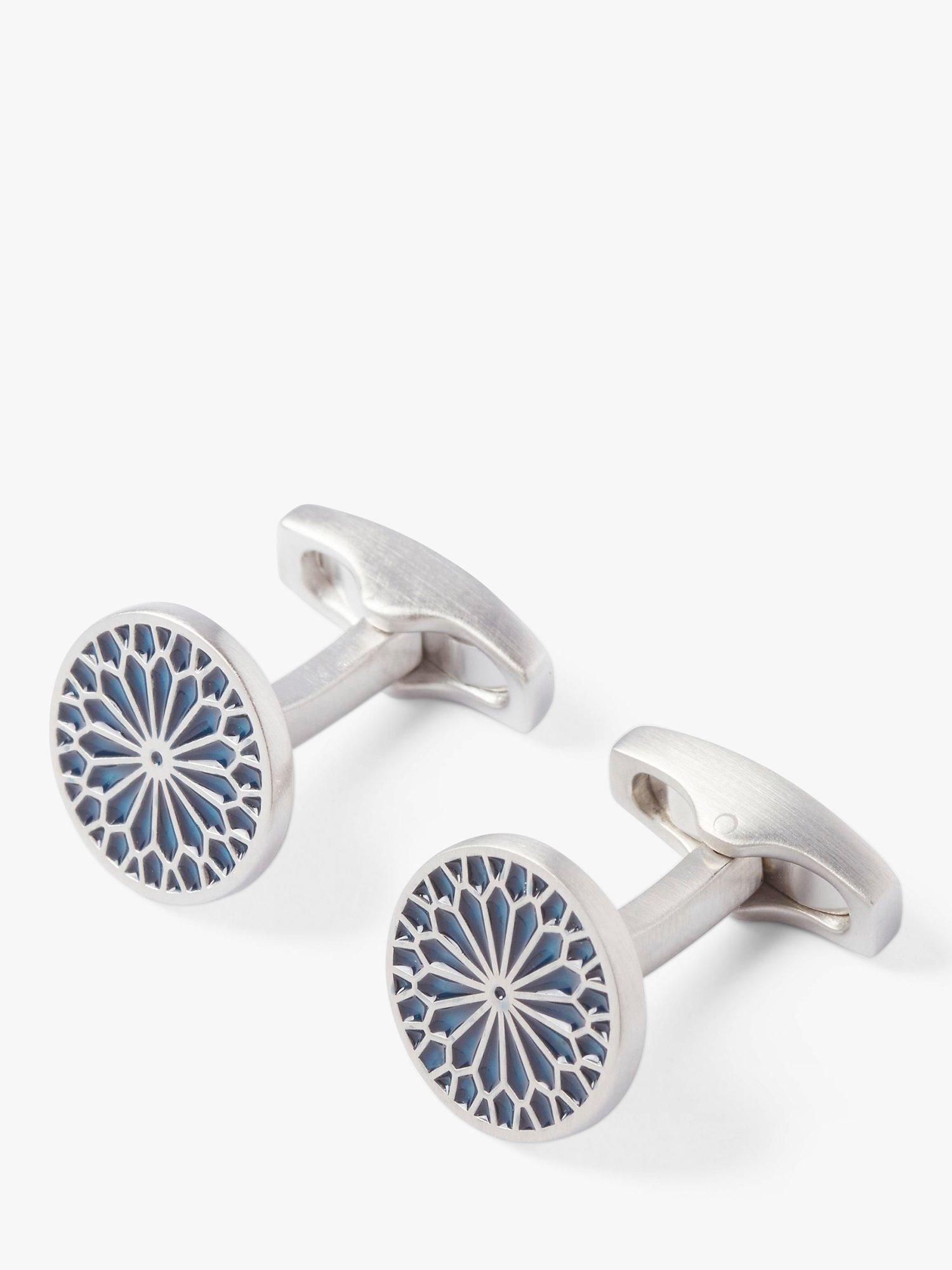 These stained glass window cufflinks are filled with navy semi-transparent enamel, producing a soft jewel-like, decorative effect and easily attach at the back with a swivel bar fastener.