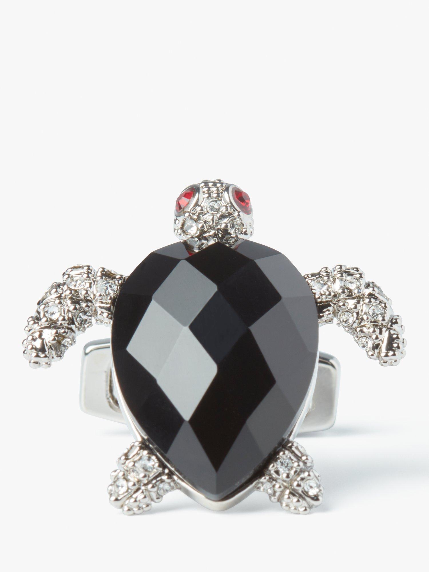 Turtle cufflink inspired by the life and works of Charles Darwin. Skilfully hand crafted with a faceted shell that exploits the deep Onyx against a bright, sparkling rhodium plated setting, encrusted with clear Swarovski Elements crystals. The turtle's eyes are rendered by red Swarovski's. Luxury, charm and distinctiveness in equal measure.