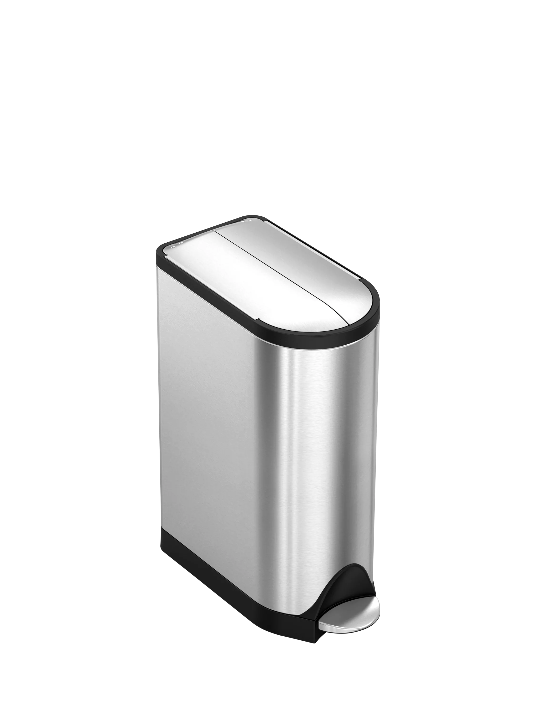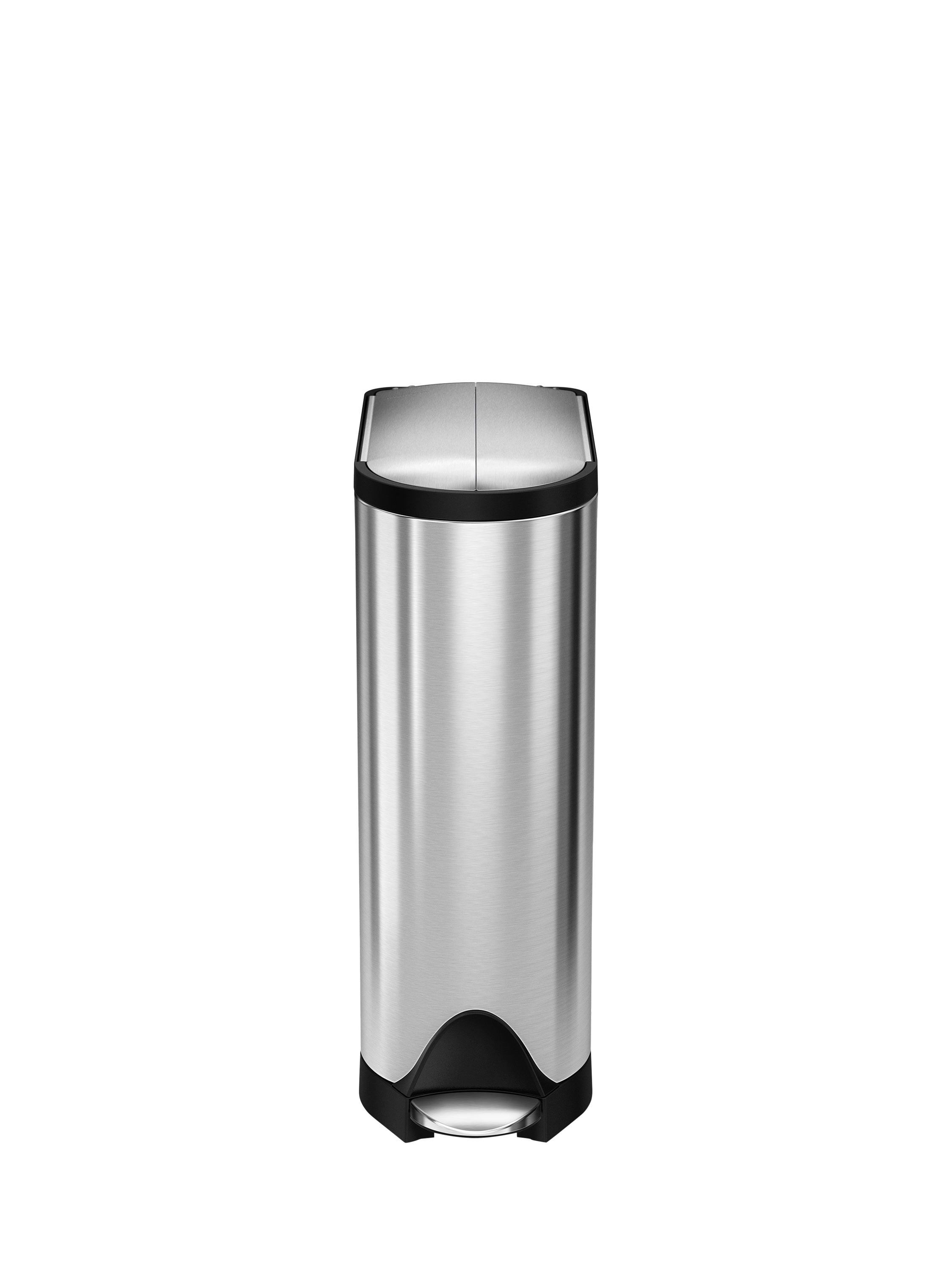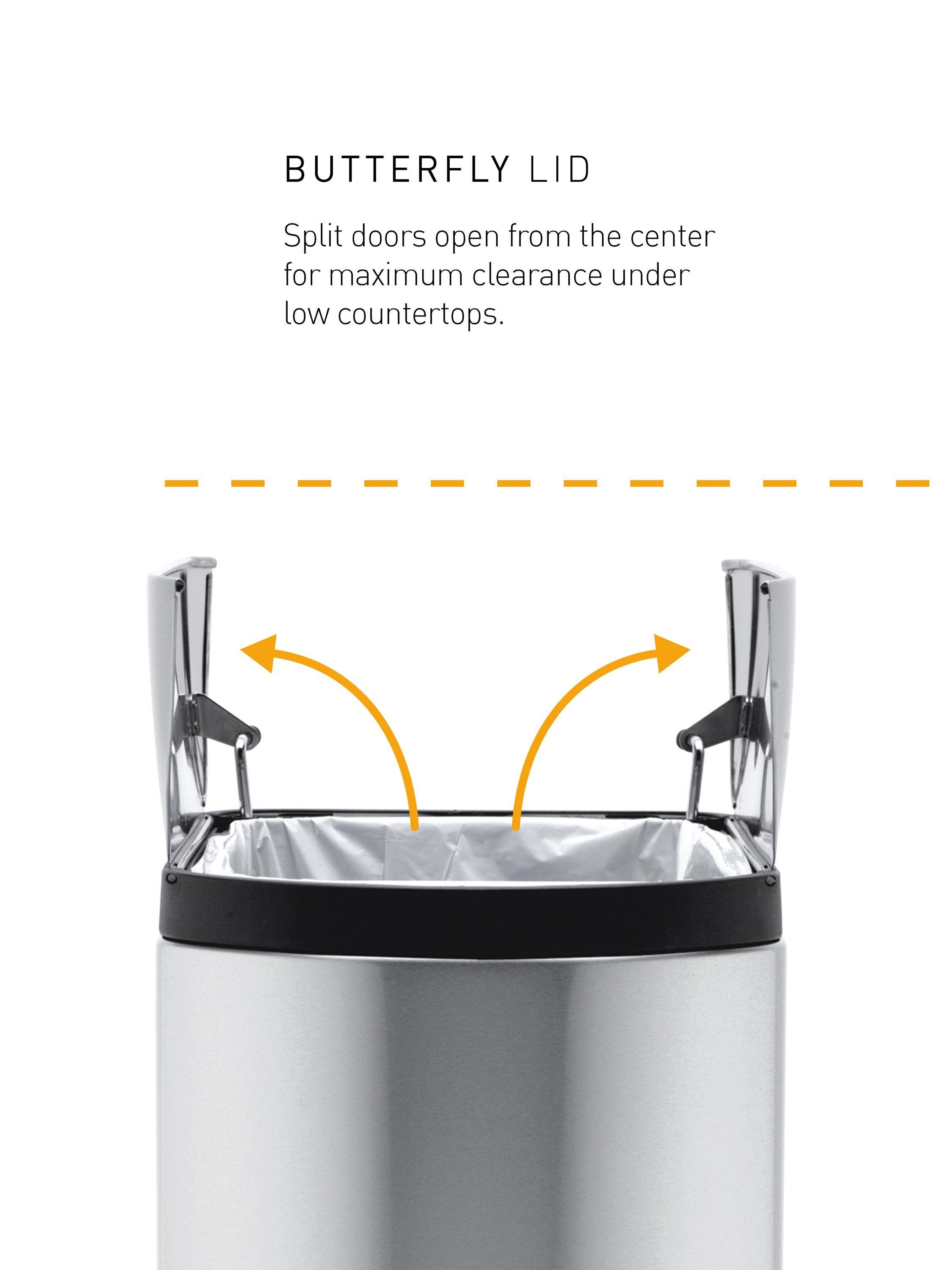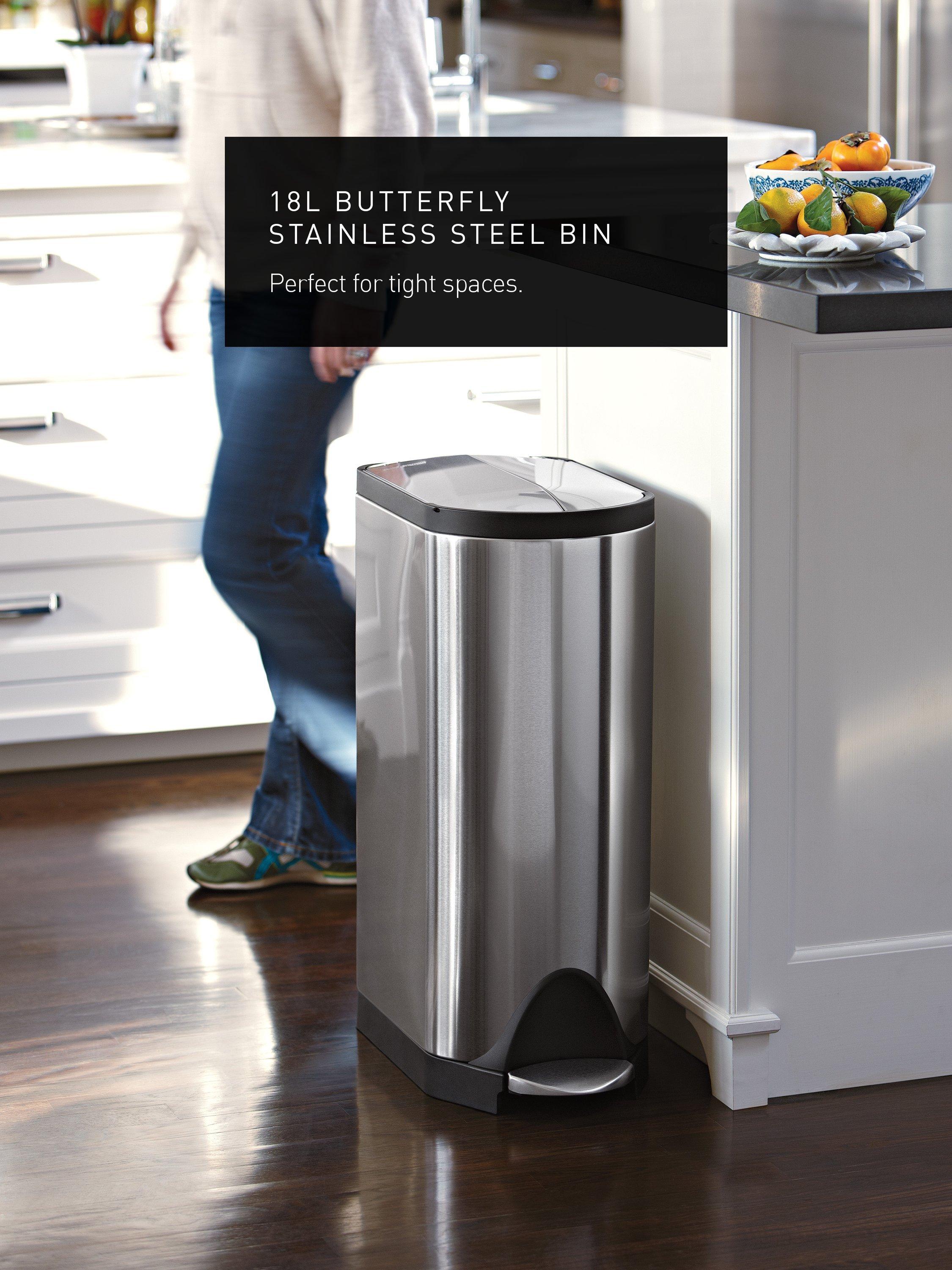 The simplehuman 18L butterfly pedal bin has an innovative butterfly lid design that opens from the centre for maximum clearance under low tabletops. It also has a taller, narrower shape than the 20L butterfly pedal bin that makes the most of really tight spaces. The strong steel pedal and patented lid shox technology ensure the bin will function smoothly and quietly for years.