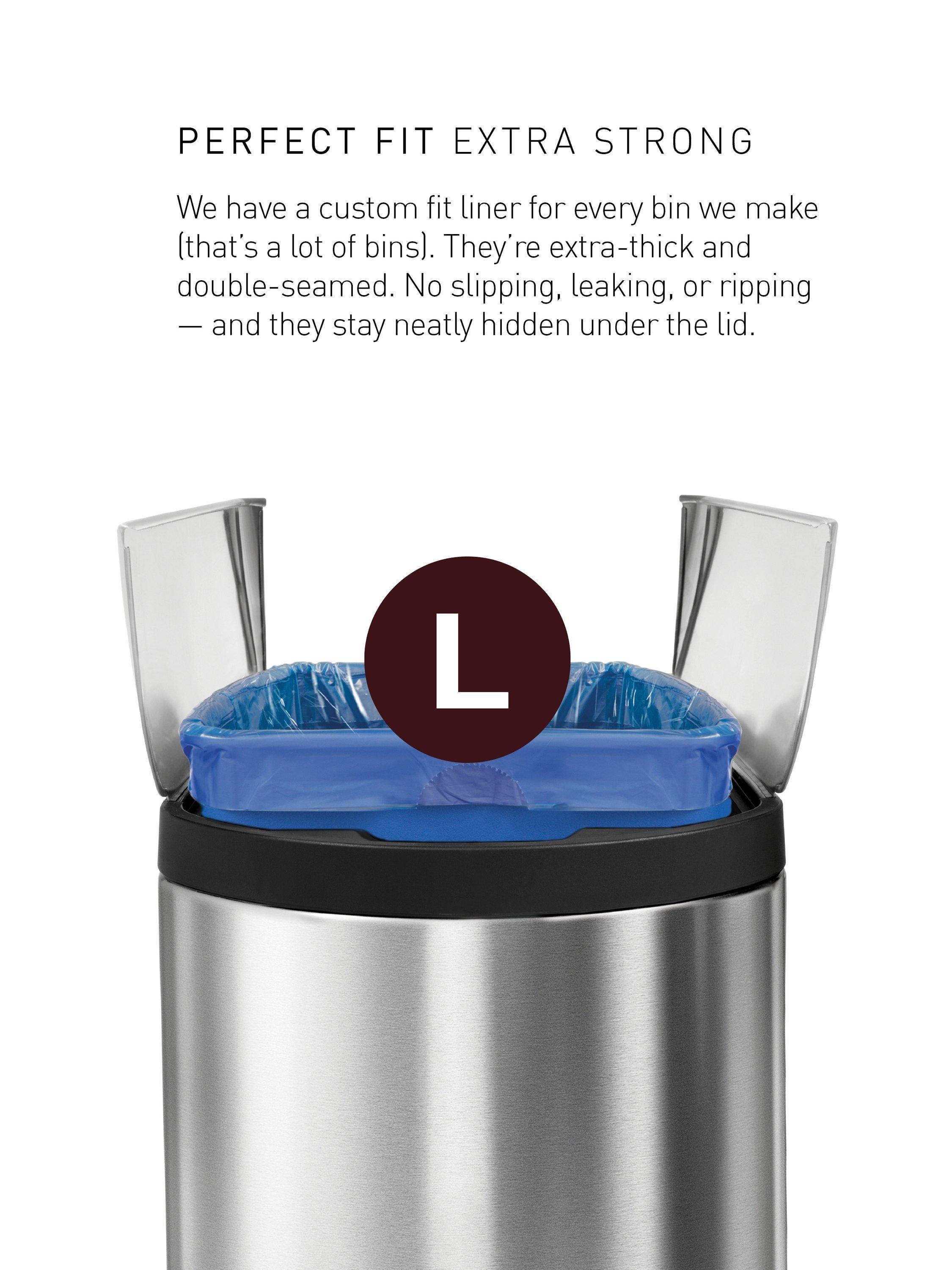 - Perfect fit - extra strong: simplehuman's code L custom fit liners fit this bin perfectly so there's no bunching, slipping or messy bag overhang for a neater, cleaner look. They are also extra-thick and double-seamed so you can pack your liner to the rim without rips, leaks or tears
