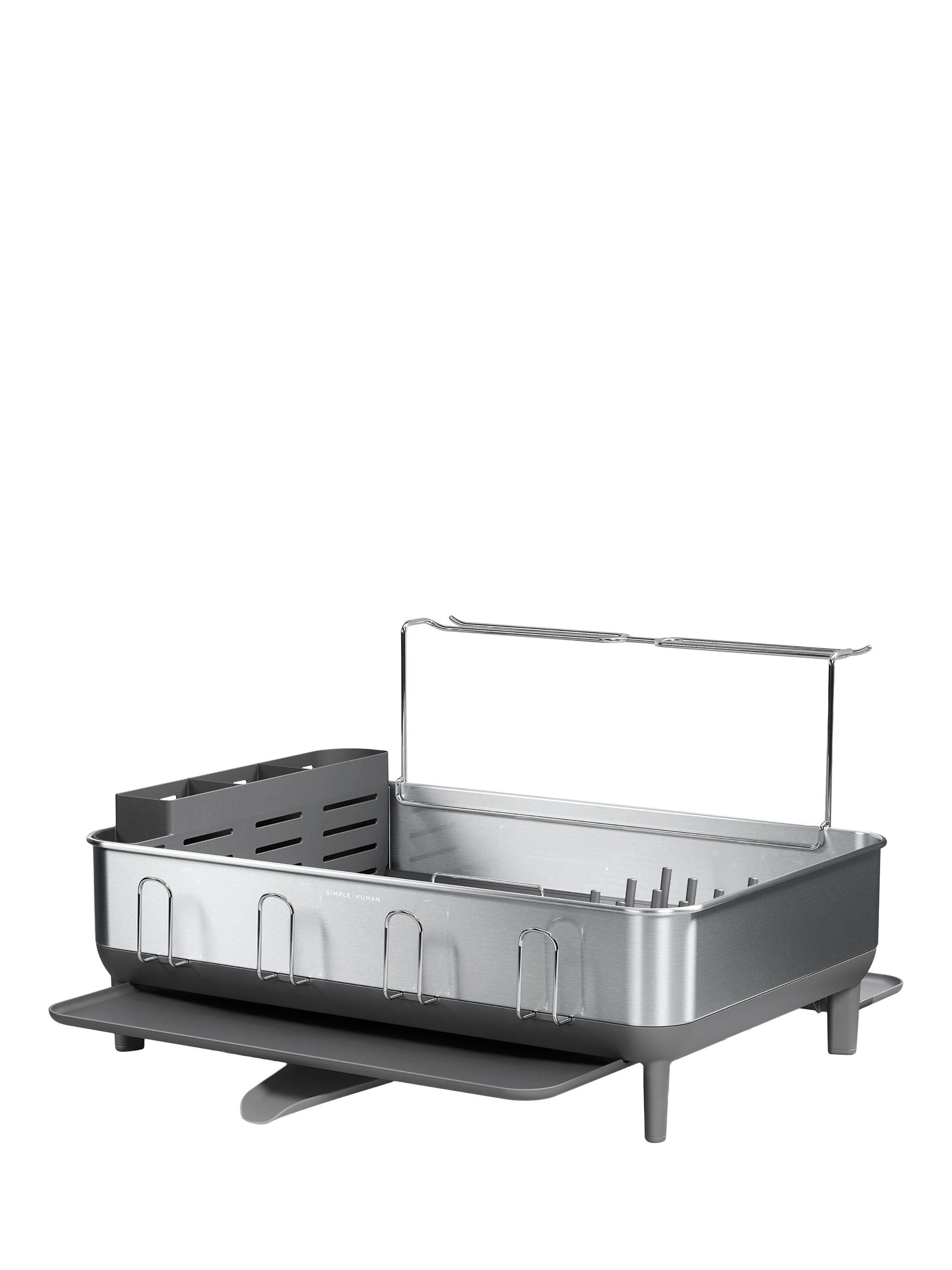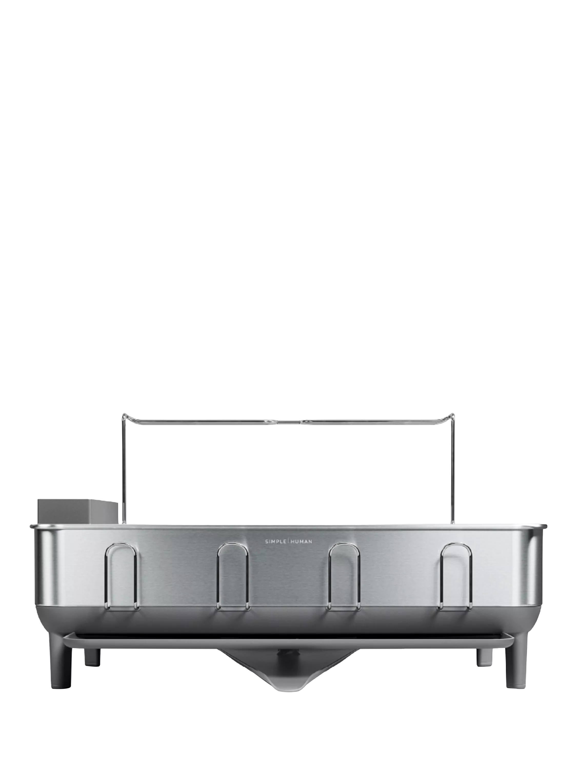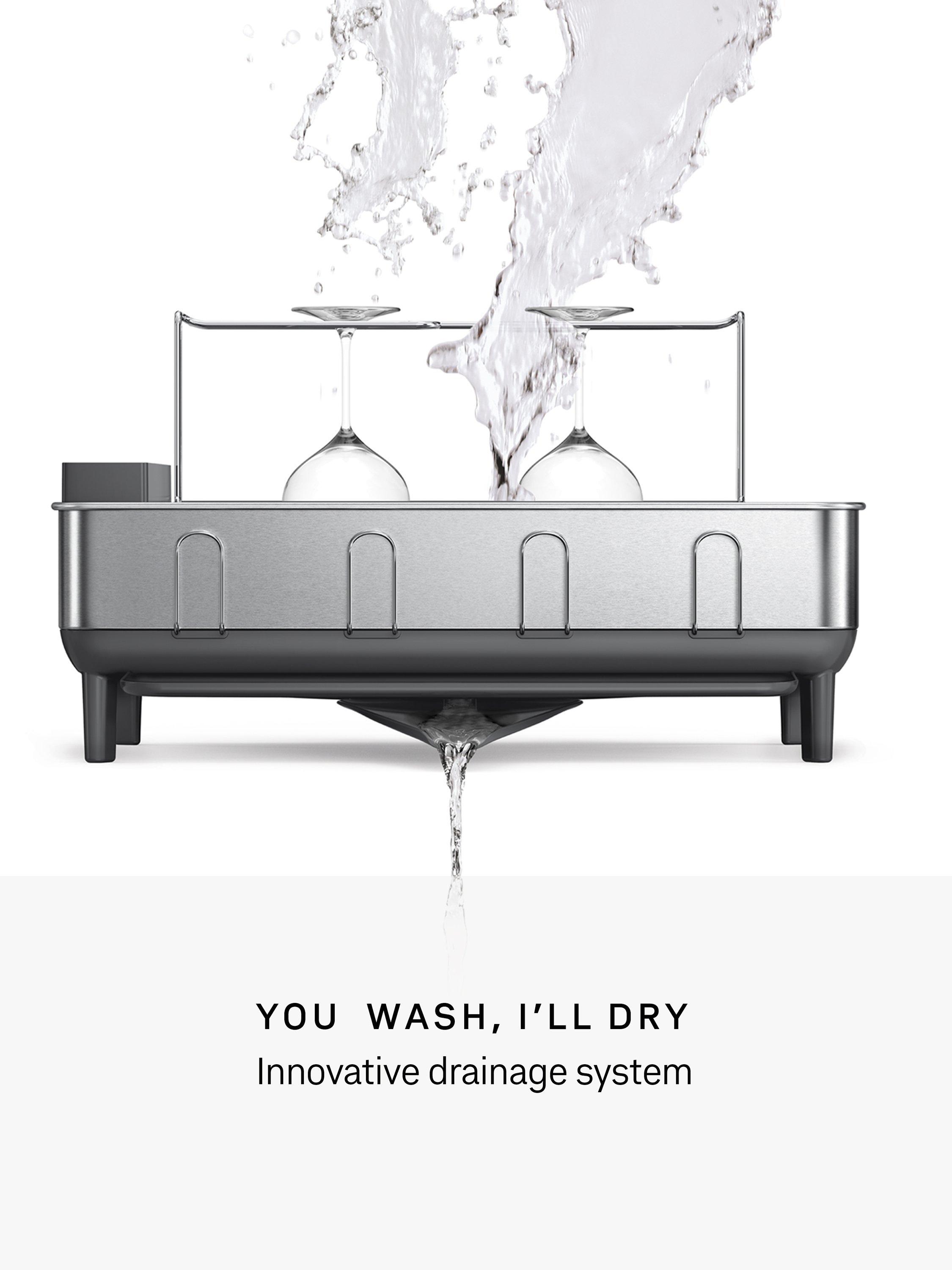 This Simplehuman dish rack has a solid stainless steel frame that matches the aesthetic of modern upscale kitchen appliances.
