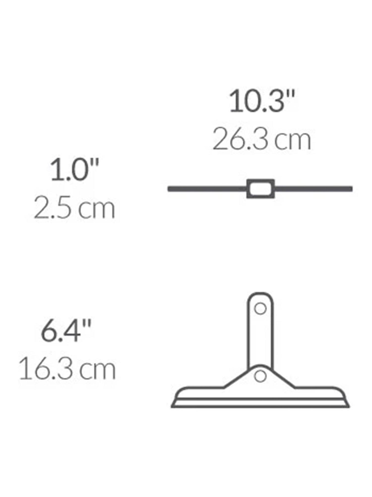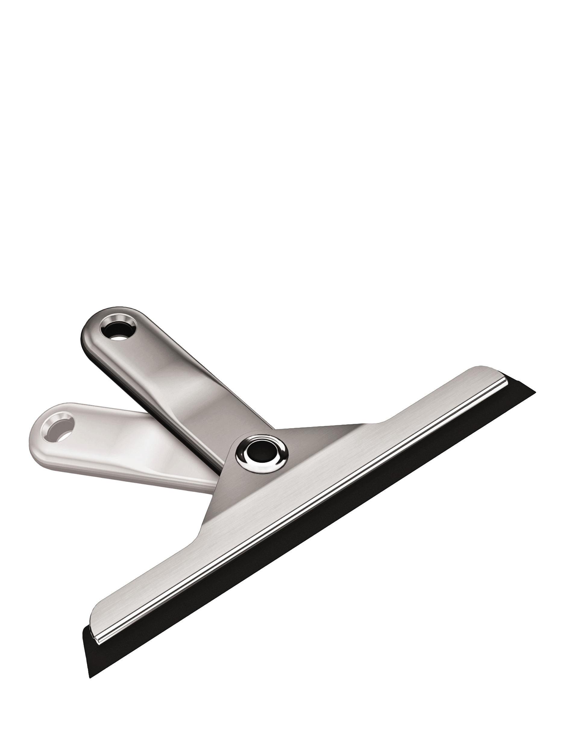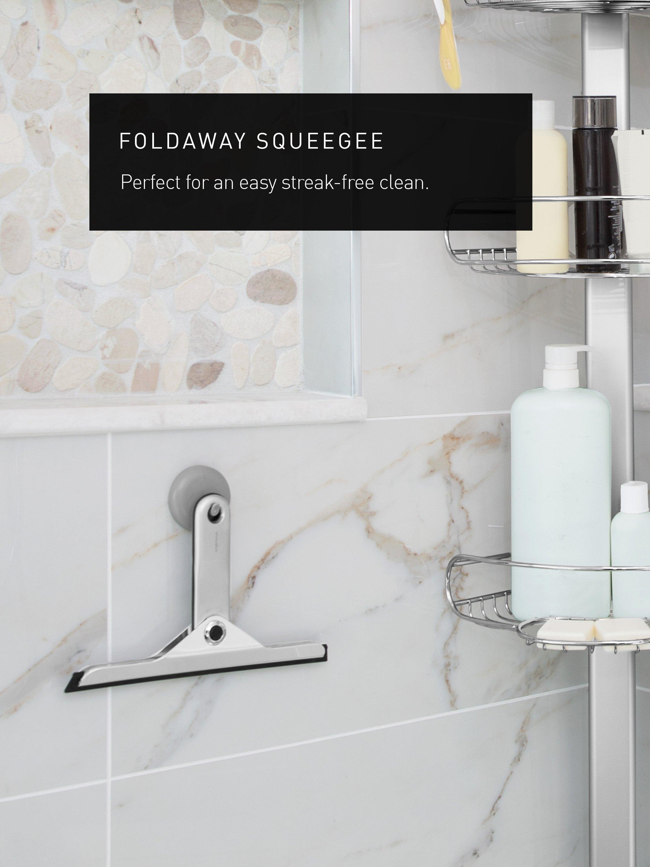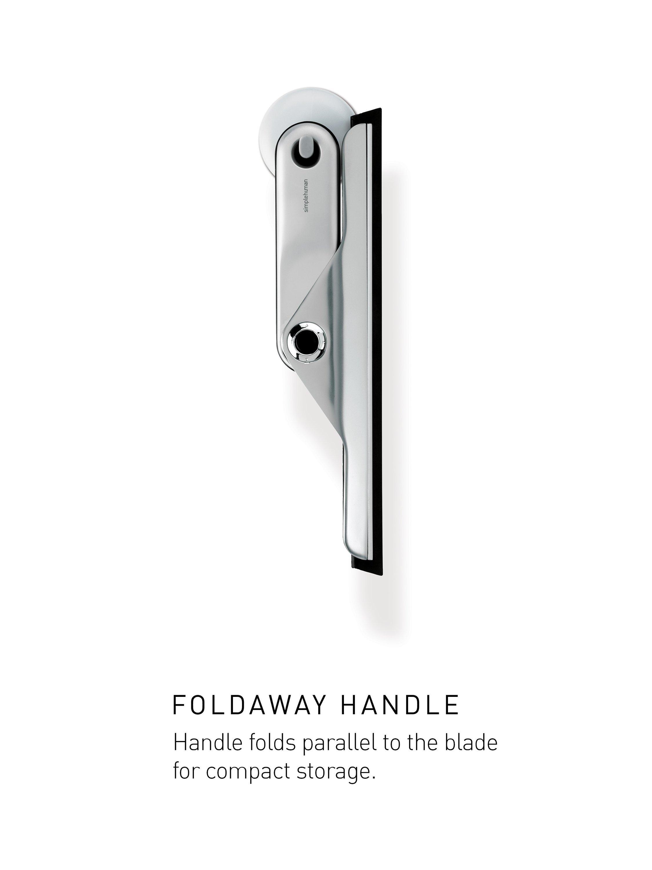 The simplehuman foldaway squeegee has a die-cast zinc handle that folds up for easy storage. The precisely angled blade and weighted handle are designed to smoothly glide across glass surfaces for an easy, streak-free clean.