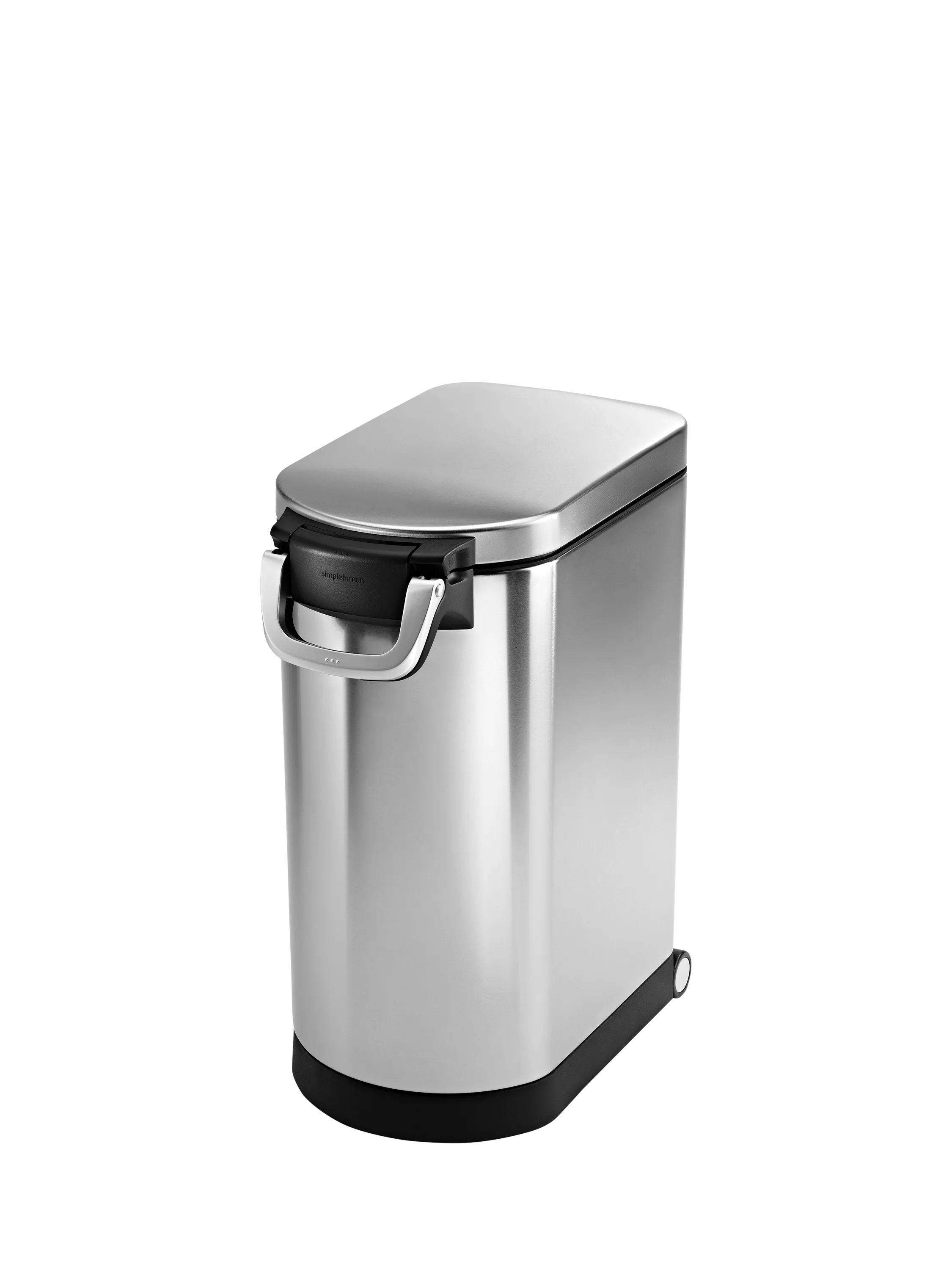 The simplehuman pet food storage container has a robust lock-tight handle that keeps food in and pets out. A silicone gasket forms an airtight seal so food stays fresh.The bin includes a convenient scoop that attaches magnetically under the lid. The storage container's large capacity (14-16 kg) is ideal for storing dog or pet food or other bulk items like flour, rice or sugar.