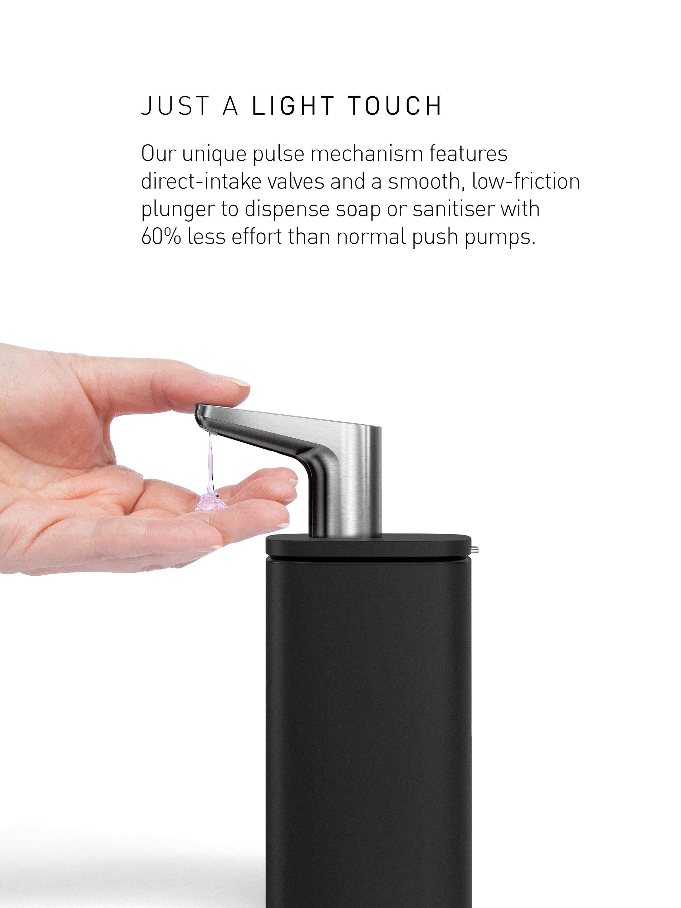 The simplehuman stainless steel pulse pump is engineered from the inside out. Its innovative design includes a large pump tube that allows for greater soap (or sanitiser) flow, no matter how thick the product, with far less effort. Ball bearings located at the top and bottom of the pump keep air from entering, which prevents soap from dripping, leaking or drying out. Just a light touch on the spout provides a generous portion of soap. Fast, neat and nearly effortless, it is a uniquely satisfying experience.