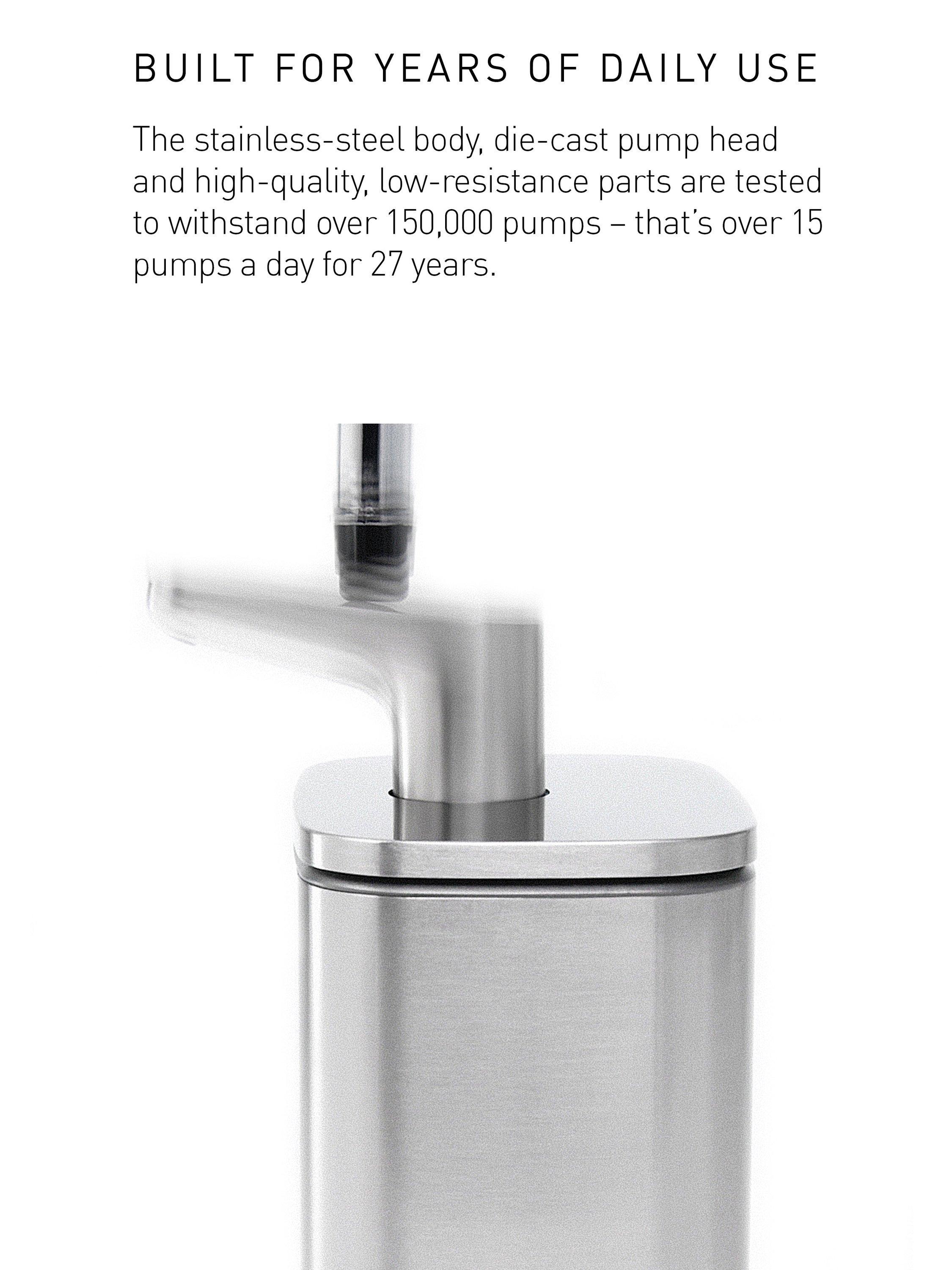 - Built for years of daily use: the stainless-steel body, die-cast pump head and high-quality, low-resistance parts are tested to withstand over 150,000 pumps - that's over 15 pumps a day for 27 years