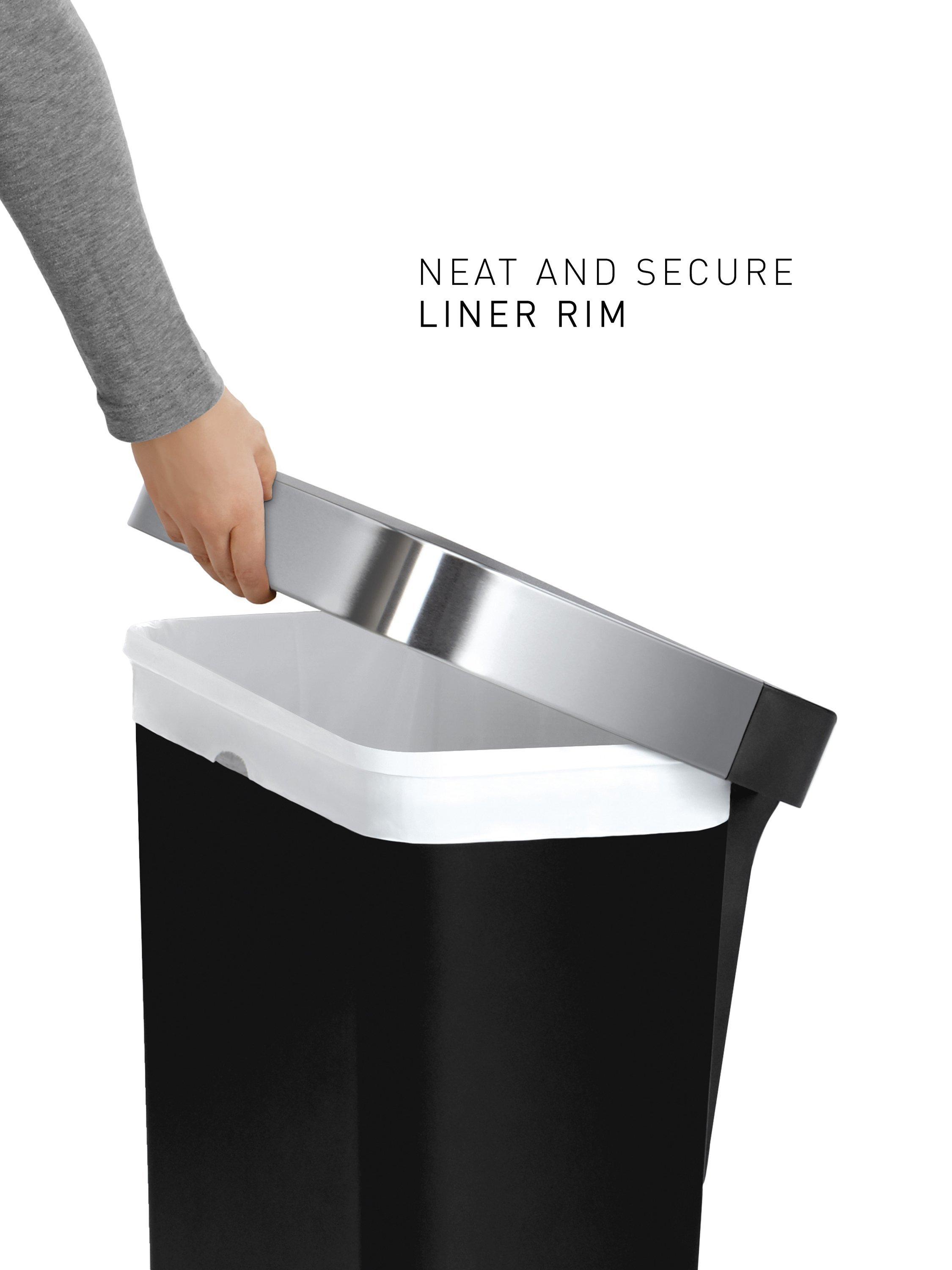 - Neat and secure: stainless steel liner rim flips up for a quick and easy liner change, then closes over the liner to hold it tightly in place and keep it hidden from sight