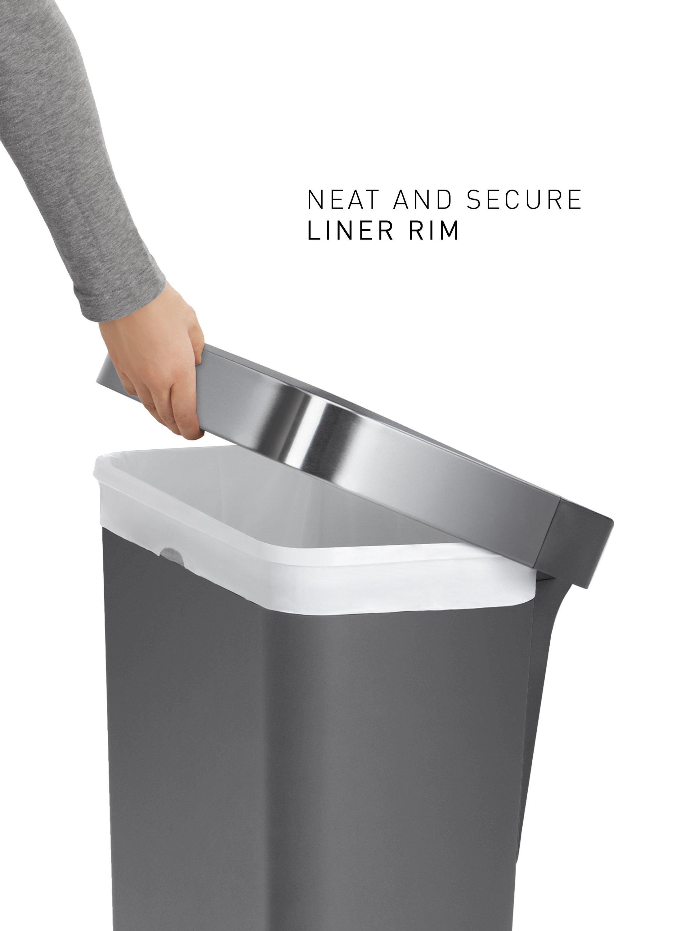 - Neat and secure: stainless steel liner rim flips up for a quick and easy liner change, then closes over the liner to hold it tightly in place and keep it hidden from sight