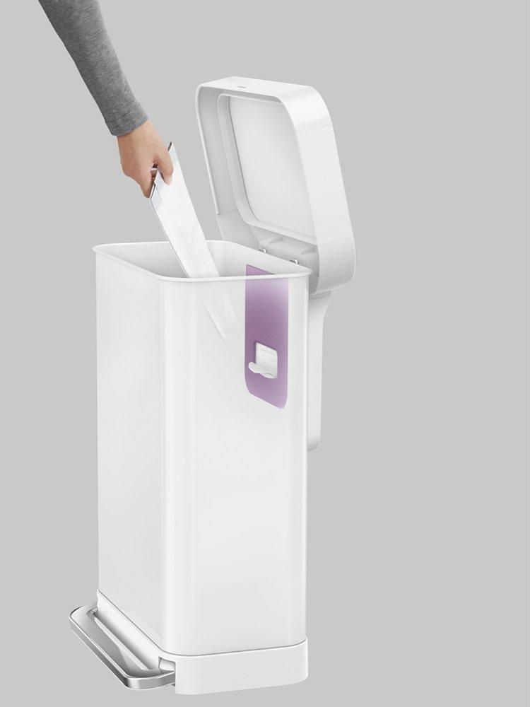 Simplehuman's new rectangular step can features an innovative "liner pocket" that keeps liners at your fingertips for a faster change.