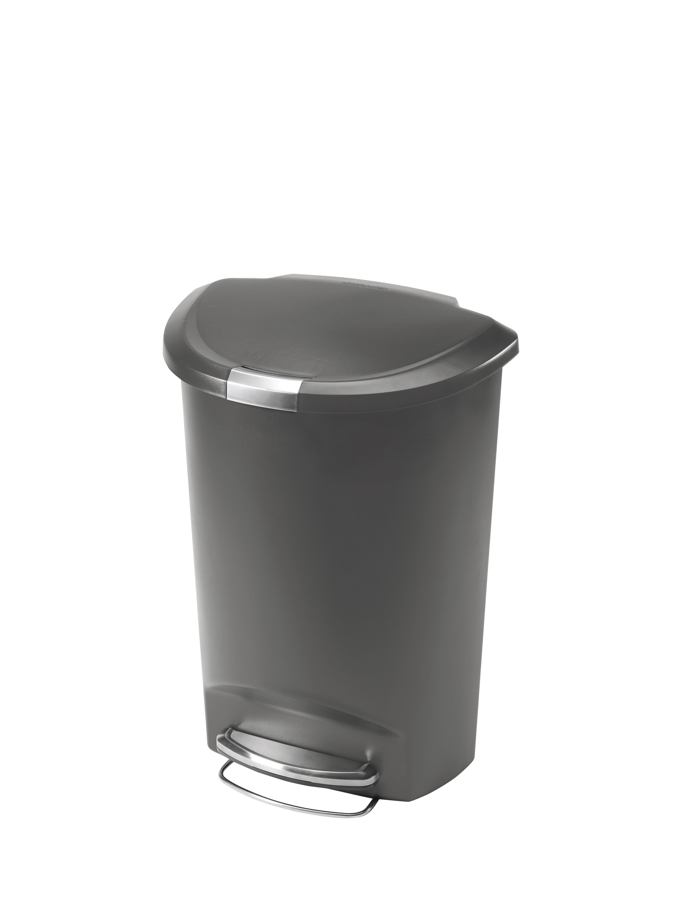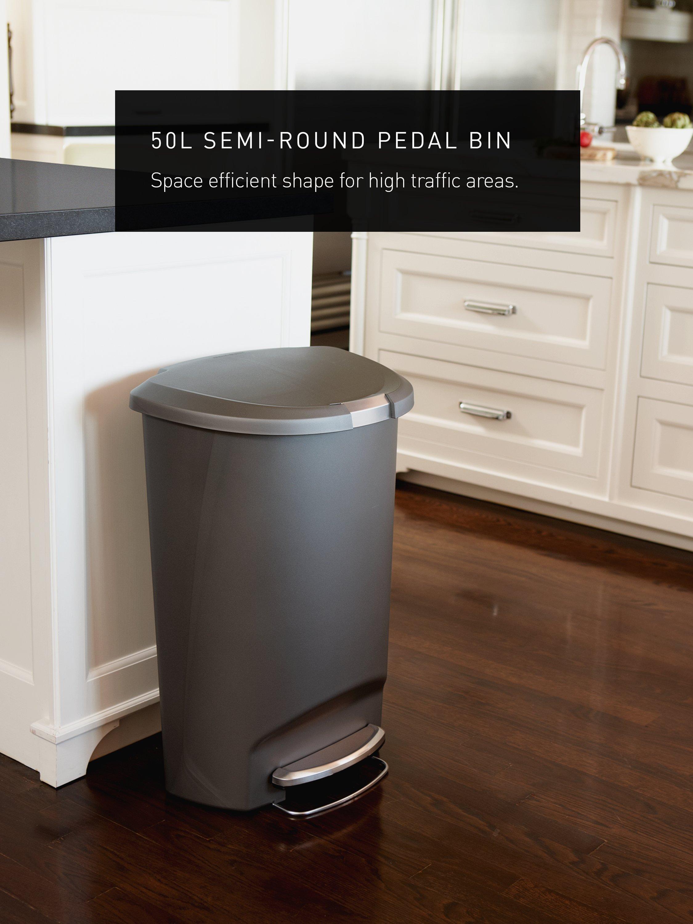 The simplehuman semi-round plastic pedal bin has a flat back for easy placement against the wall and out of the way. Its large capacity also makes it an ideal choice for busy areas around the home. It has a strong steel pedal that is designed to last, and patented lid shox technology ensures a smooth, silent close every time. A slide lock helps keep rubbish in and pets and curious children out.
