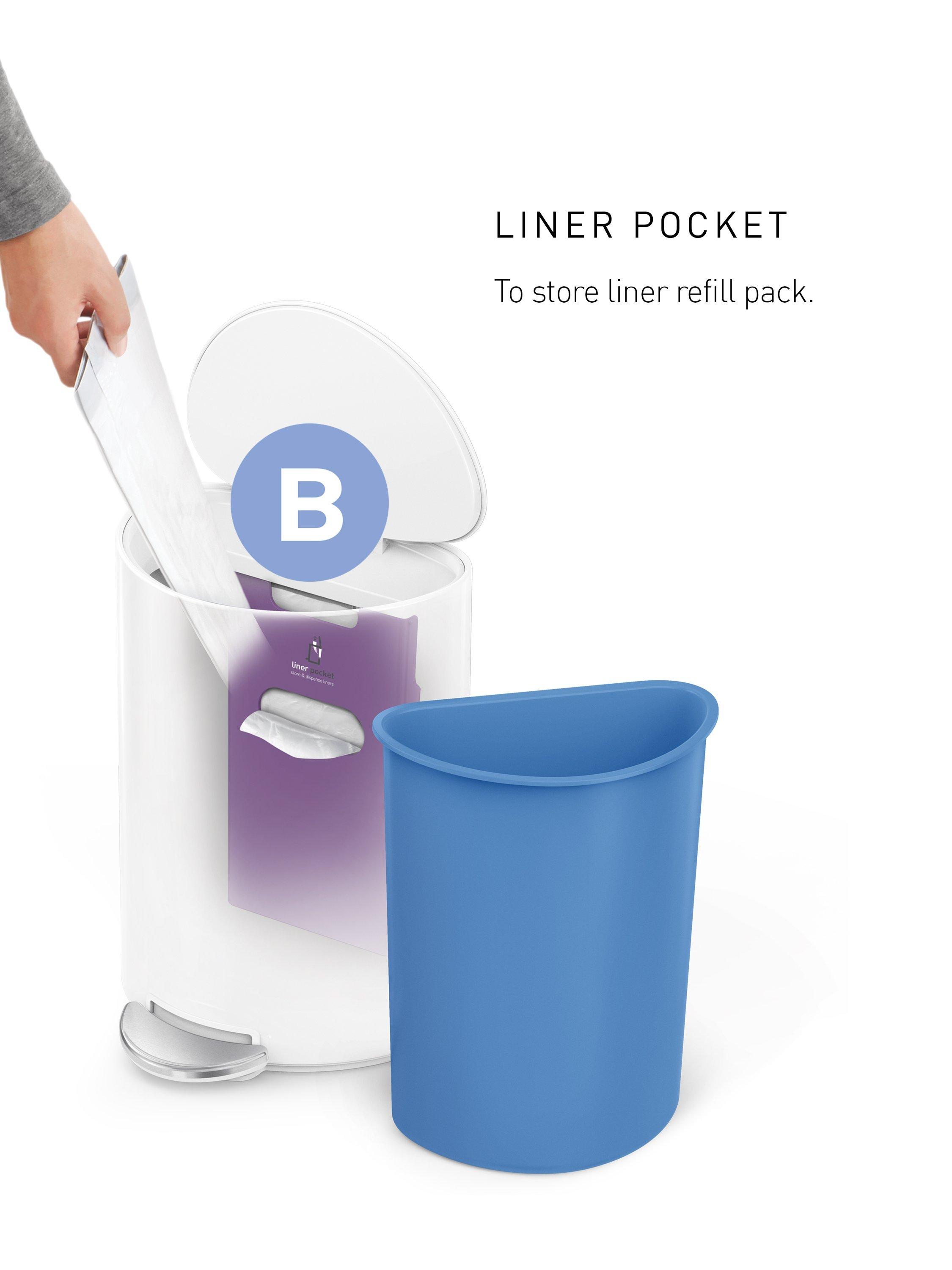 A soft, semi-round shape and invisible hinge make this bin perfect for tight spaces. The liner pocket stores and dispenses liners one at a time for a faster liner change. The durable steel pedal is designed to last and patented lid shox technology ensures a smooth, silent close every time.