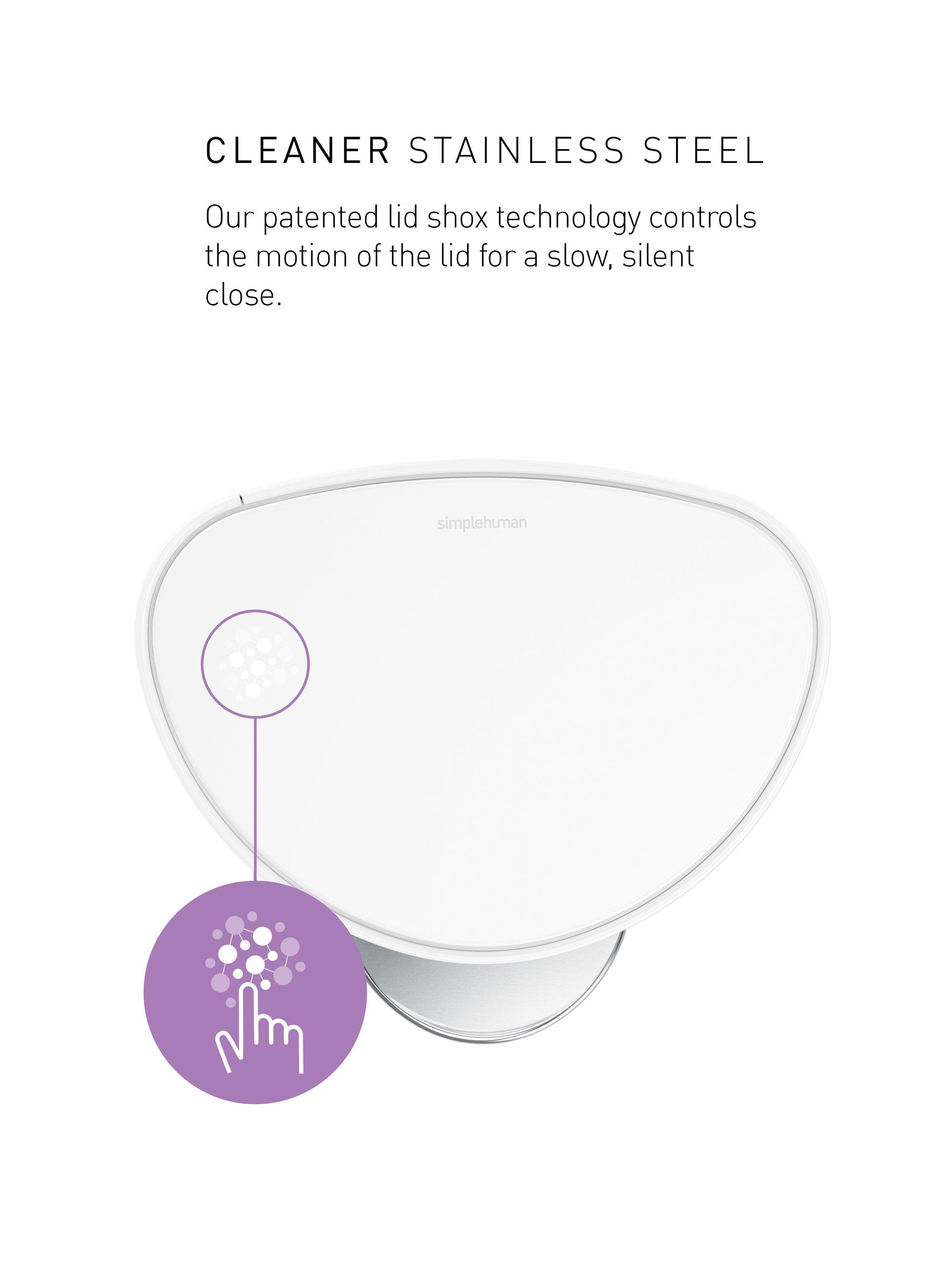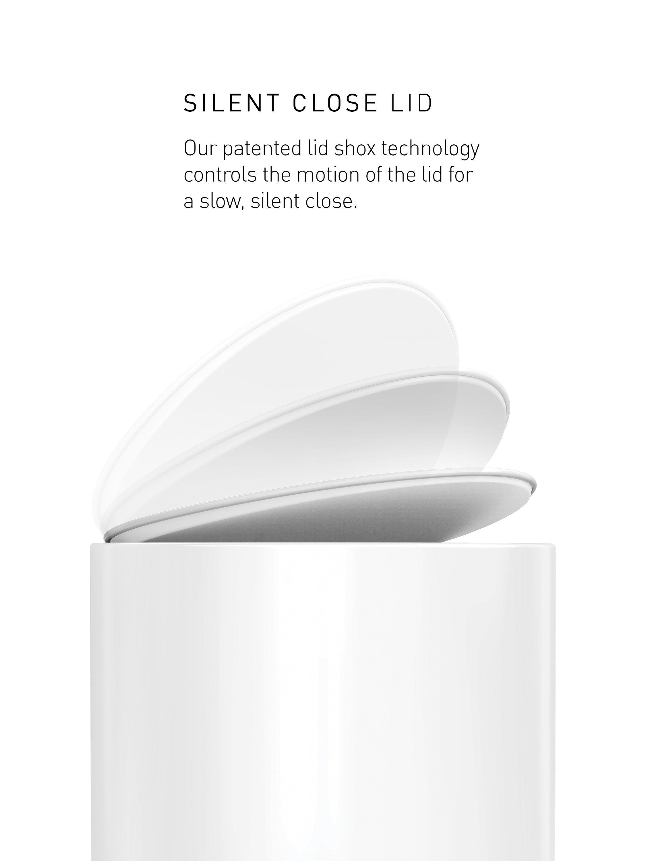 - I'm the strong, silent type: the strong pedal is engineered to last over 150,000 steps - that's more than 20 steps a day for 20 years - and simplehuman's patented lid shox technology controls the motion of the lid for a slow, silent close