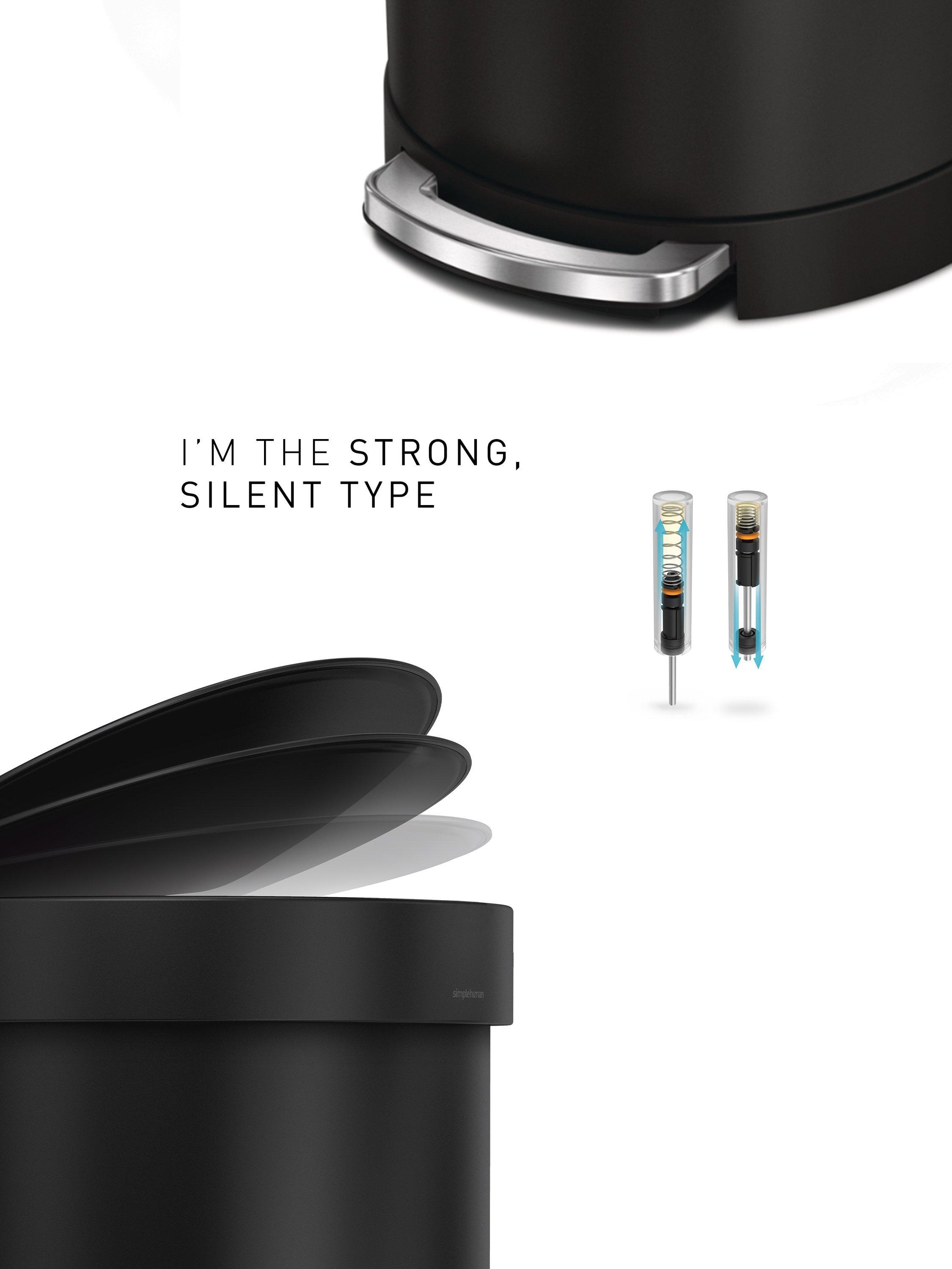 I'm the strong, silent type: the strong steel pedal is engineered to last over 150,000 steps - that's more than 20 steps a day for 20 years - and simplehuman's patented lid shox technology controls the motion of the lid for a slow, silent close.