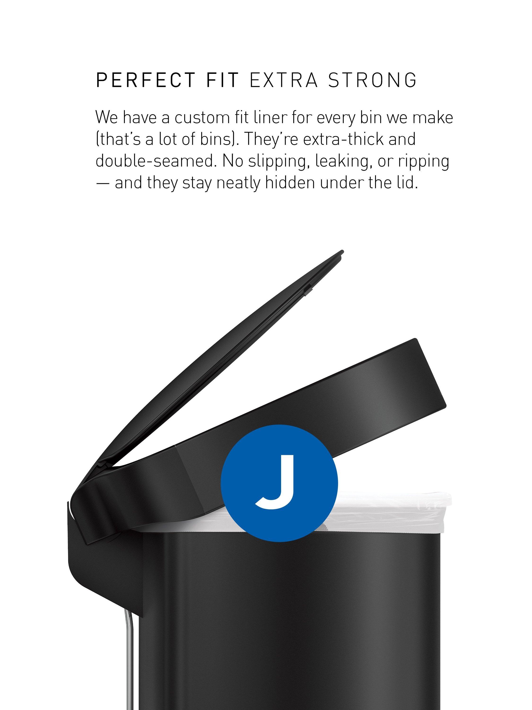 Perfect fit - extra strong: simplehuman's code J custom fit liners fit this bin perfectly so there's no bunching, slipping or messy bag overhang for a neater, cleaner look. They are also extra-thick and double-seamed so you can pack your liner to the rim without rips, leaks or tears.