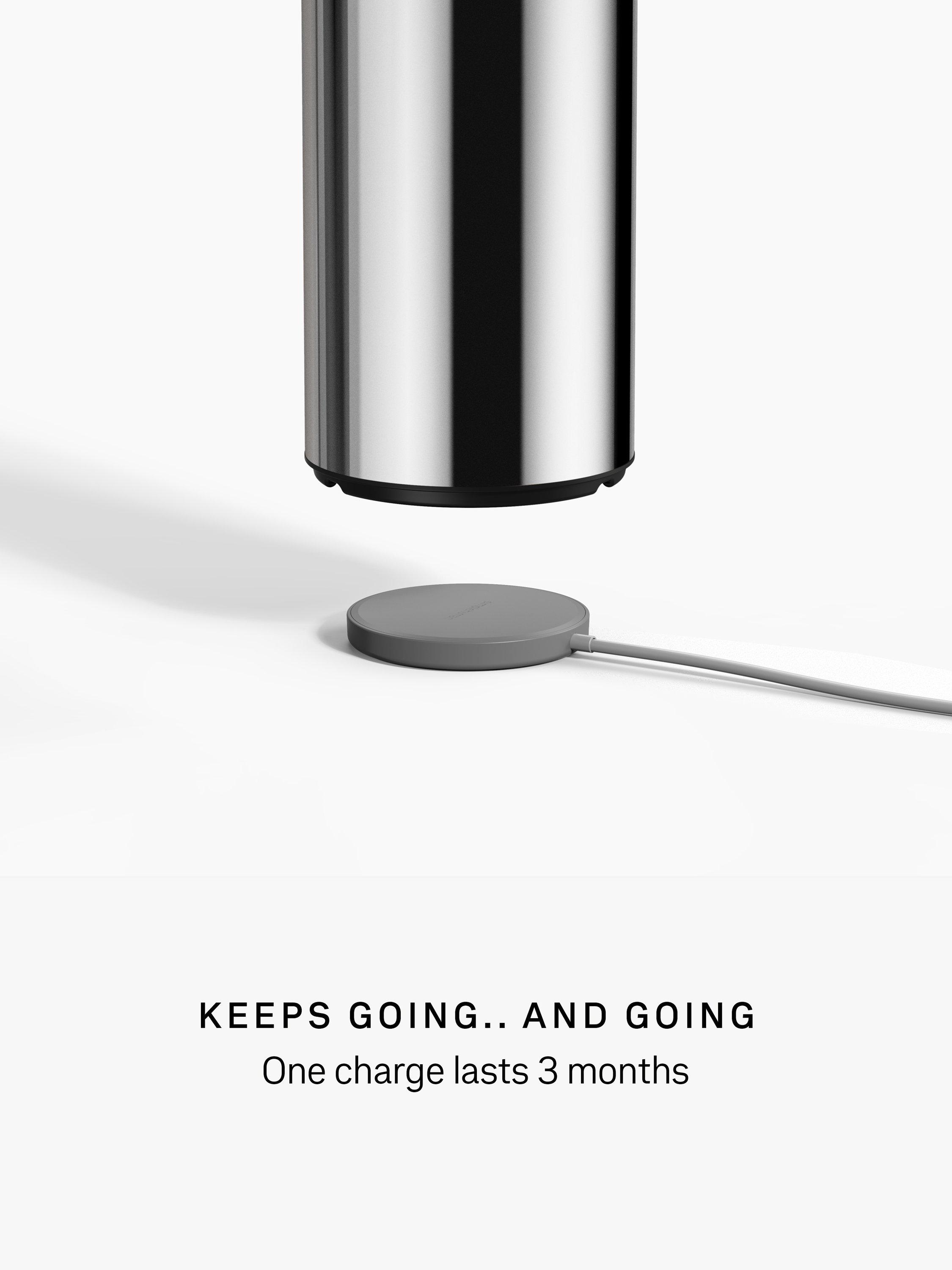 A fast, precise motion sensor triggers the aerating diaphragm pump to deliver just the right amount of rich, thick, pre-lathered foam. To control the amount of soap desired, position your hand up close to the sensor for a little soap and farther away for more. Touch-free so no germs or smudges are left behind. Waterproof for easy cleaning. Fast recharge with 360° magnetic charging puck — one charge lasts 3 months. Includes matching caddy, ceramic rinse cup, and soap tablet sample.