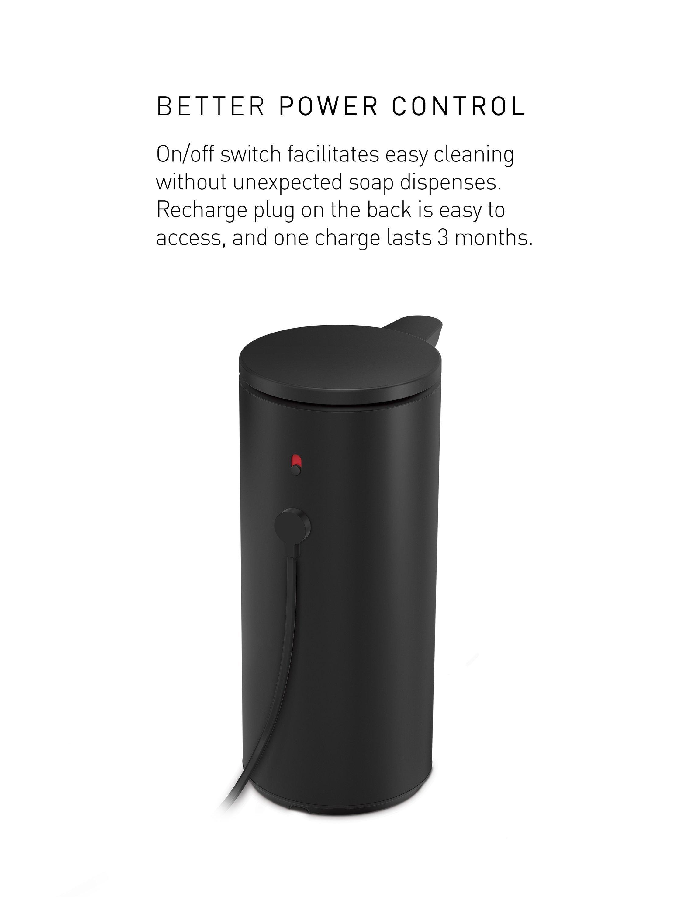 - Better power control: on/off switch facilitates easy cleaning without unexpected soap dispenses. Recharge plug on the back is easy to access, and one charge lasts 3 months