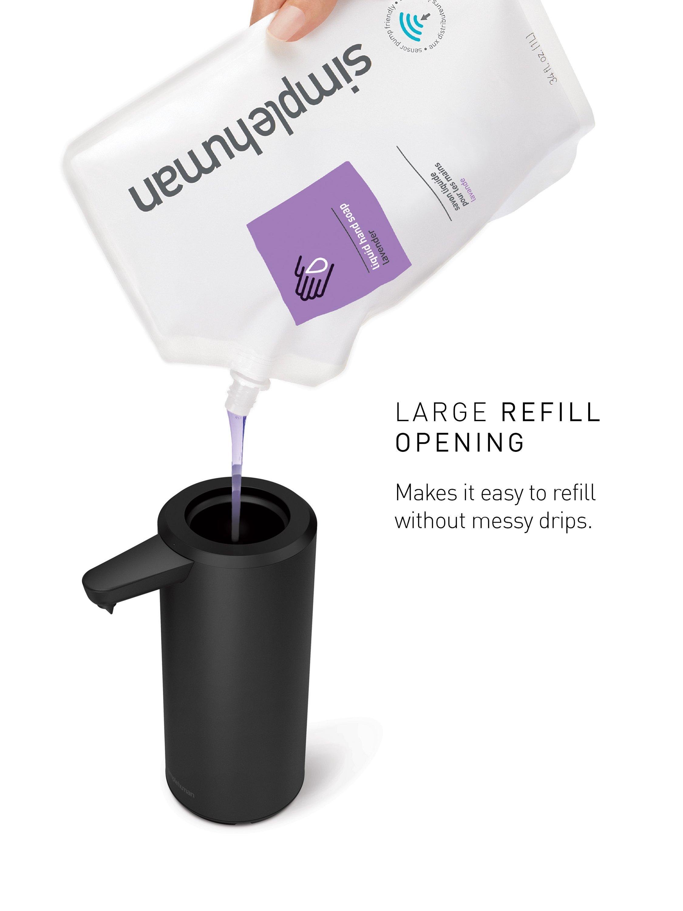 To control the amount of soap desired, you can position your hand up close to the sensor for a little soap and farther away for more. Wide refill opening makes refills fast and easy, and there's a QR code under the lid so you can reorder soap in a flash. It's also waterproof for easy cleaning.