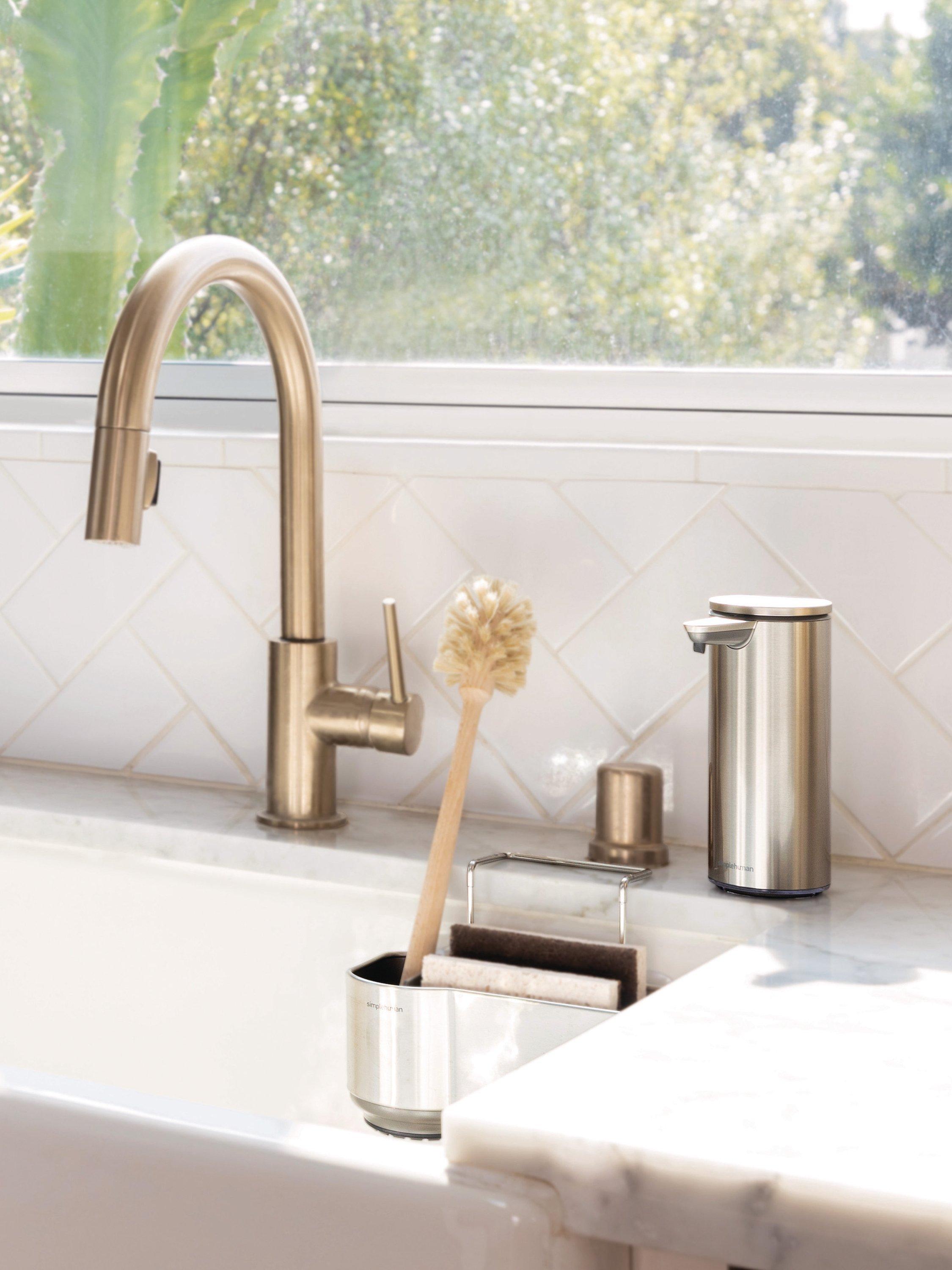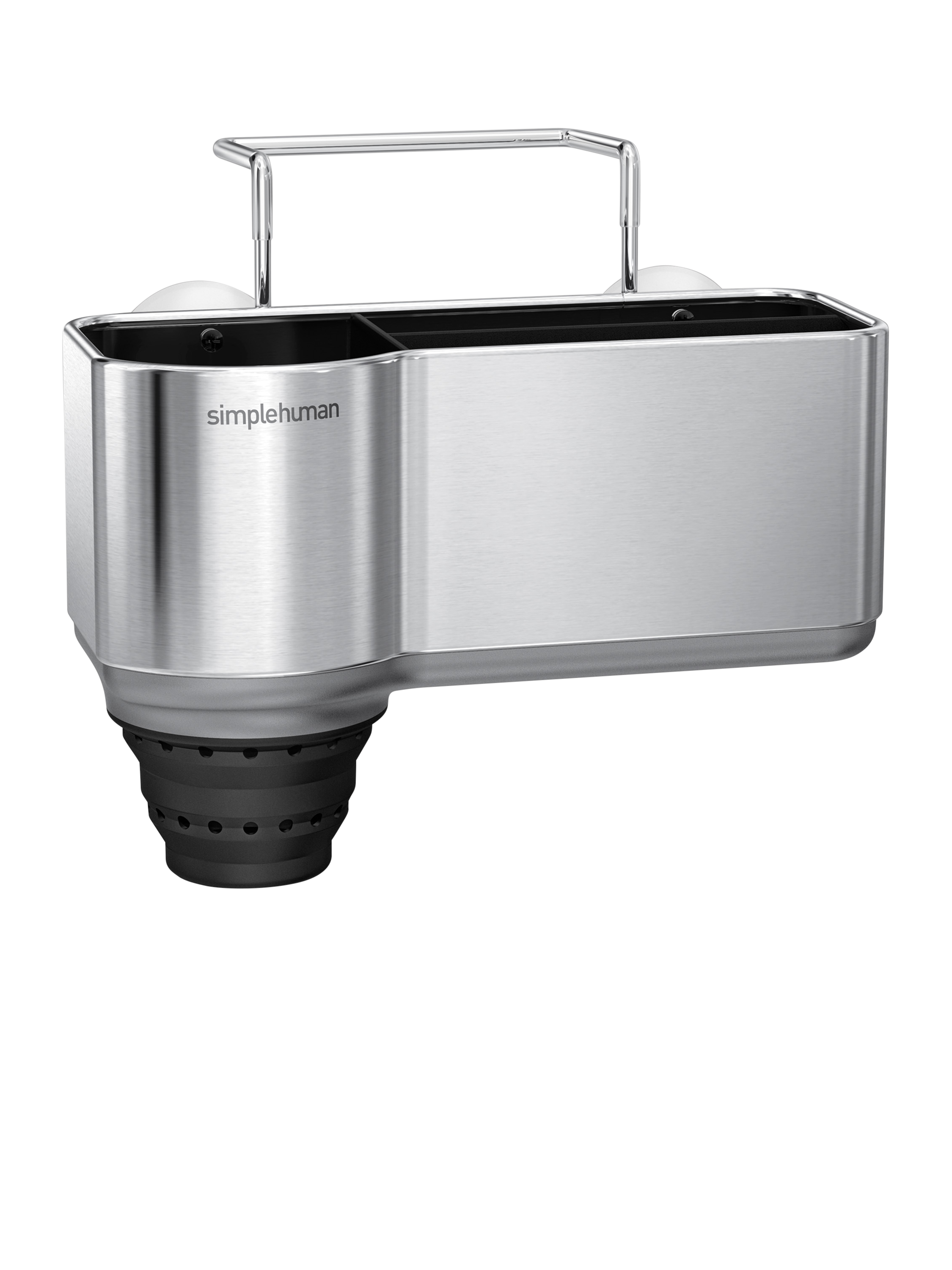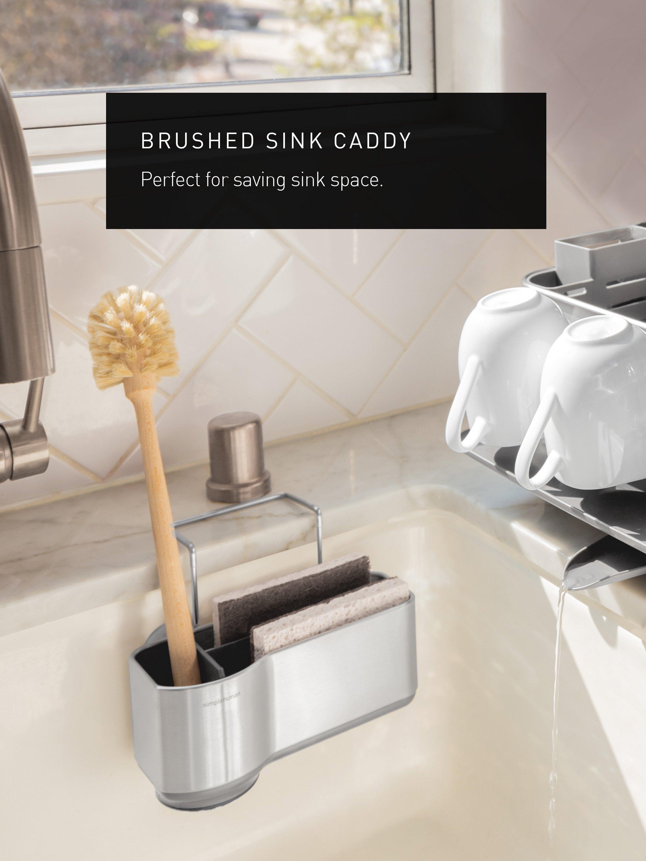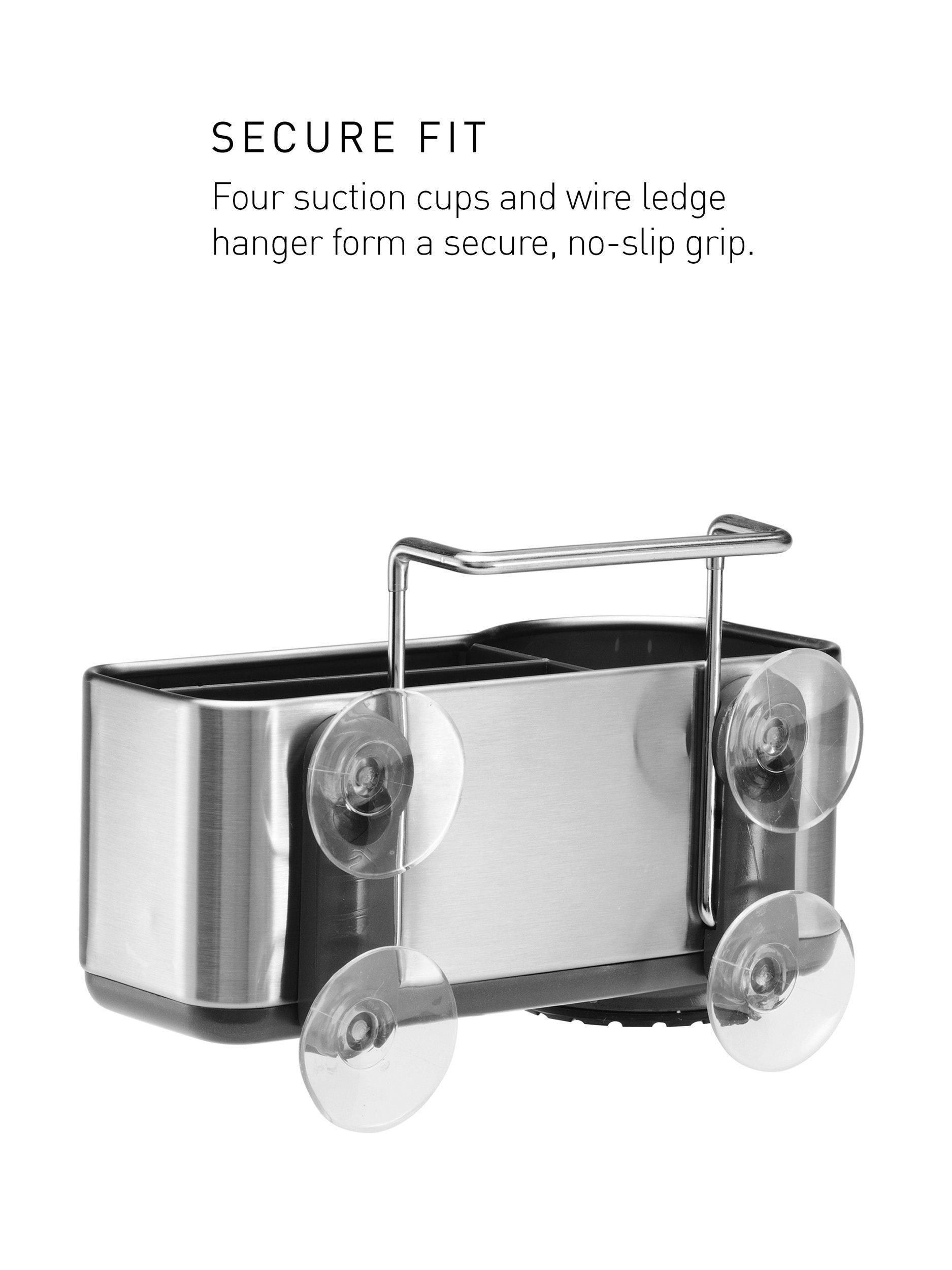 The simplehuman sink caddy keeps your sink area neat and everything you need within easy reach. Four suction cups and a wire ledge hanger provide a secure, non-slip grip on your sink. Elevated plastic dividers store and organise sponges separately while numerous venting holes maximise airflow to help them dry quickly minimising bacteria growth.