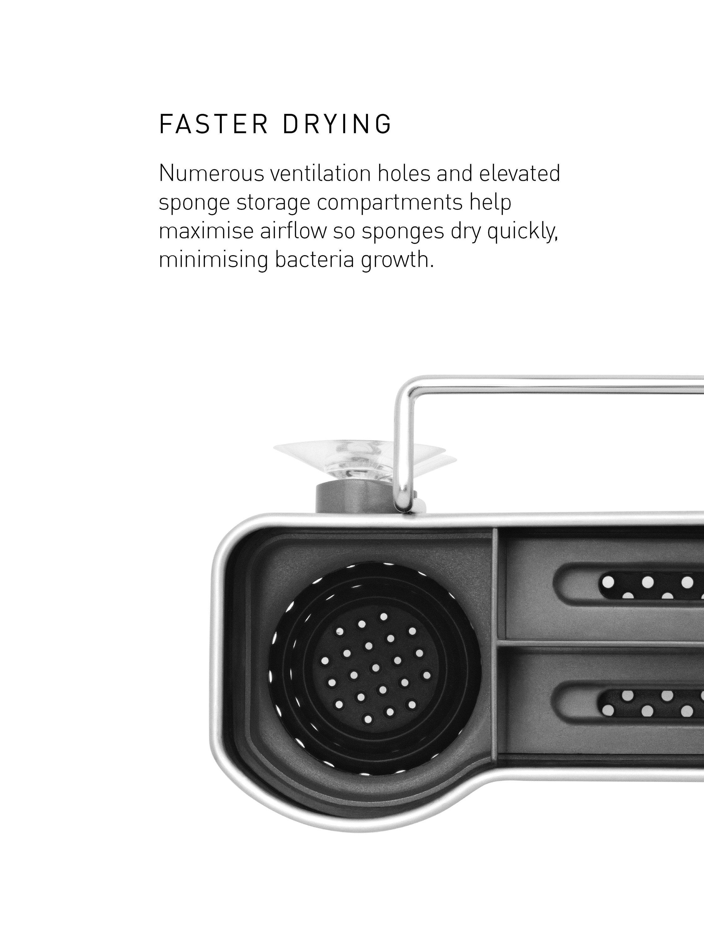 - Faster drying: numerous ventilation holes and elevated sponge storage compartments help maximise airflow so sponges dry quickly, minimising bacteria growth