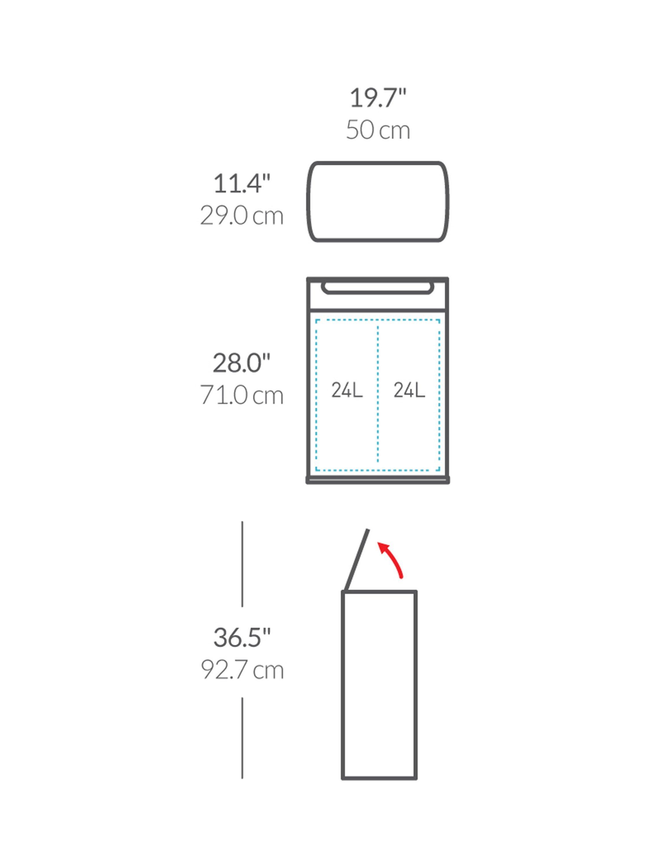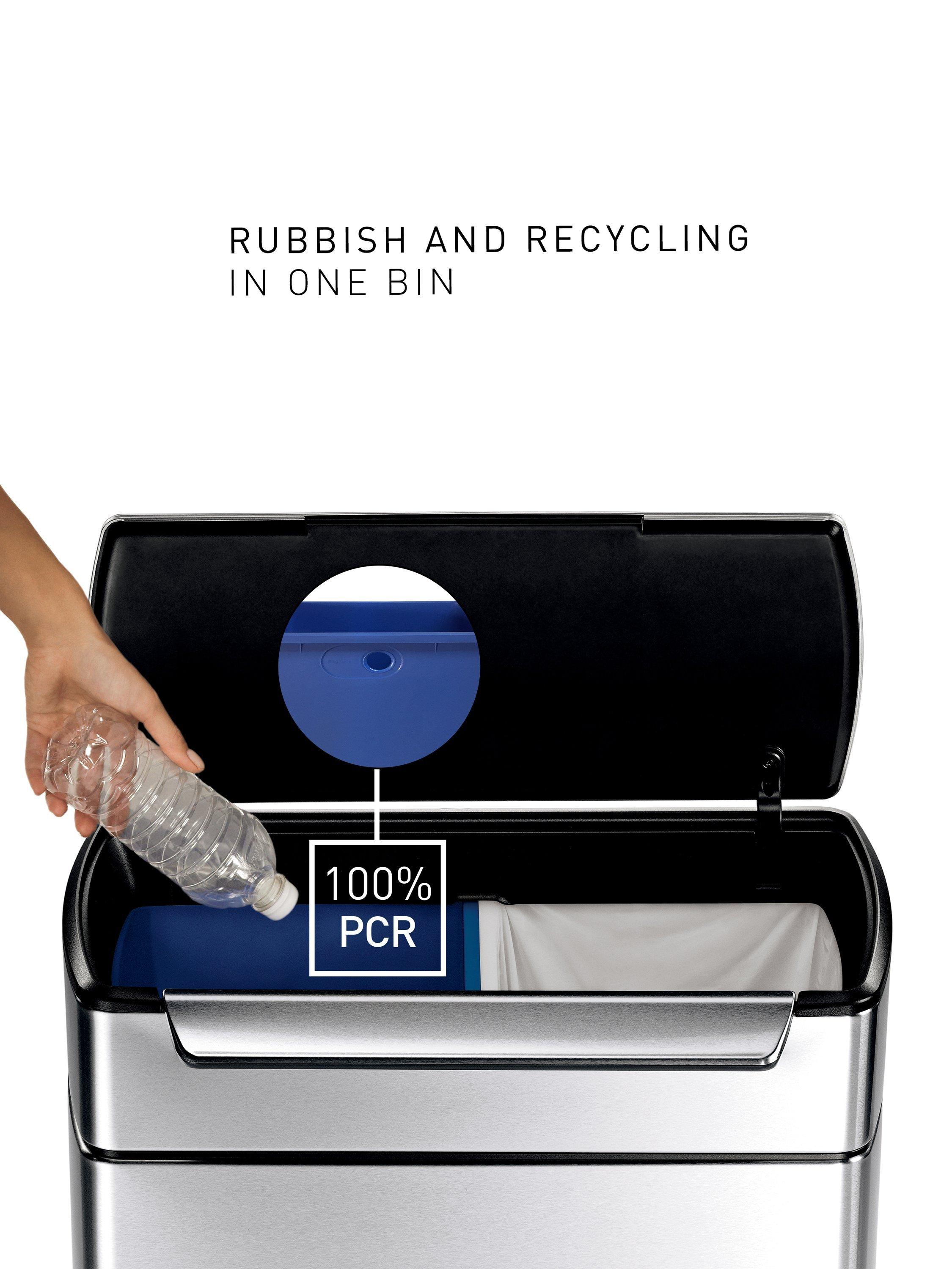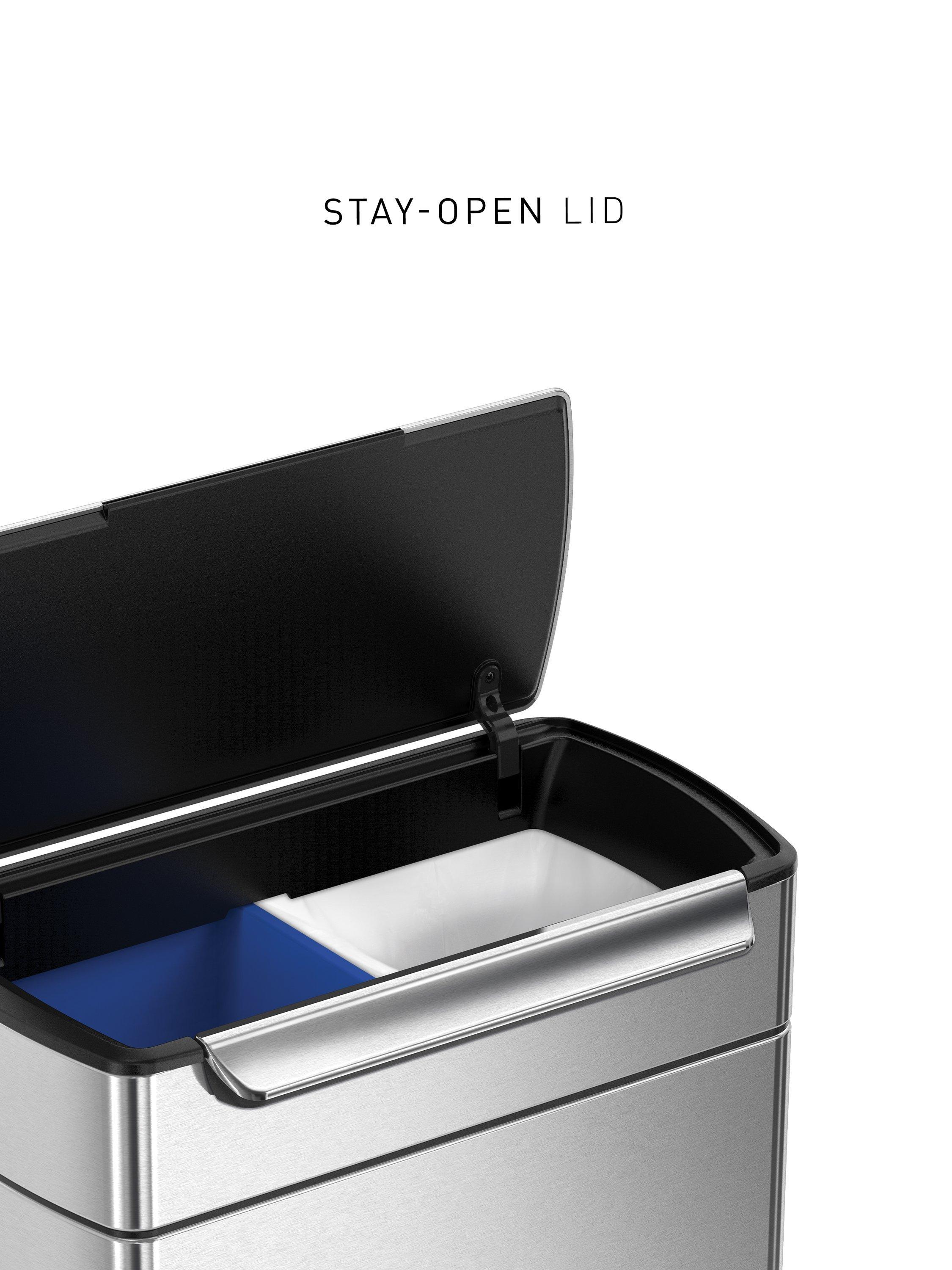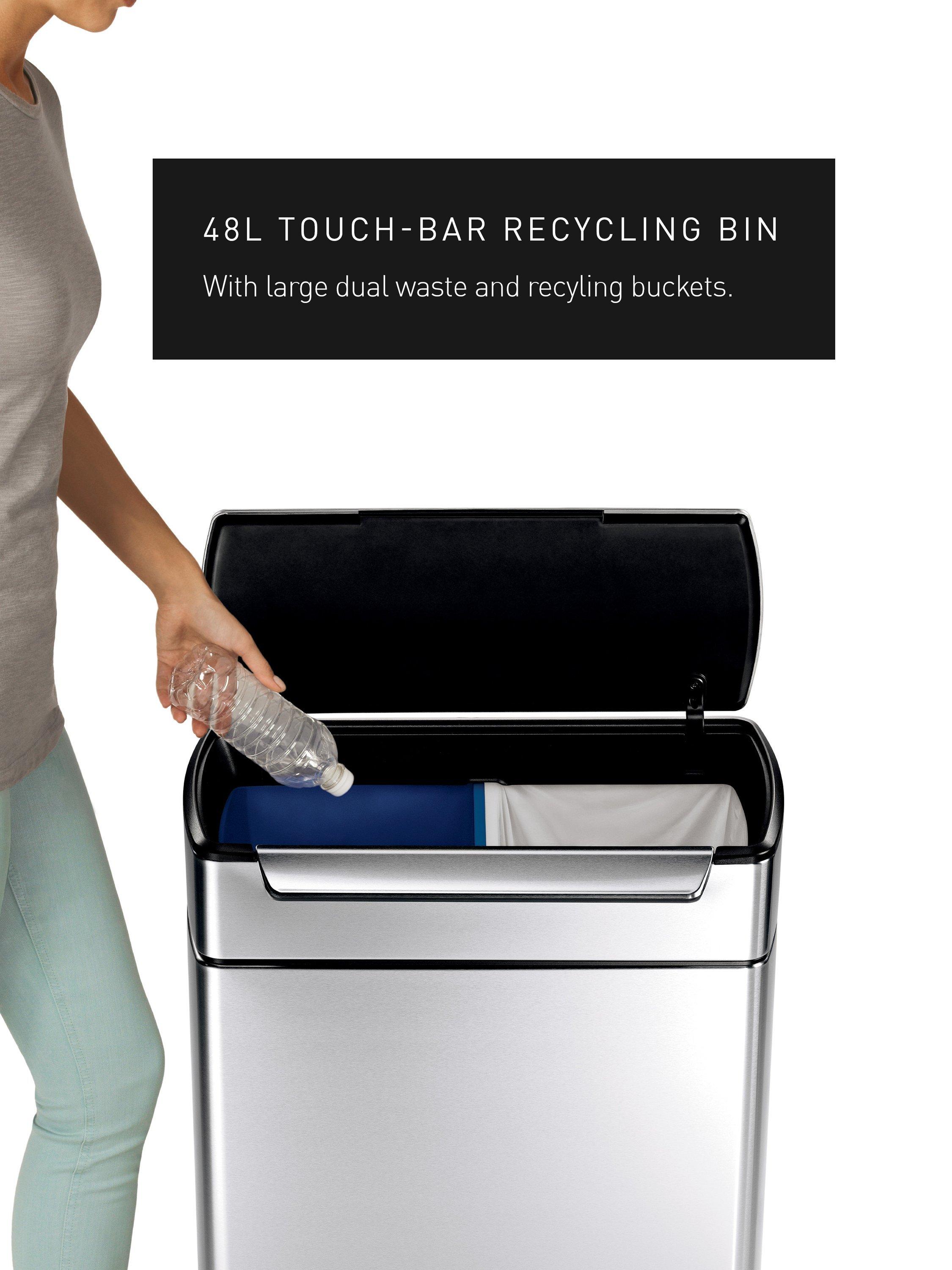 The simplehuman touch-bar recycling kitchen bin has two large inner buckets and a wide opening that make it easy to sort your rubbish and recyclables in one place. It has a unique touch-bar that opens the lid with just a touch of your hand, a tap of your elbow, or a bump of your hip. And it stays open until you are ready to close it - ideal during food prep or while finishing up long chores.