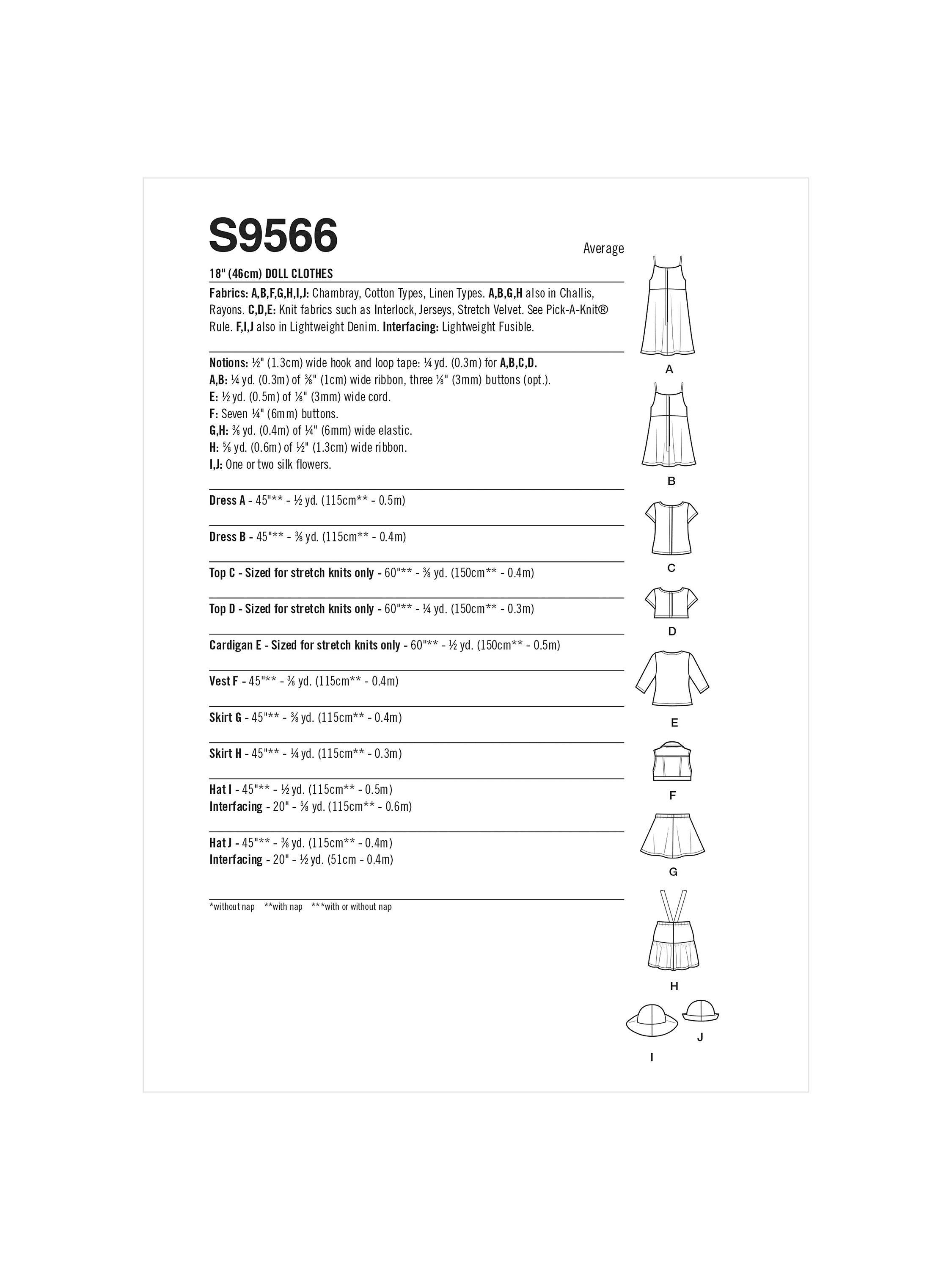 Simplicity18" (46cm) Dolls' Clothes Sewing Pattern, S9566OS