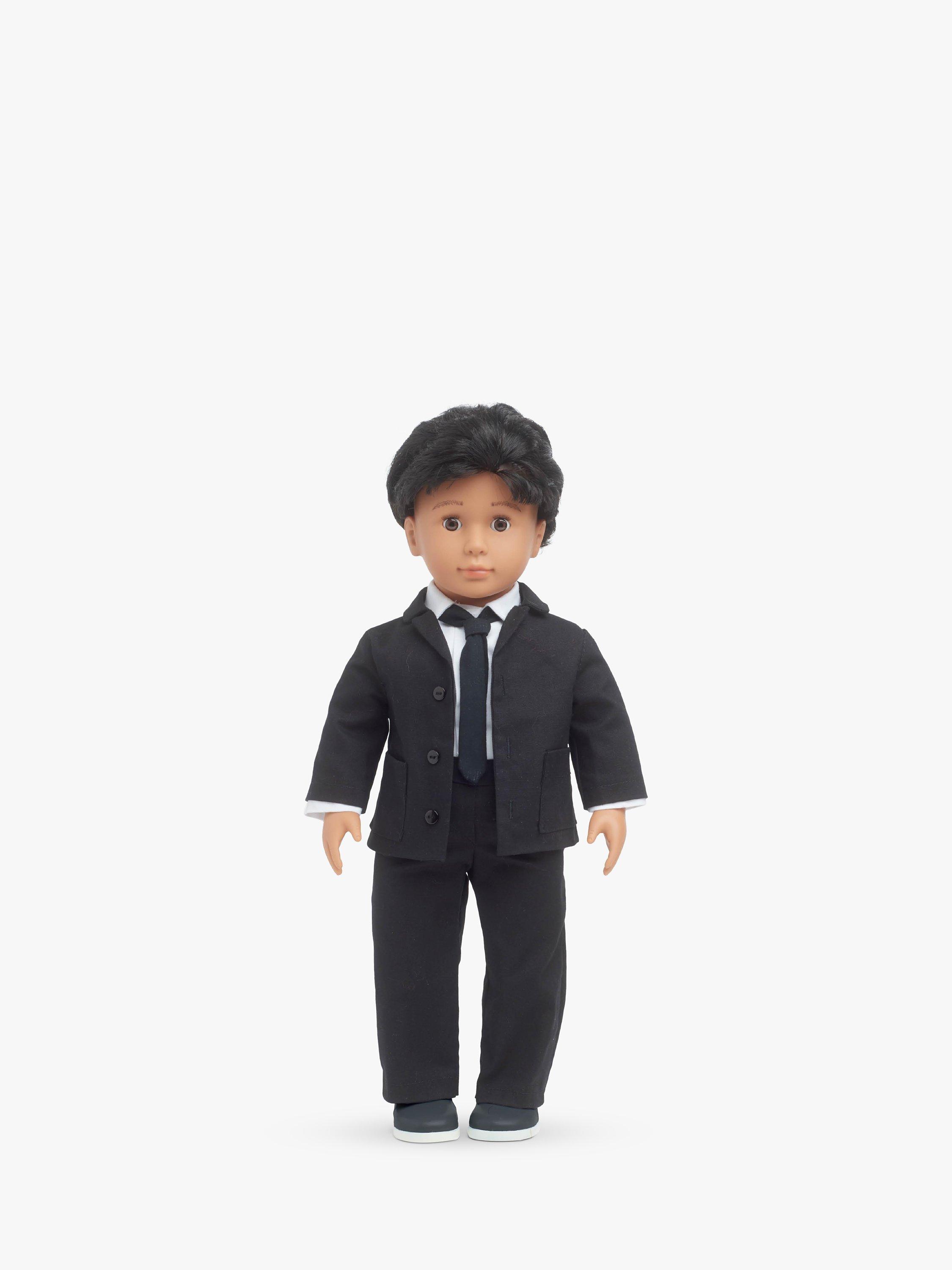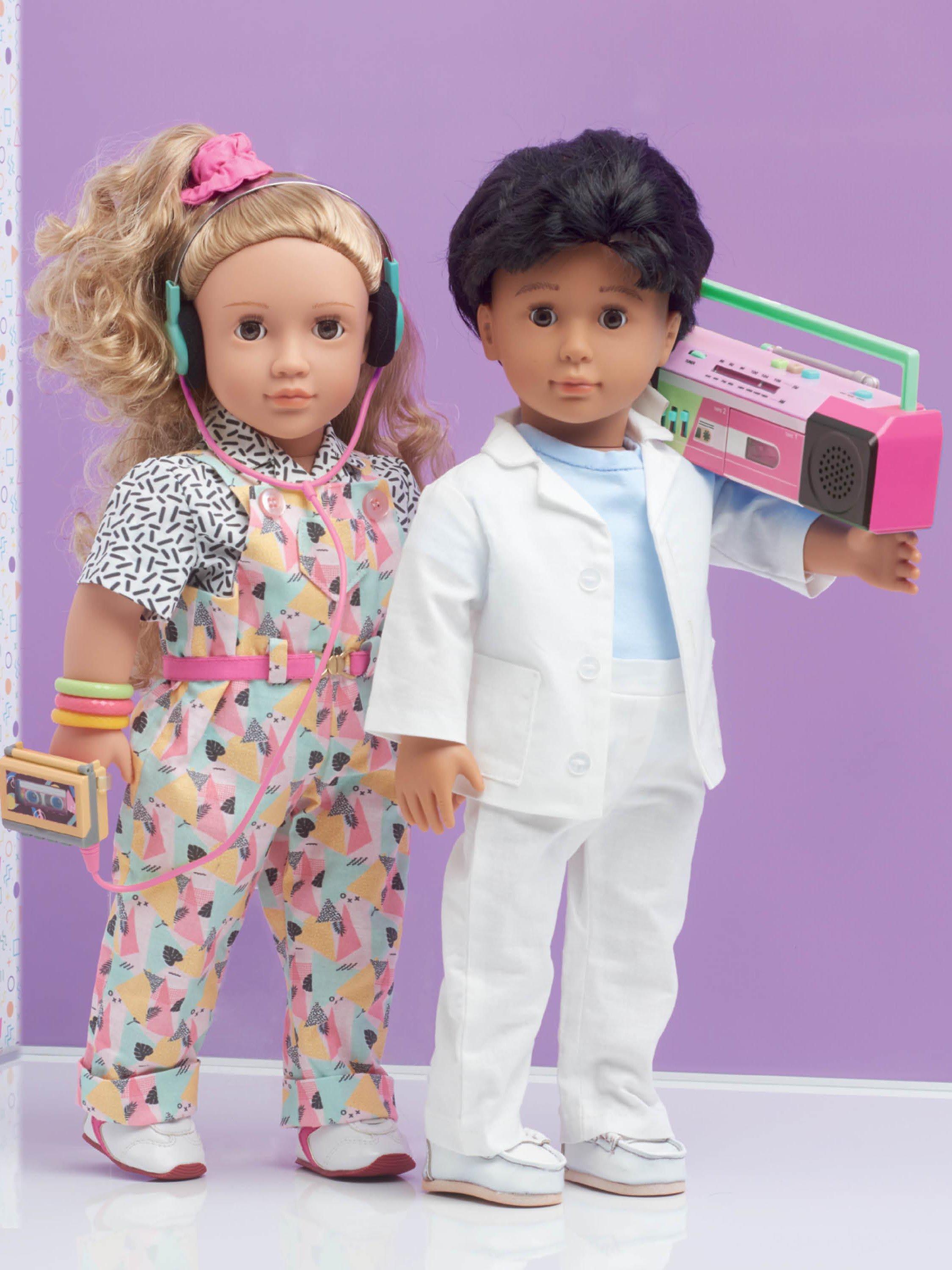 80s wardrobe for H45cm dolls includes suit with skinny tie, knit t-shirt, button front shirt with long or short cuffed sleeves, overalls with contrast belt and matching scrunchie, and prom-worthy party dress with ruffled straps and bow accent.